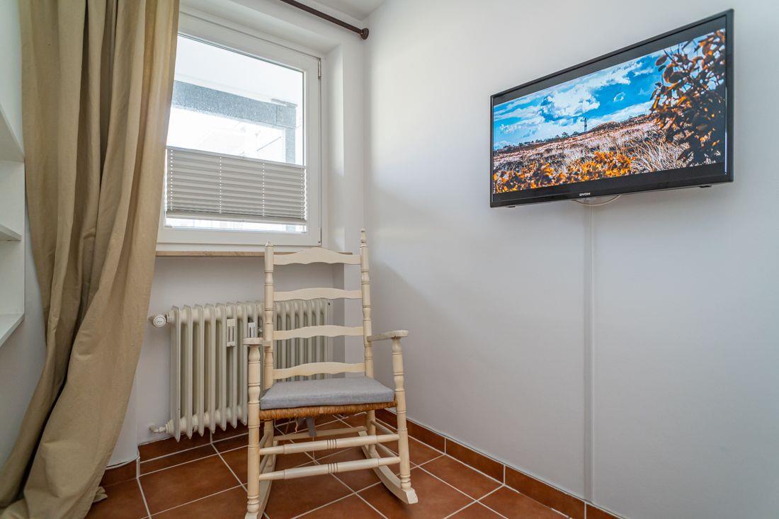 Balkon mit ganz viel Himmel- und etwas Meeresblick! Die Ferienwohnung Nr.71 liegt sehr zentral, in der 3. Etage des Ferienwohnungshaus Atlantik. Die Ferienwohnung verfügt über ein Schlafzimmer mit Kojenbett und TV, ein helles Badezimmer mit Dusche, Waschmaschine und das Wohnzimmer, welches an die Küche grenzt. Im offenen Wohn- und Essbereich steht ein TV und ein Schlafsofa, das mit wenigen, einfachen Handgriffen zu einem bequemen Doppelbett wird. Von dort aus haben Sie Zugang zum Balkon mit Gartenmöbeln und Meerblick. Die Küche ist ausgestattet mit einem Geschirrspüler, Mikrowelle und Kaffeemaschine.