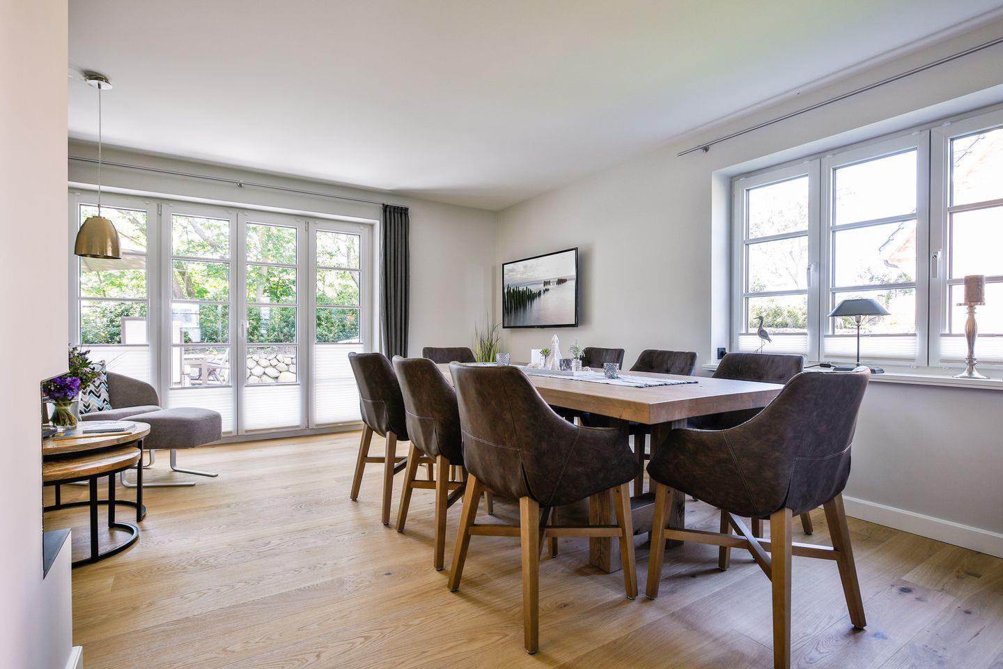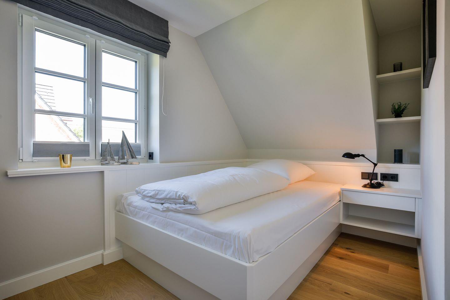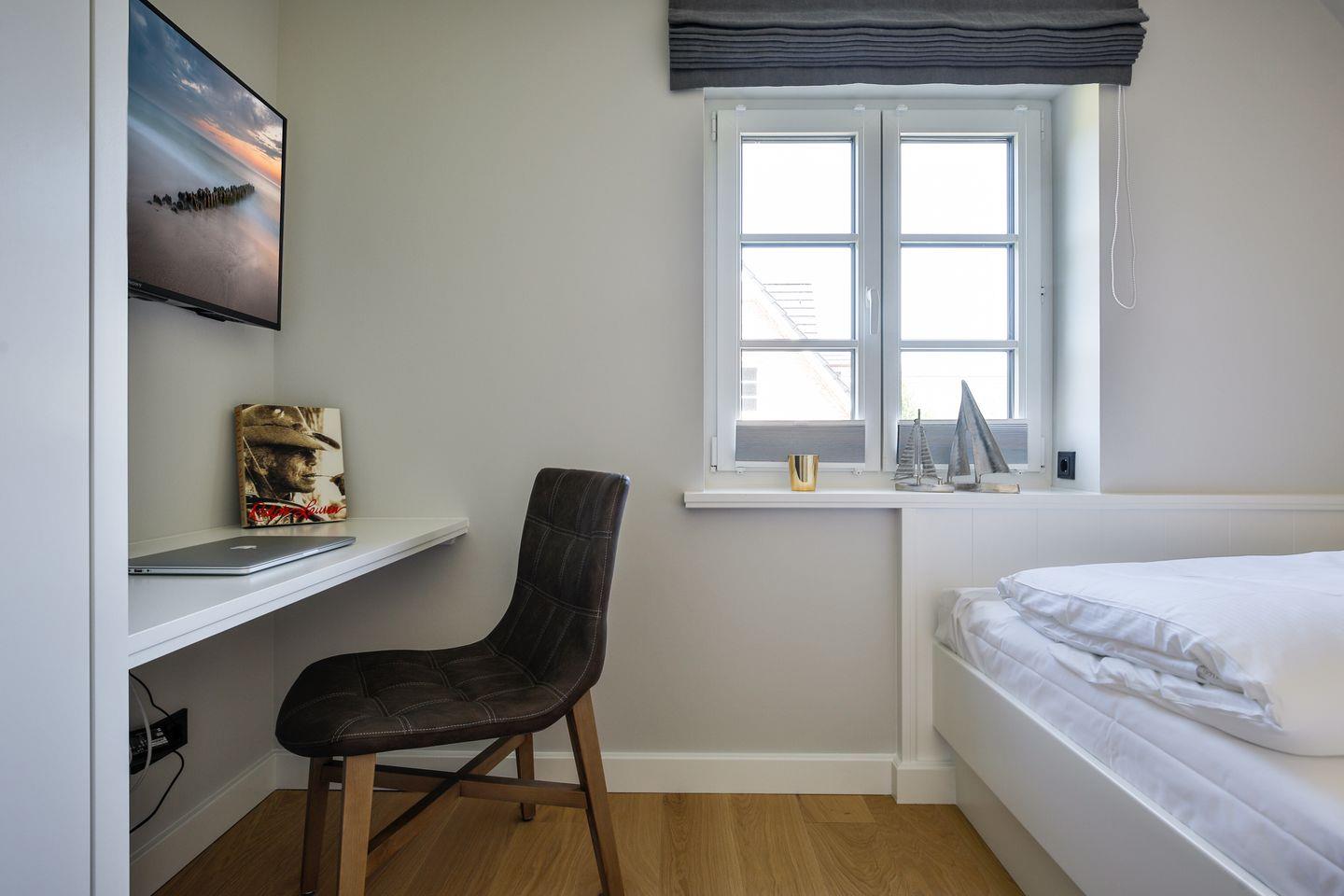 Leinen los im Ferienhaus Dock 10. Stylische Ferienhaushälfte in Westerland, nah zum Strand und in die Stadt. Im Erdgeschoss befindet sich ein helles Wohnzimmer mit großem Esstisch, Gas-Kamin, gemütlicher Couchecke, offener Küche und ein Gäste-WC. Über eine Treppe gelangen Sie in das Obergeschoss. Auf dieser Ebene liegt ein Schlafzimmer mit Boxspringbett (180x200 cm), ein Schlafzimmer mit französischem Doppelbett (140x200 cm) und ein Badezimmer mit Handtuchwärmer, WC und bodentiefer Dusche.