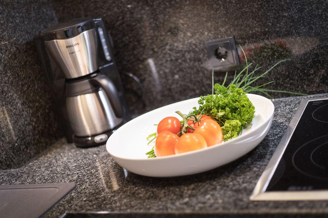 Die Ferienwohnung verfügt über ein gemütliches Wohnzimmer, ein großzügiges Tageslichtbad mit bodengleicher Dusche und eine offene Küche mit gehobener Ausstattung. Das Schlafzimmer bietet ein komfortables Doppelbett (160x200), sowie einen geräumigen Kleiderschrank.