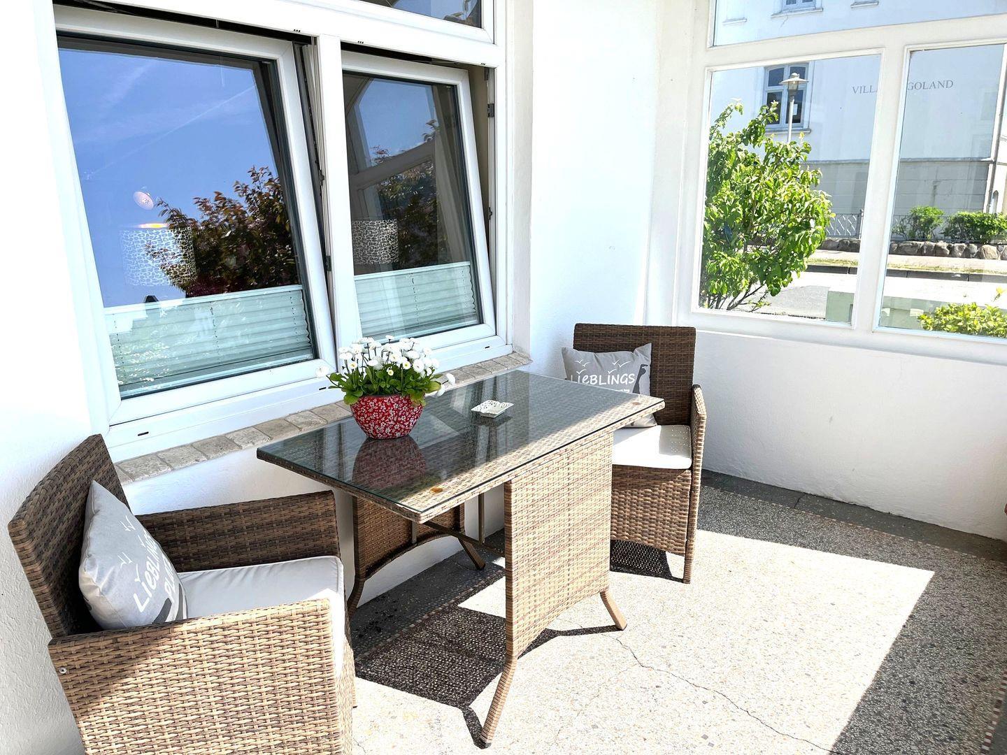 Zu dieser Wohnung gehört die Veranda, neben dem Haupteingang der Villa Frische Brise. Hier können Sie morgens bei einem Frühstück den Urlaubstag beginnen.