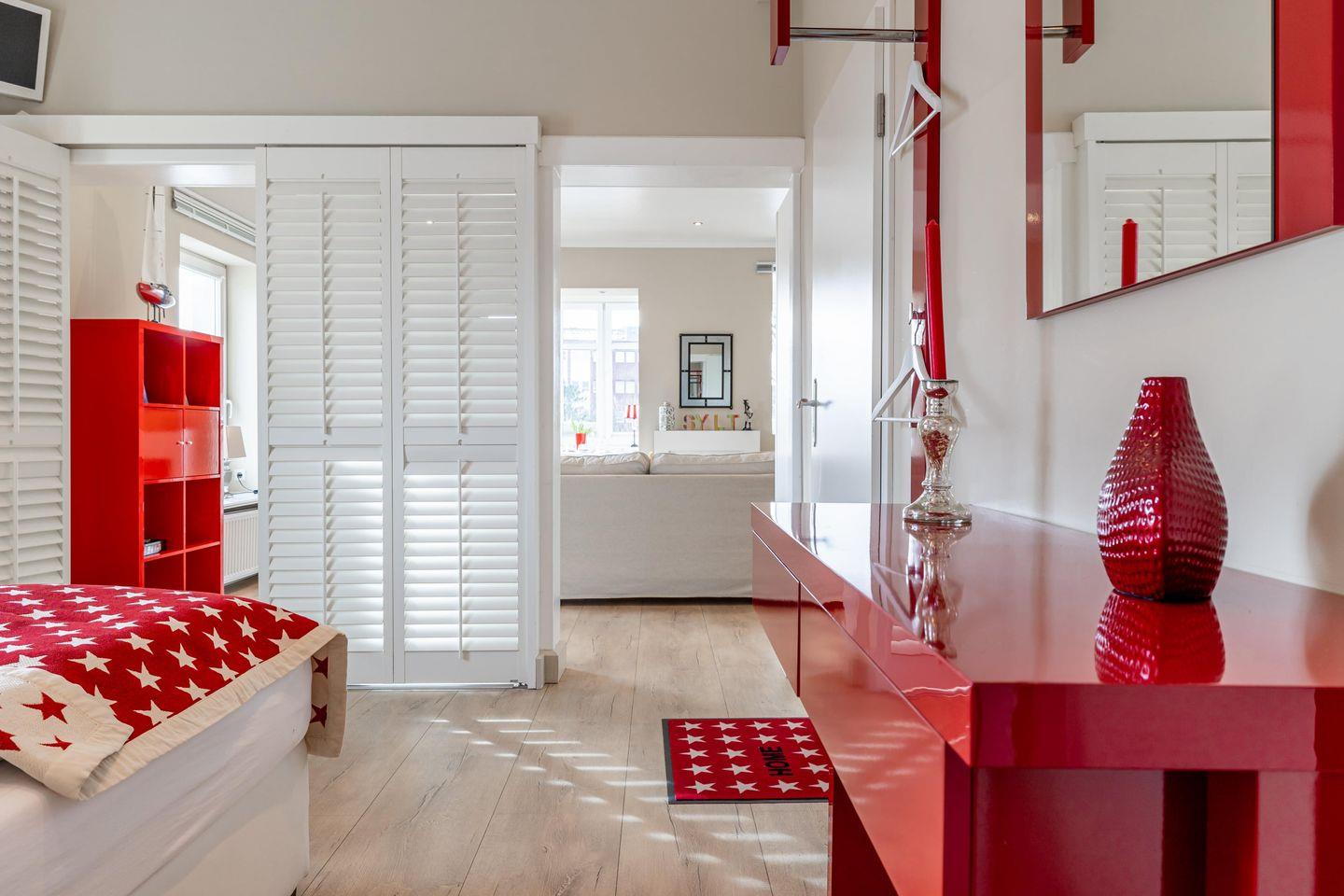 Die lichtdurchflutete, in rot und weiß eingerichtete Wohnung wurde offen und loftartig gestaltet. Neben dem Schlafzimmer mit Boxspringdoppelbett (2×80 cm x 200 cm) befindet sich das großzügige Wohnzimmer mit einem 50 Zoll Smart TV, einem elektrischen Kamin und zwei Sofas. Durch einen Raumtrenner können Sie ganz leicht das Schlafzimmer vom Wohnraum trennen.