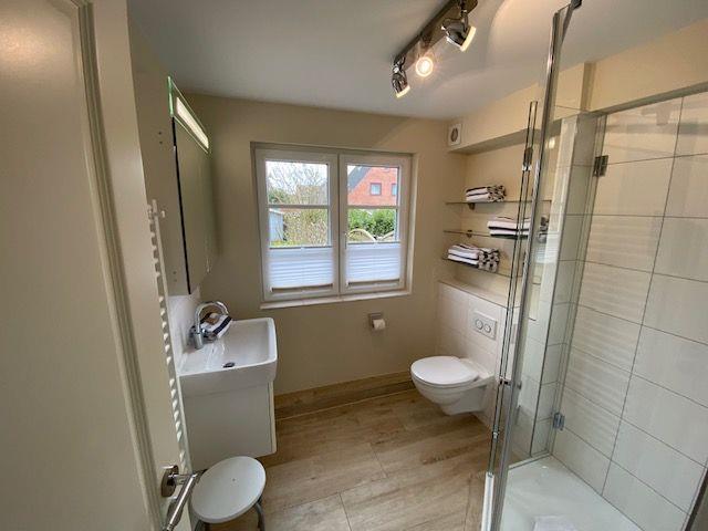 Das moderne Badezimmer hat eine fast bodentiefe Dusche, Waschbecken mit Unterschrank und WC. Angrenzend befindet sich ein zusätzliches Gäste WC. Vom großzügigen Flurbereich gelangen Sie in das Einbettschlafzimmer, in den begehbarem Kleiderschrank und in die begehbare Garderobe.