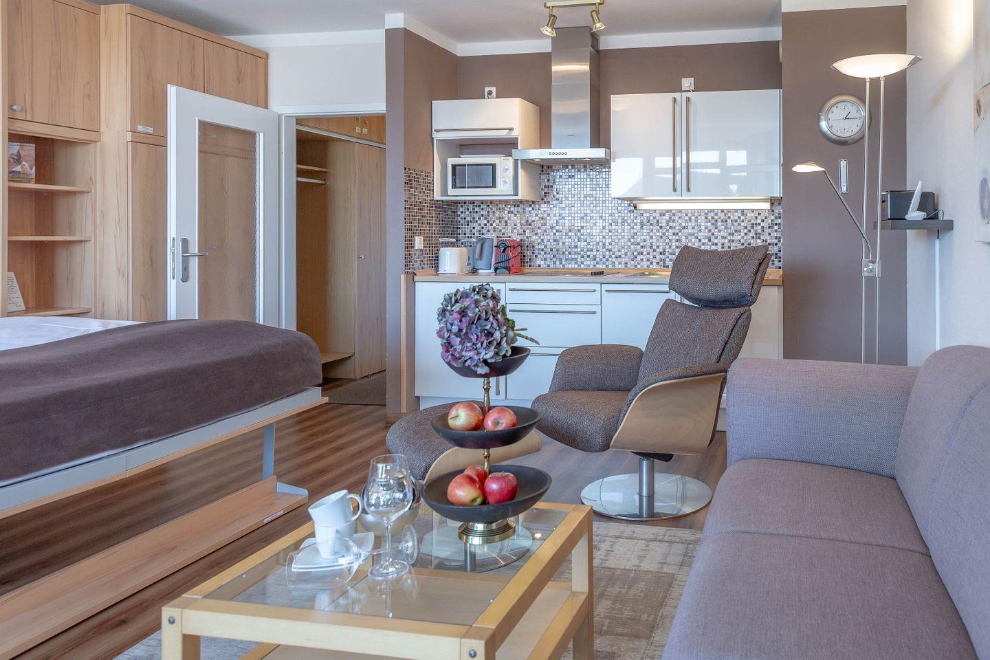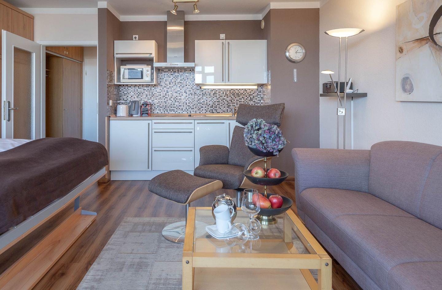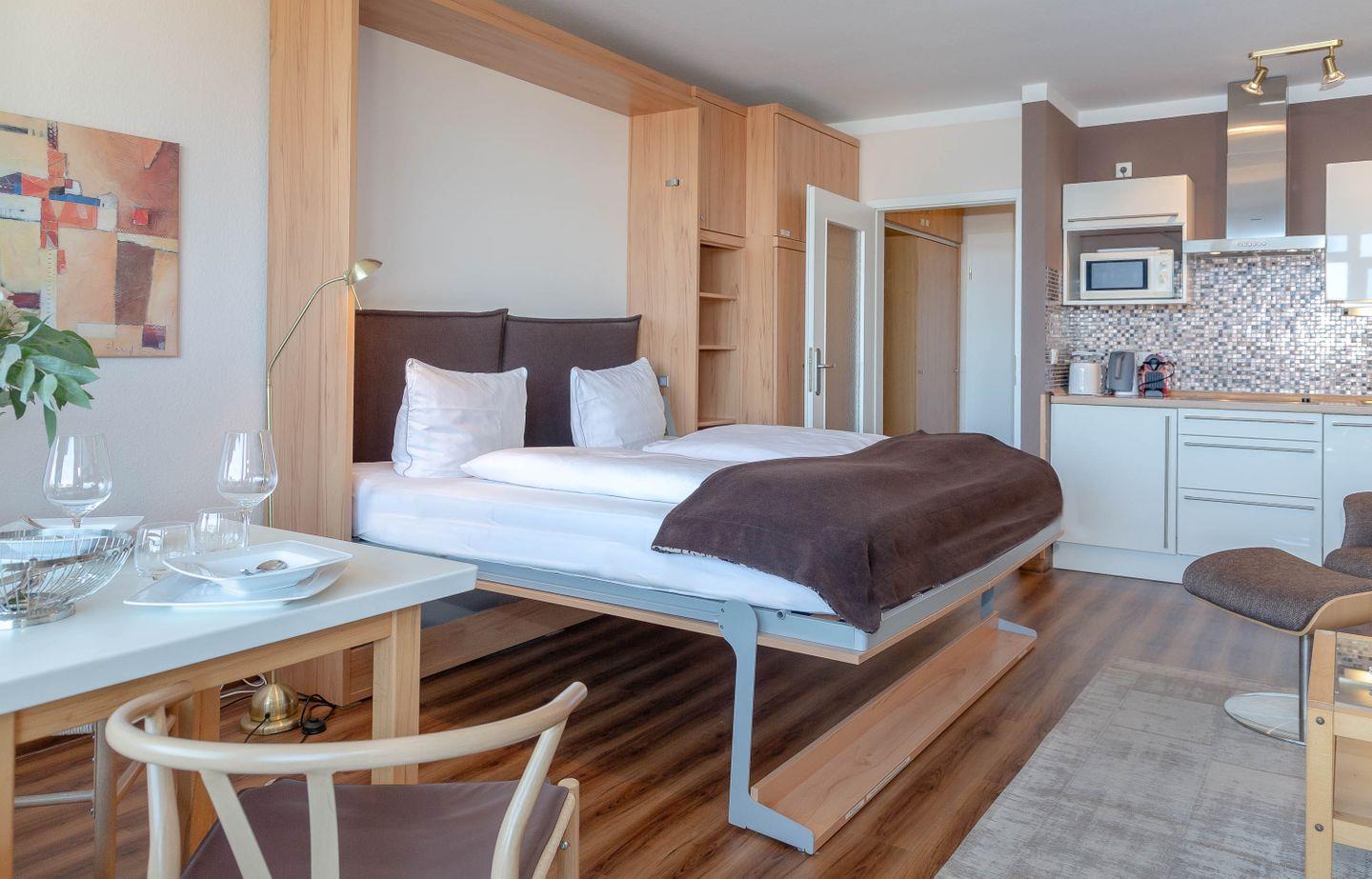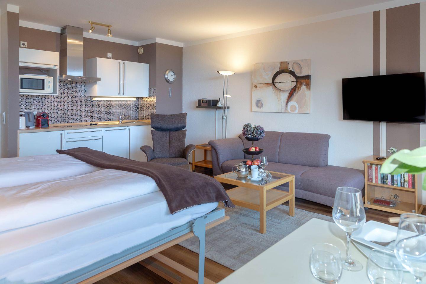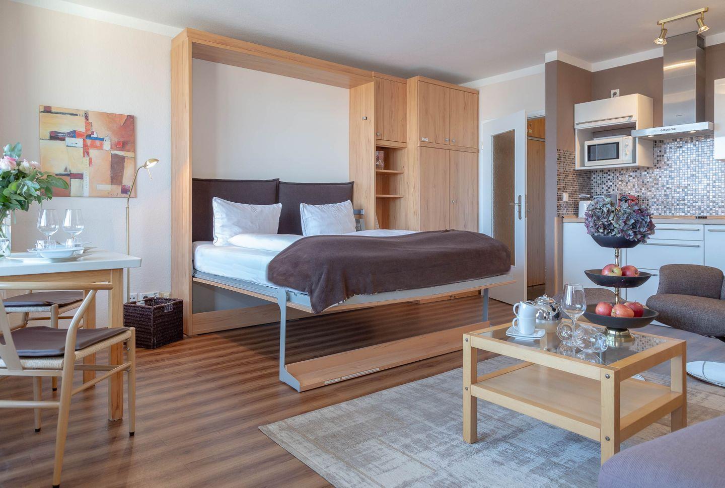 Haus Ornum, Viktoriastraße 1-3, 2. OG, App. 17. Schickes, ruhiges 1-Zimmer Appartement für 2 Personen im 2. Obergeschoss mit Fahrstuhl, möblierter Balkon nach Osten. Wohn- Küchenbereich mit Esstisch am Fenster, großes Doppelbett als Schrankbett.