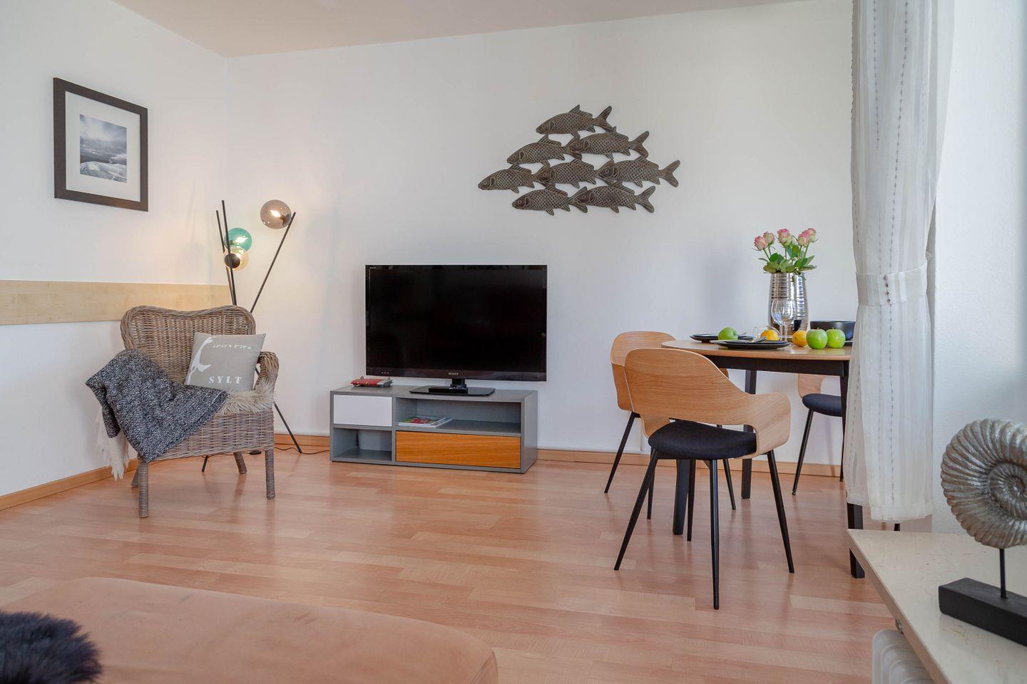 Diese 2-Zimmerwhg. im ruhigen Teil der Stadt, bietet Platz für 3 Personen. Die moderne Ausstattung, die ruhige Lage mit kurzer Distanz zur Stadt und dem Strand (ca. 7-10 Minuten zu Fuß) sowie ein kostenloser PKW Stellplatz am Haus bietet alles, für einen gepflegten Sylt Urlaub. Die Wohnung ist mit hellem Laminatboden ausgelegt. Schlafzimmer für 2 Pers. (Doppelbett), sep. kompl. Küche (GS), neues Duschbad, heller Wohnraum mit neuem Schlafsofa für die 3. Person. Westbalkon mit Option auf Nachmittagssonne.