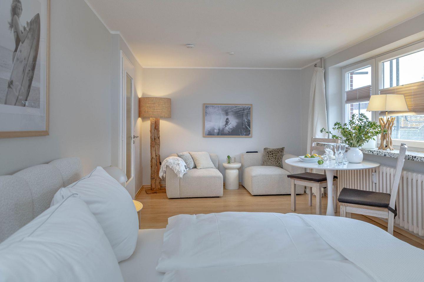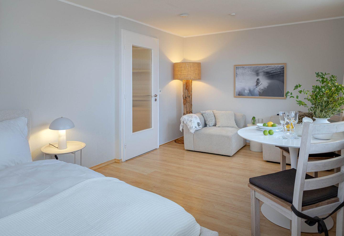 Modernes 1-Zimmer-Appartement "Dünengöre" direkt am feinsandigen Strand von Westerland, perfekt für entspannte Tage zu zweit.