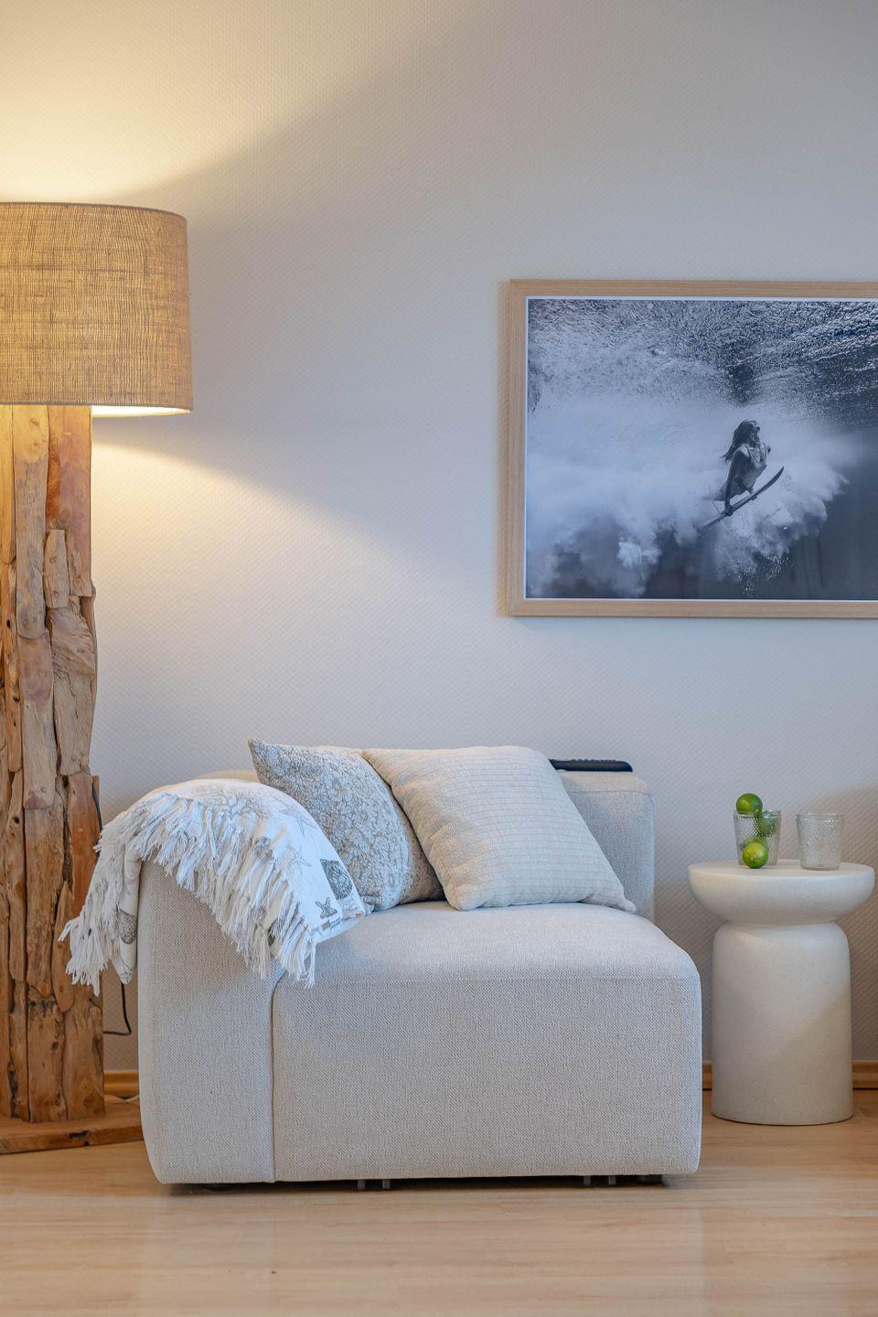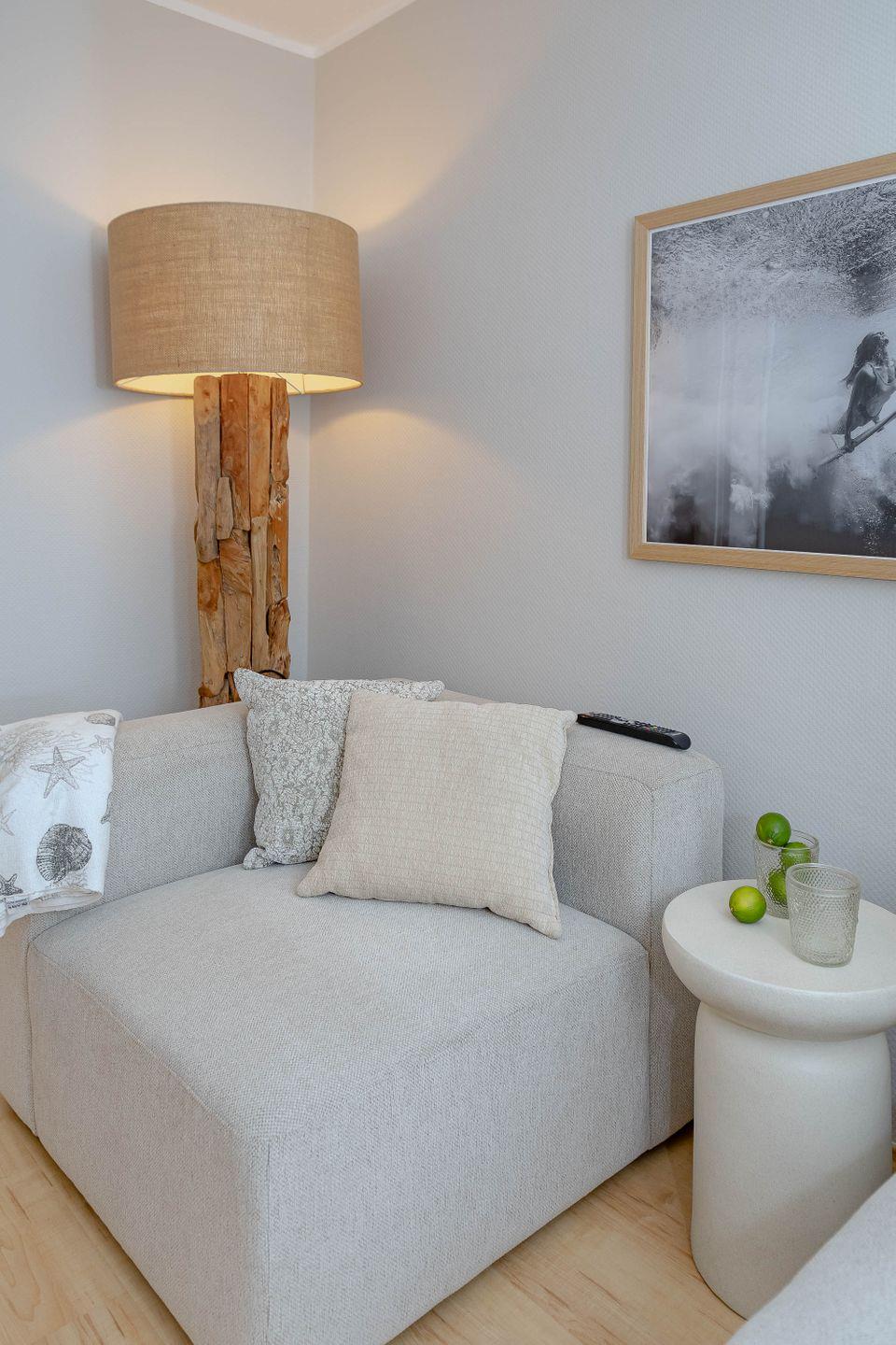 Das komfortable Bett ist mit einem hochwertigen Bouclé-Stoff bezogen und bietet mit 160 x 200 cm angenehmen Schlafkomfort. Zwei bequeme Modulsessel schaffen eine gemütliche Sitzgelegenheit – perfekt, um nach einem Strandspaziergang bei einem Buch oder einem Glas Wein zu entspannen.