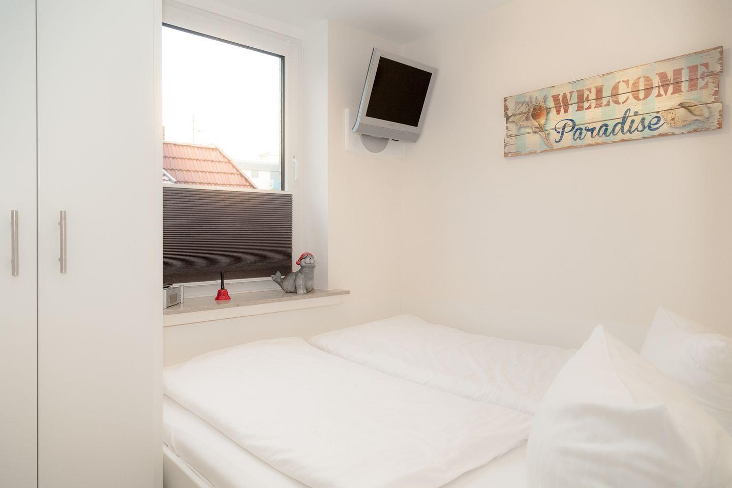 Die 1,5 Zimmerwhg. (ca. 32m²) liegt im 2. OG einer kleineren Appartementanlage in der Boysenstraße 5, nur wenige Augenblicke vom direkten Stadtkern, der Friedrichstraße, dem Strand und dem Bahnhof entfernt. Hier erwartet Sie ein Top Domizil. Heller Wohnraum in BEACH HOUSE Optik, mit Westbalkon, Designboden in cooler, grauer Holzkistenoptik. Flat TV (Kabel), Stereo Anlage und DVD sind selbstverständlich vorhanden. Ebenso eine komplett ausgestatte living-room-kitchen mit Geschirrspüler und Mikrowelle, sowie eine Essecke. Sep. Schlafraum mit Doppelbett mit einem 2. Flat-TV. Tolles modernes Bad der Spitzenklasse mit Granitboden, Vollglasdusche und Fußbodenheizung. Sanitäreinrichtung von P. STARK. Kleiner Safe. Zu dieser Wohnung gehört ein PKW Stellplatz in der Garage (DUPLEX - oben). Waschküche im Haus mit Münz-Waschmaschine und -Trockner. Fahrstuhl im Haus.