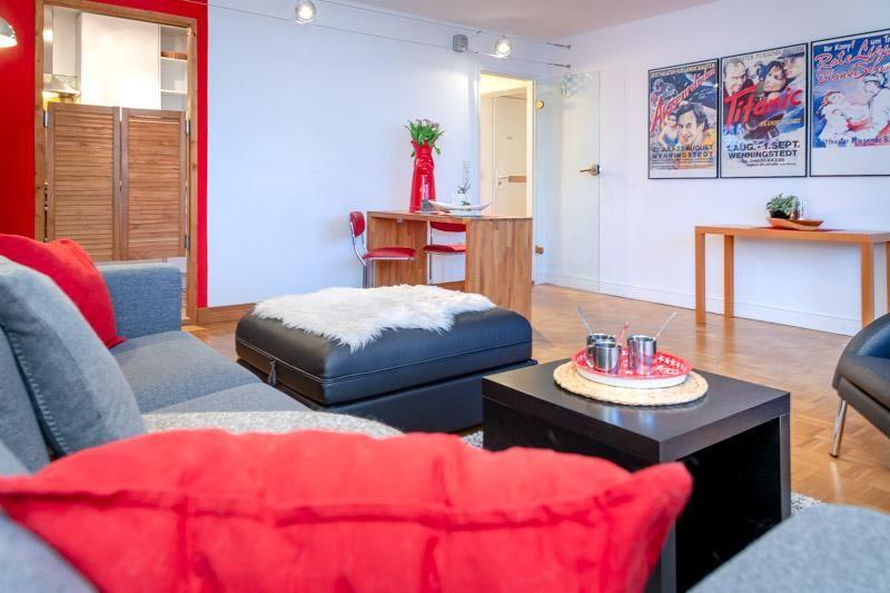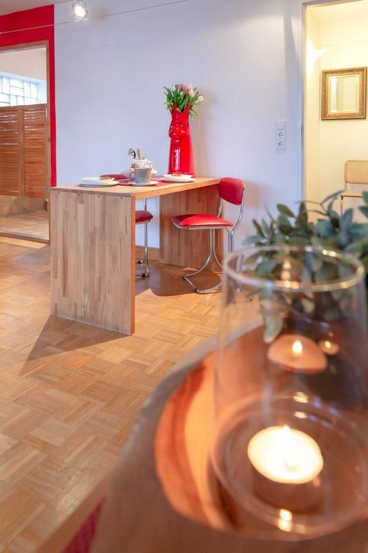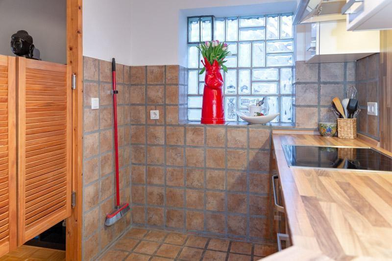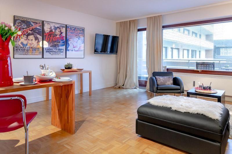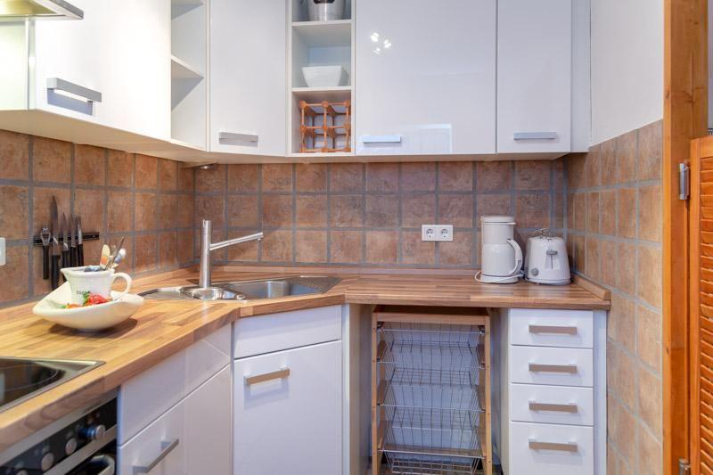 Hier wurde alt und neu gemixt. Bei ca. 50m² Wohnfläche hat der helle große Wohnraum mit sep. Küche den größten Anteil. WZ mit Parkettboden , Sofa- / und Essecke, Flat TV, Balkon (Nord), separater Küchenbereich (Backofen, kein GS). Schlafzimmer mit festen Doppelbett (180x 200) und Schrankwand. Das Bad wurde, wie die Küche komplett saniert. Der kleine Badezimmerbereich wurde geschickt ausgebaut. Im Haus: Fahrstuhl, Waschküche (Münzautomaten).