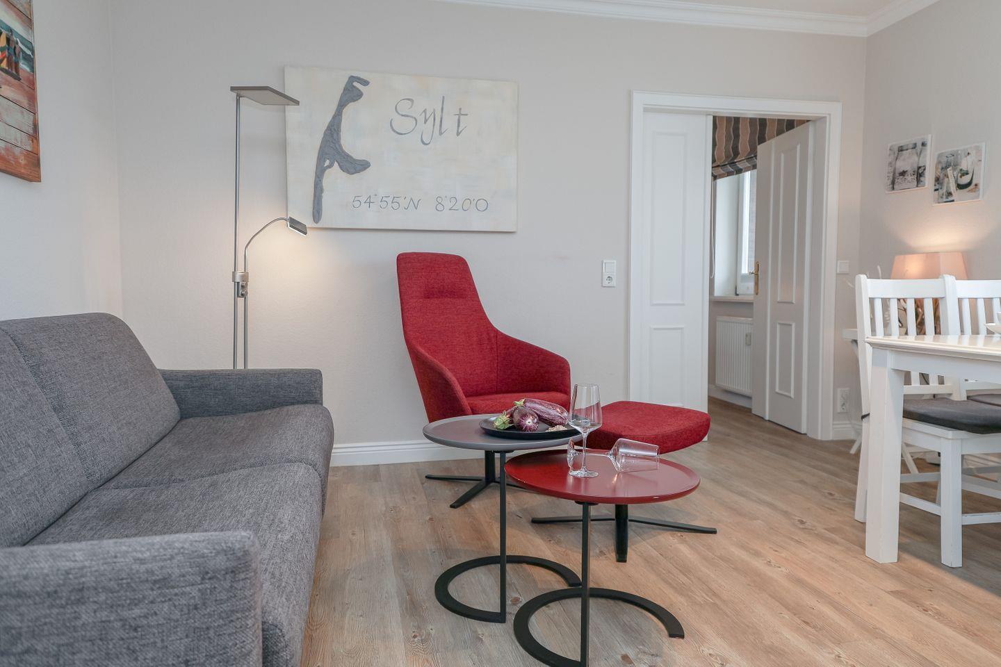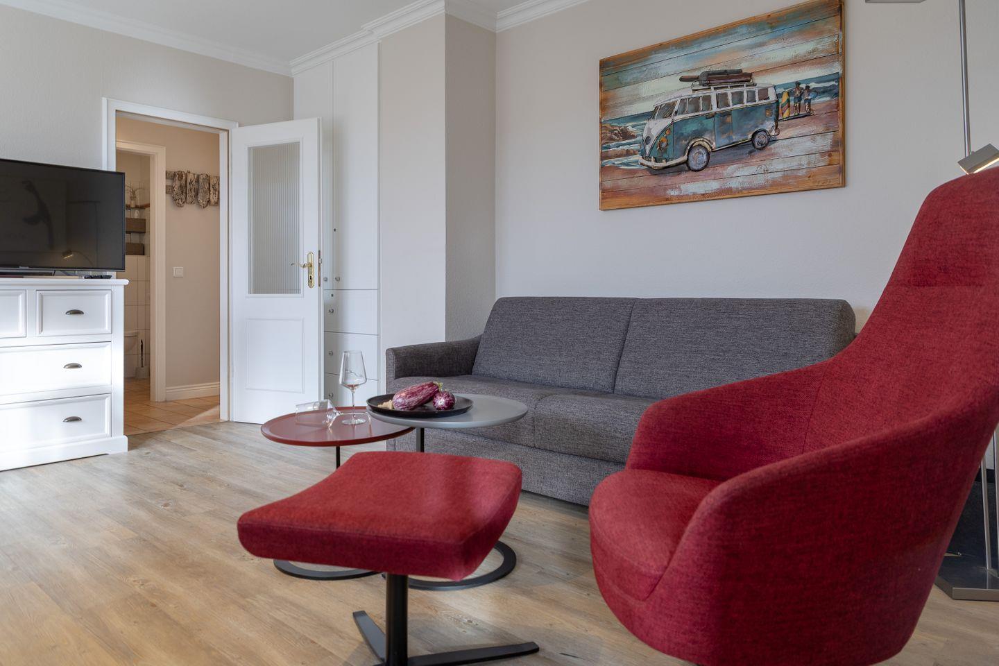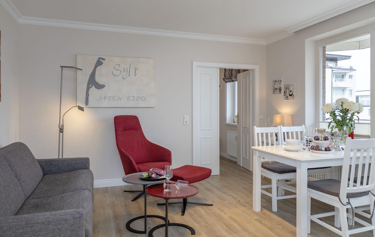 Moderne 2-Zimmerwohnung mit Südbalkon in direkter Strandlage in Westerland, ideal für erholsame Urlaubstage an der Nordsee.
