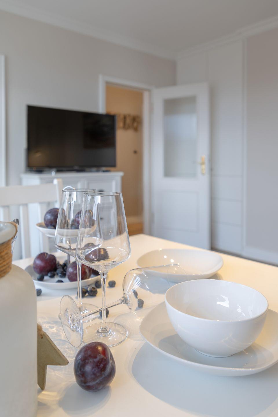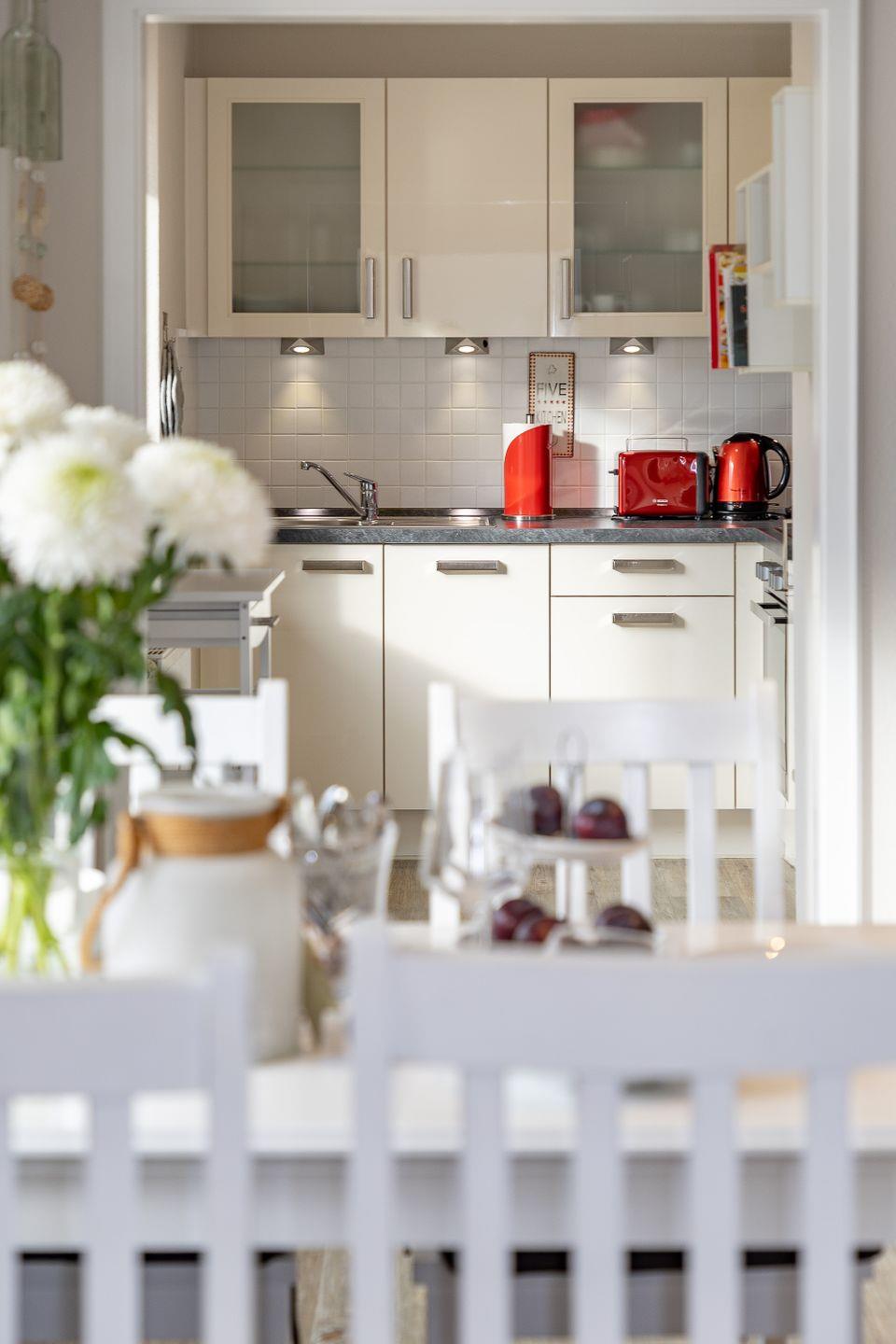 Die Wohnung befindet sich im zweiten Stock und besticht durch ihr offenes Raumkonzept, das helles Licht und eine gemütliche Atmosphäre schafft. Der großzügige Wohnbereich ist mit einer hochwertigen Couch ausgestattet und bietet einen Fernseher für entspannte Abende. Die voll ausgestattete Küche schließt sich direkt an das Wohnzimmer an und verfügt über moderne Annehmlichkeiten wie einen Backofen, eine Mikrowelle und eine Spülmaschine – ideal für Familien oder Freunde, die unabhängig kochen möchten.