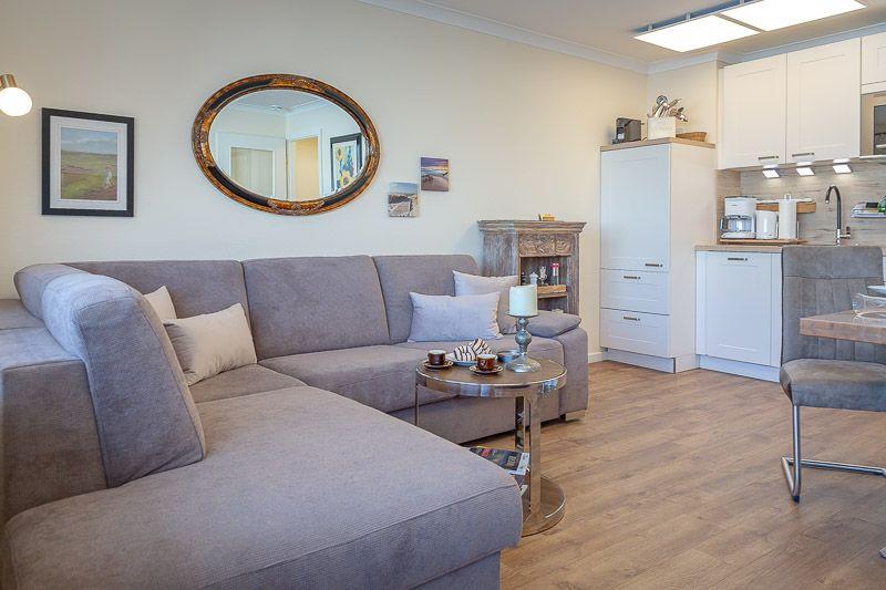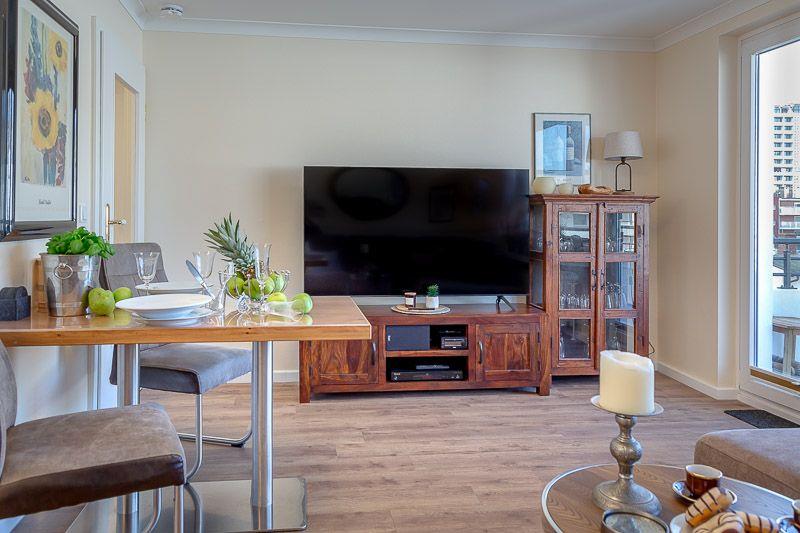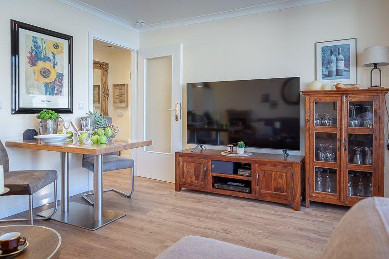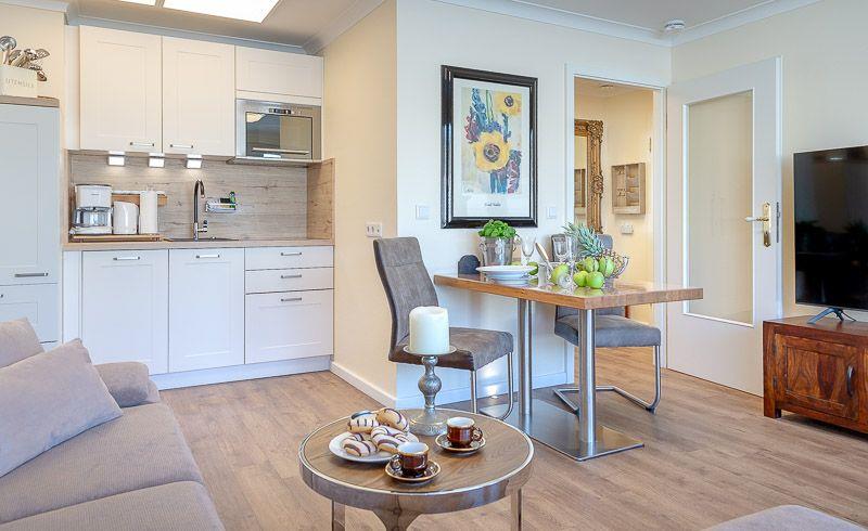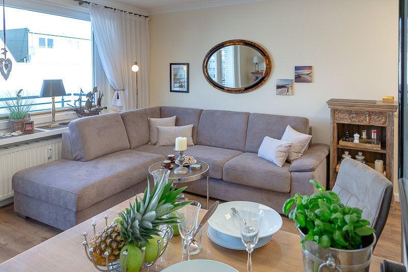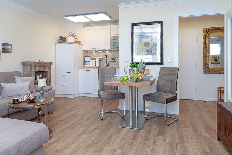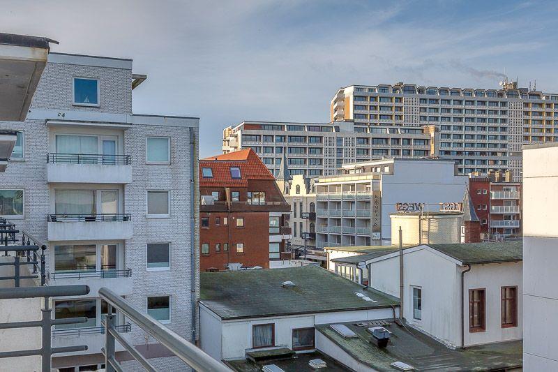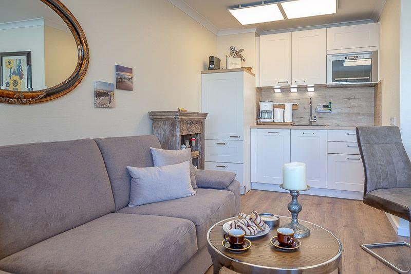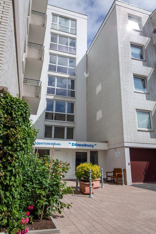 Westerland, Elisabethstraße, Haus Dünenburg - 50 Schritte bis zur Friedrichstraße, Fahrstuhl von Garagenebene bis App., Balkon mit Blick über die Dächer der Innenstadt, Einzelgarage mit elektrischem Torantrieb, Internet/50 Mbit. In 2019 komplett saniert und geschmackvoll eingerichtet. Die moderne 2-Zi.-Wohnung in bester Lage von Westerland mit kurzfristiger Erreichbarkeit von Strand und City bietet komfortablen Platz für 2 Personen. Das App. befindet sich in der 4. Etage des Appartementhauses Dünenburg in der Elisabethstr. 9. Auf insgesamt 36 qm finden Sie hier allen Komfort für einen schönen Urlaub. Die topmoderne, komplett ausgestattete Nolte-Küche bietet alles für den gehobenen Anspruch. Neben ausreichend Gläsern und Geschirr erledigt die kleine Geschirrspülmaschine den Abwasch (Tabs sind mitzubringen). Die Küchentischplatte ist neu und aus cm-dicker Eiche und bietet großzügig Fläche zum Essen und Arbeiten. Das neue, gemütliche Eck-Loungesofa bietet genügend Platz für Muße & Entschleunigung. Des weiteren bietet es, als Option neben dem Schlafzimmer, eine einfach ausklappbare Schlaffläche mit einer 130cm breiten, vollwertigen Matratze, so dass die 2. Person sich ggf. nachts separieren kann und Sie sich nicht gegenseitig durch Schlafgeräusche stören. Neben dem 65 Zoll Smart TV ist freies WLAN für Gäste in dieser Wohnung selbstverständlich. Ebenso wie eine Netzwerksteckdose für alle Kabelkinder. Der nach Nord/Osten ausgerichtete Balkon (Garten/Balkonmöbel vorhanden) bietet sich im Sommer mit Morgensonne zum Frühstücken an. Im Schlafzimmer befinden sich ein gemütliches Doppelbett (2 Matratzen á 90 x 200cm) sowie ein weiterer TV. Bad mit fast bodentiefer Dusche. Föhn, Safe und Stauraum sind vorhanden. Auch bei Regen bleiben Sie trocken, da Sie direkt aus der Garage ins Treppenhaus gelangen. Gepäck und Einkäufe haben so kurze Wege. Sie erreichen das App. sowohl über das Treppenhaus als auch über den ebenerdigen Fahrstuhl, der Sie innerhalb des Hauses von der Garagen-/Eingangsebene zur Whg. (4.OG-ohne Übermieter) bringt. Die private Garage erlaubt es Ihnen, ihr Fahrzeug über die Zeit stehen lassen zu können, ohne sich Sorgen um die Sicherheit und zusätzliche Parkgebühren machen zu müssen. Waschmaschine, Trockner mit Münzeinwurf sowie ein Trockenraum stehen im Keller zur Verfügung. Das kleine aber feine App. ist optimal in Platz und Raum, hat eine gute Energie und ist ideal für Urlauber, die ruhig, aber trotzdem super-zentral Wohnen möchten, Wirtschafts- u. Geschäftsreisende und Kongressteilnehmer. City, Geschäfte, Strand und die Vermietungsagentur erreichen Sie in 3 Gehminuten. Bei Buchung ab 10 Tagen ist die Leihwäsche inklusiv. Nichtraucherwohnung - Tierhaltung ist nicht erlaubt!