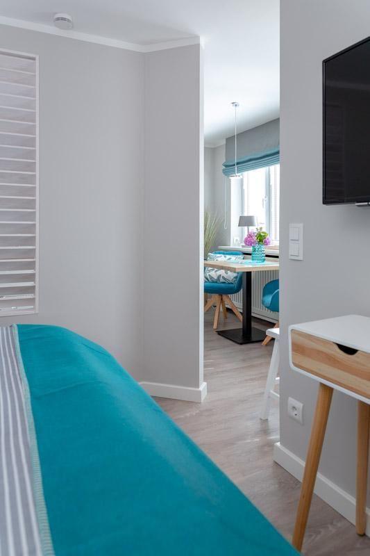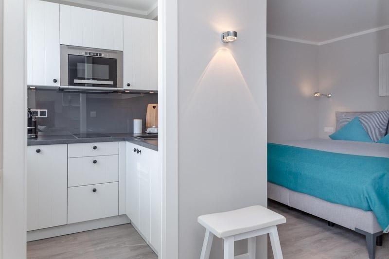 Mit einer Größe von 37 m² besticht die moderne Ferienwohnung durch ihre detailverliebte, freundliche und helle Einrichtung. Eine kleine offene Küche, ein abgegrenzter Wohn- und Schlafbereich sowie ein komfortables, helles Duschbad sind mit allen Annehmlichkeiten für einen entspannten Aufenthalt ausgestattet.
