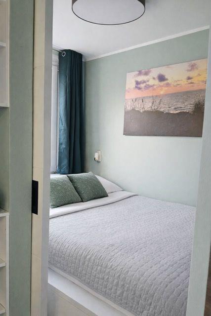 Vom Flur der Wohnung mit eingebautem Kleiderschrank gelangt man sowohl in das Badezimmer mit großer, ebenerdiger Dusche als auch in das Wohnzimmer mit integrierter Küchenzeile. Diese ist mit einem Geschirrspüler, zwei-Platten-Herd, Mikrowellen-Grill und einer Nespresso-Maschine bestens für die Zubereitung kleiner Mahlzeiten ausgestattet. Gegenüber des großzügigen Esstischs und flachen Smart-TVs befindet sich das Eckschlafsofa, das für eine dritte Person auf ca. 130x190cm ausgezogen werden kann. Die gemütliche Schlafkoje wird durch eine Schiebetür vom Wohnzimmer getrennt und das Doppelbett besteht aus zwei Einzelmatratzen mit einer Liegefläche von 160x220cm.