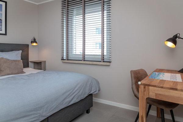 Schlafzimmer mit Boxspringbett und kleinem Schreibtisch