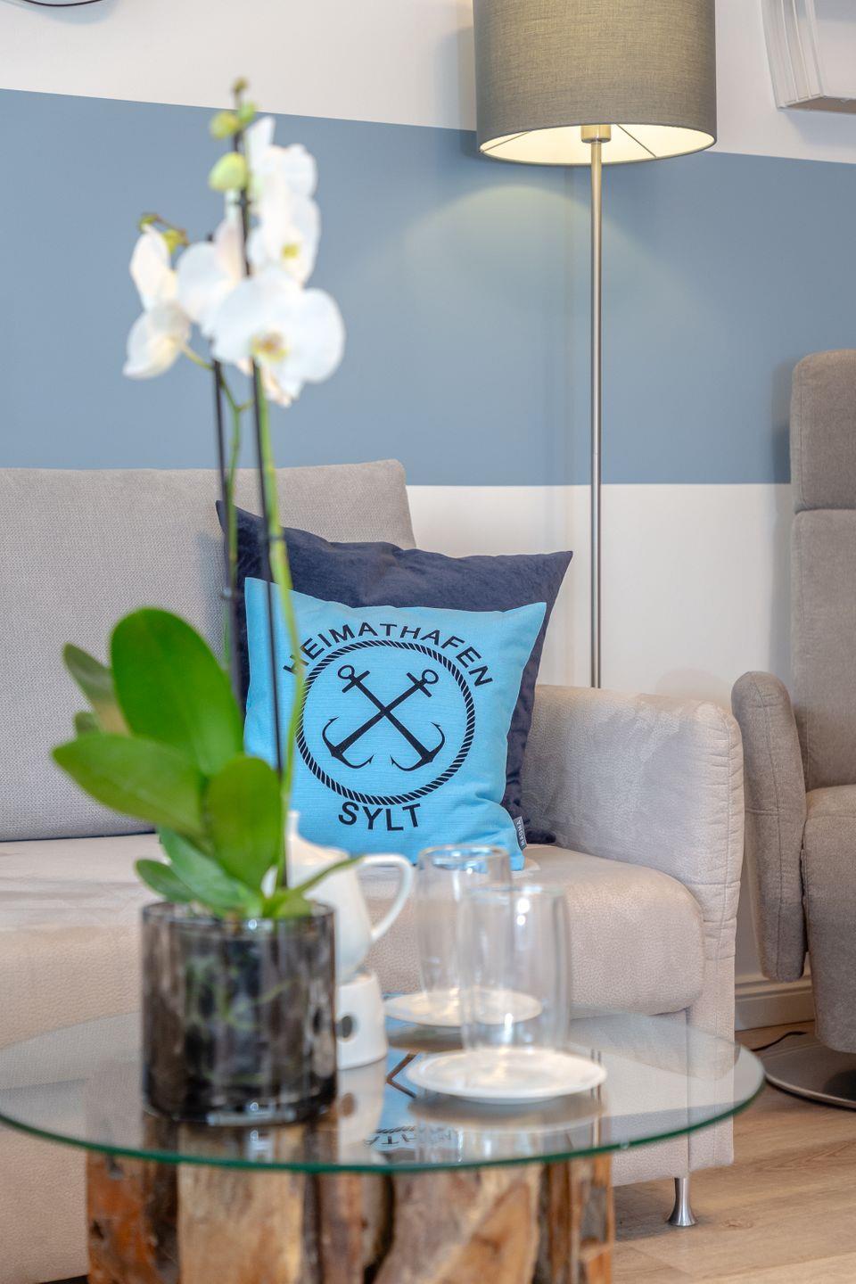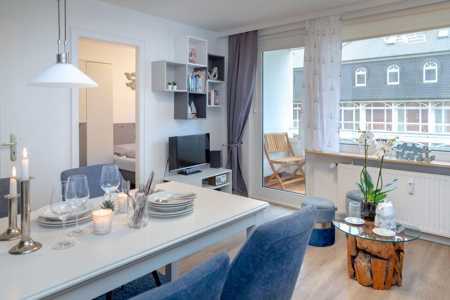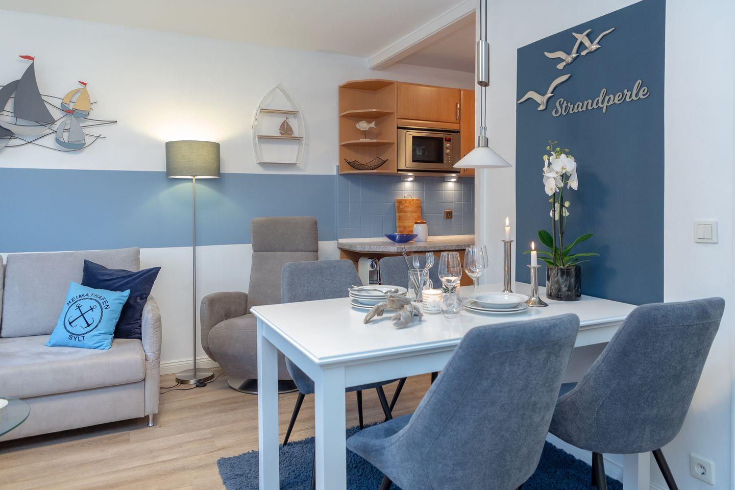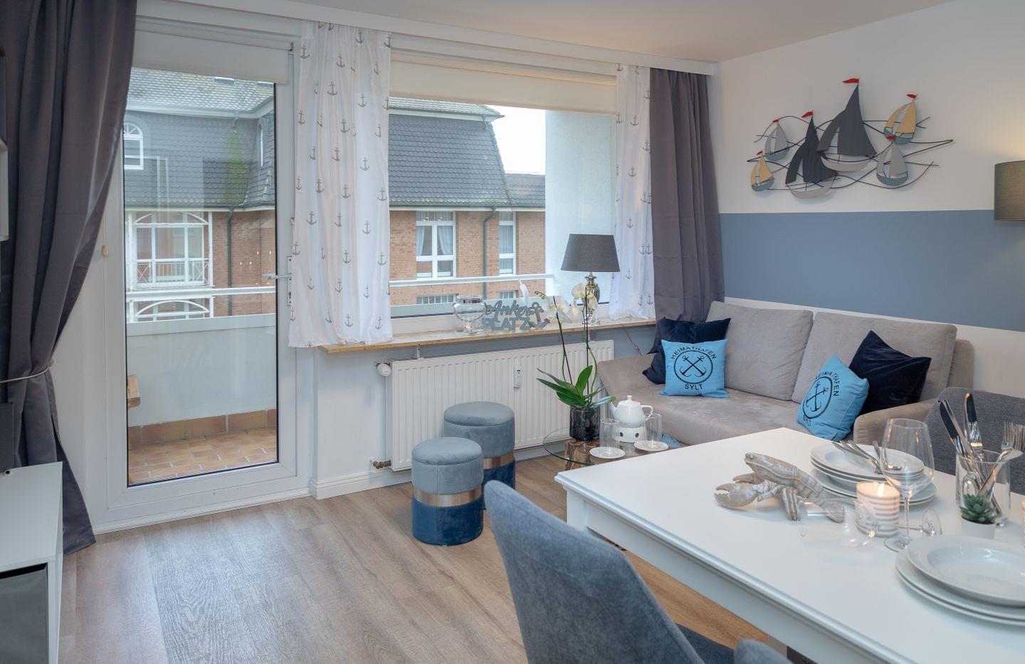 Hier finden 2-4 Personen alle Voraussetzungen für perfektes "Syltfeeling": Vom Südbalkon kann man den Blick aufs Meer mit herrlichen Sonnenuntergängen genießen. Außerdem verfügt das moderne Wohnzimmer neben dem Schlafsofa (140×200) über einen großzügigen Essplatz für 4 Personen.