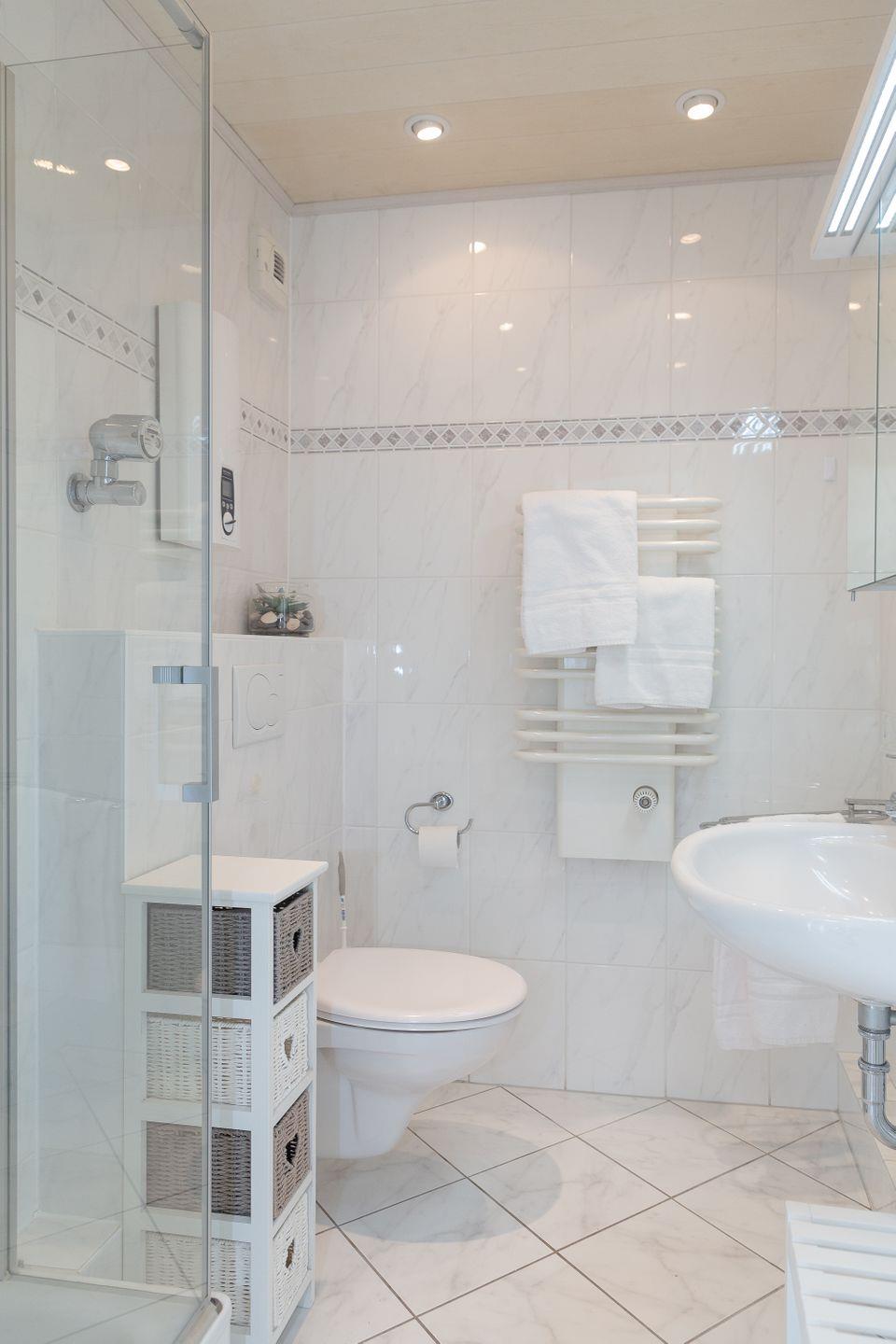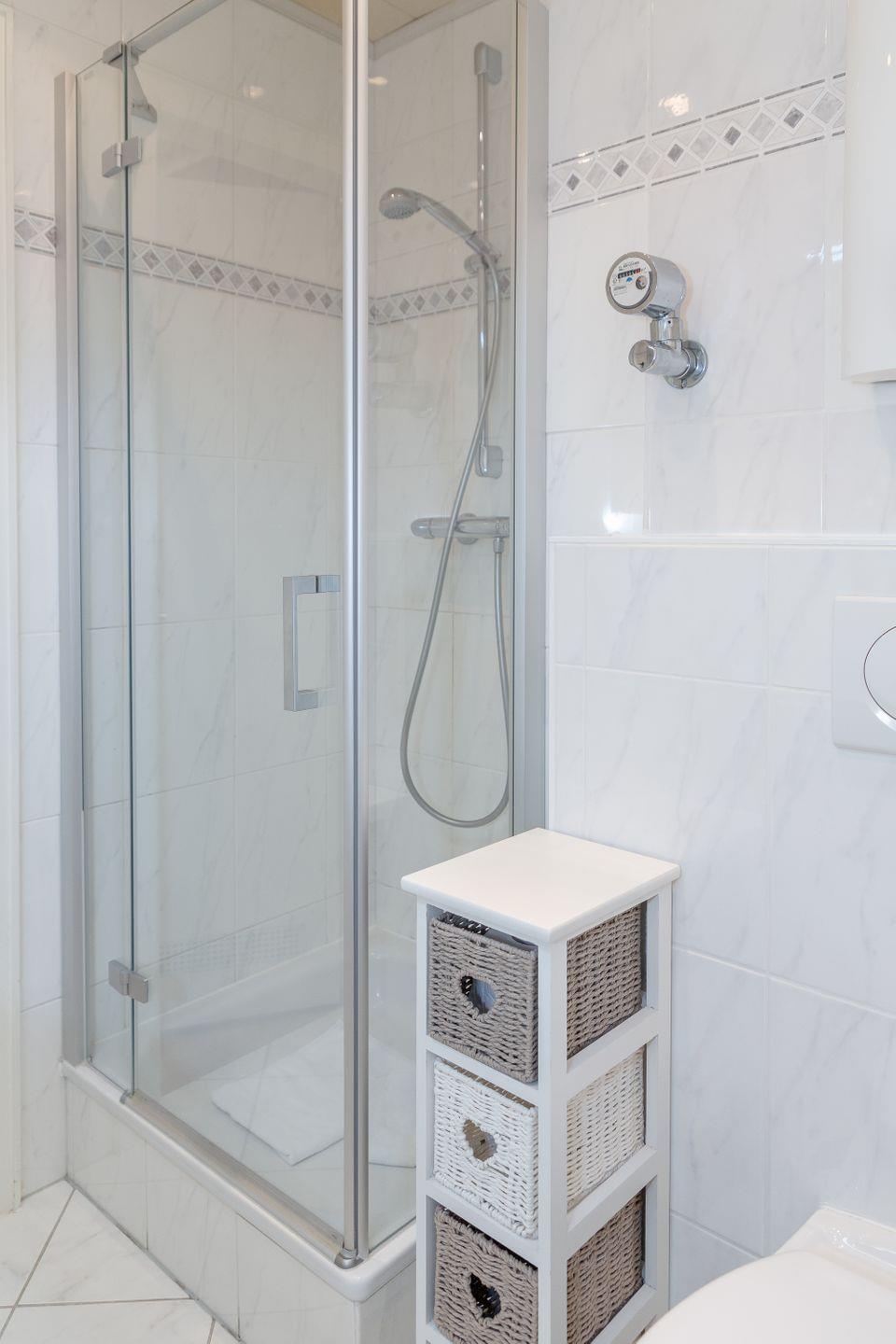 Das vom Flur abgehende, hell geflieste Duschbad komplettiert Ihr Feriendomizil.