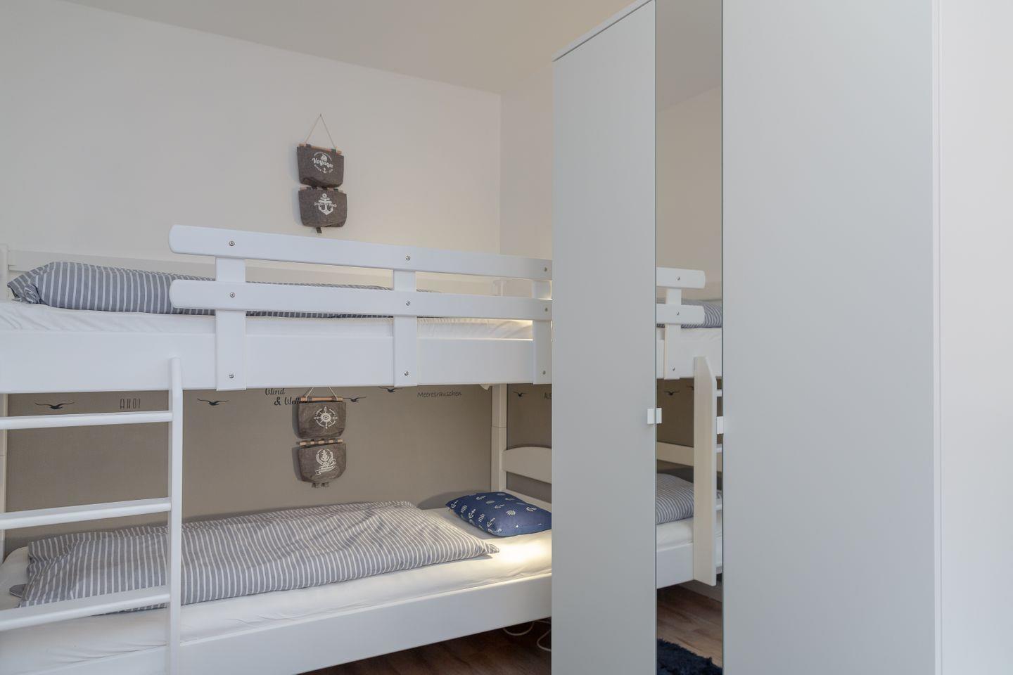 Im Schlafzimmer gibt es neben dem nagelneuen Boxspringbett (160×200) zusätzlich ein Etagenhochbett, sodass neben 2 Erw. hier noch max. 2 Kinder untergebracht werden können. Oder das untere Bett wird genutzt, um zwei getrennte Schlafplätze für 2 Erw. zu erhalten.