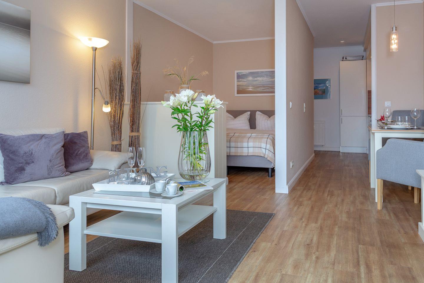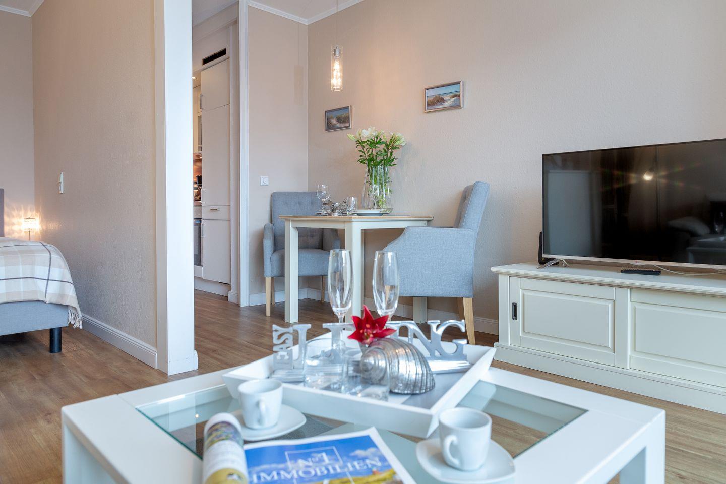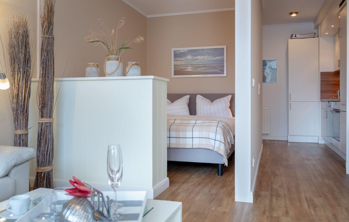 Westerland, Friedrichstraße, direkt am Strand. Optimale, zentrale und strandnahe Lage in Westerland für 2 Personen. Die hübsche Wohnung liegt in der 1. Etage einer top gepflegten Wohnanlage in der Friedrichstraße nur wenige Meter vom Westerländer Hauptstrand entfernt. Die Wohnung ist im modernen, frischen Stil eingerichtet. Neue Küche im Eingangsbereich (MW,GS) Schicker Designboden in Holzoptik. Moderne, teilweise in 2014 erneuerte Möbel. Duschbad. Abgetrennter kuscheliger Schlafbereich Bockspringbett (160x 200). Der sonnige Südbalkon mit seinen modernen Gartenmöbeln lädt zum Relaxen ein. Hier stimmt das Gesamtpaket. Zu dieser Wohnung gehört ein PKW Stellplatz in der Garage. Fahrradabstellmöglichkeiten befinden sich ebenfalls in der Garage. Im Haus: Fahrstuhl, Waschküche mit Münzautomaten.