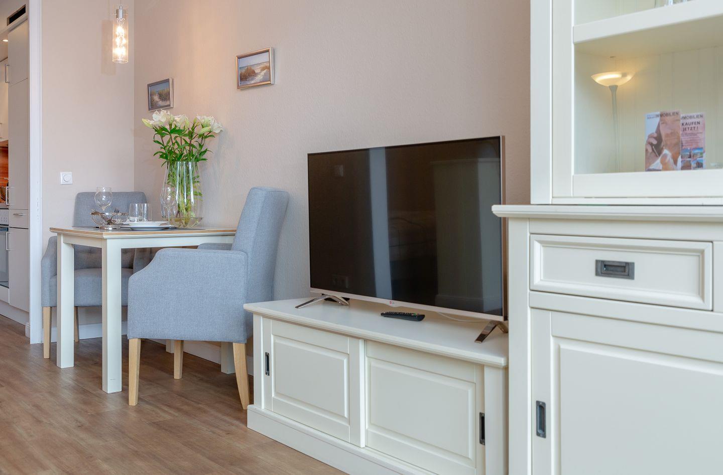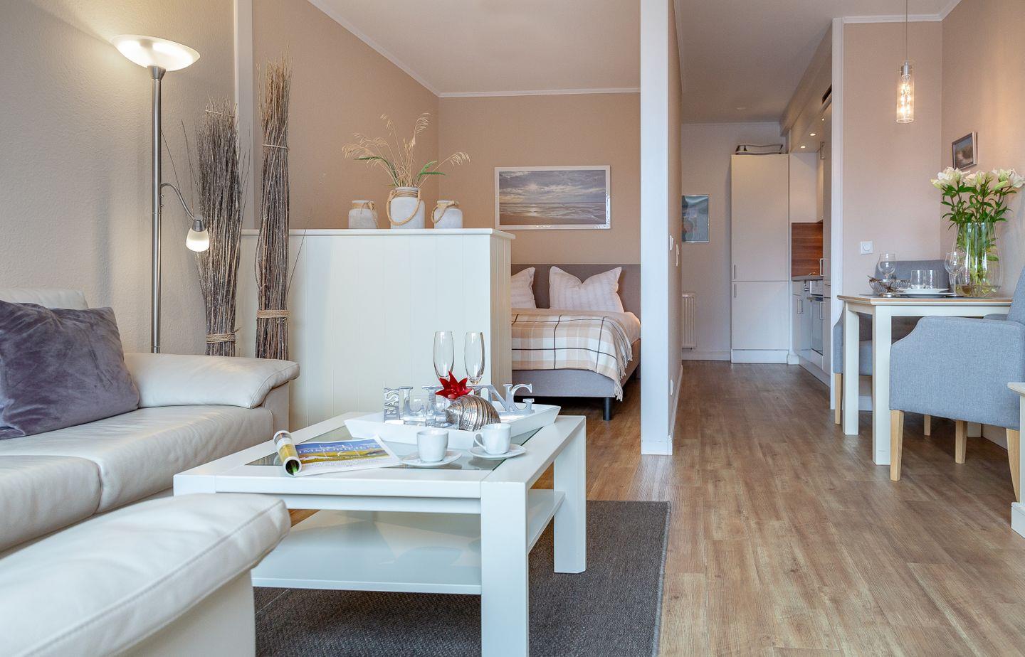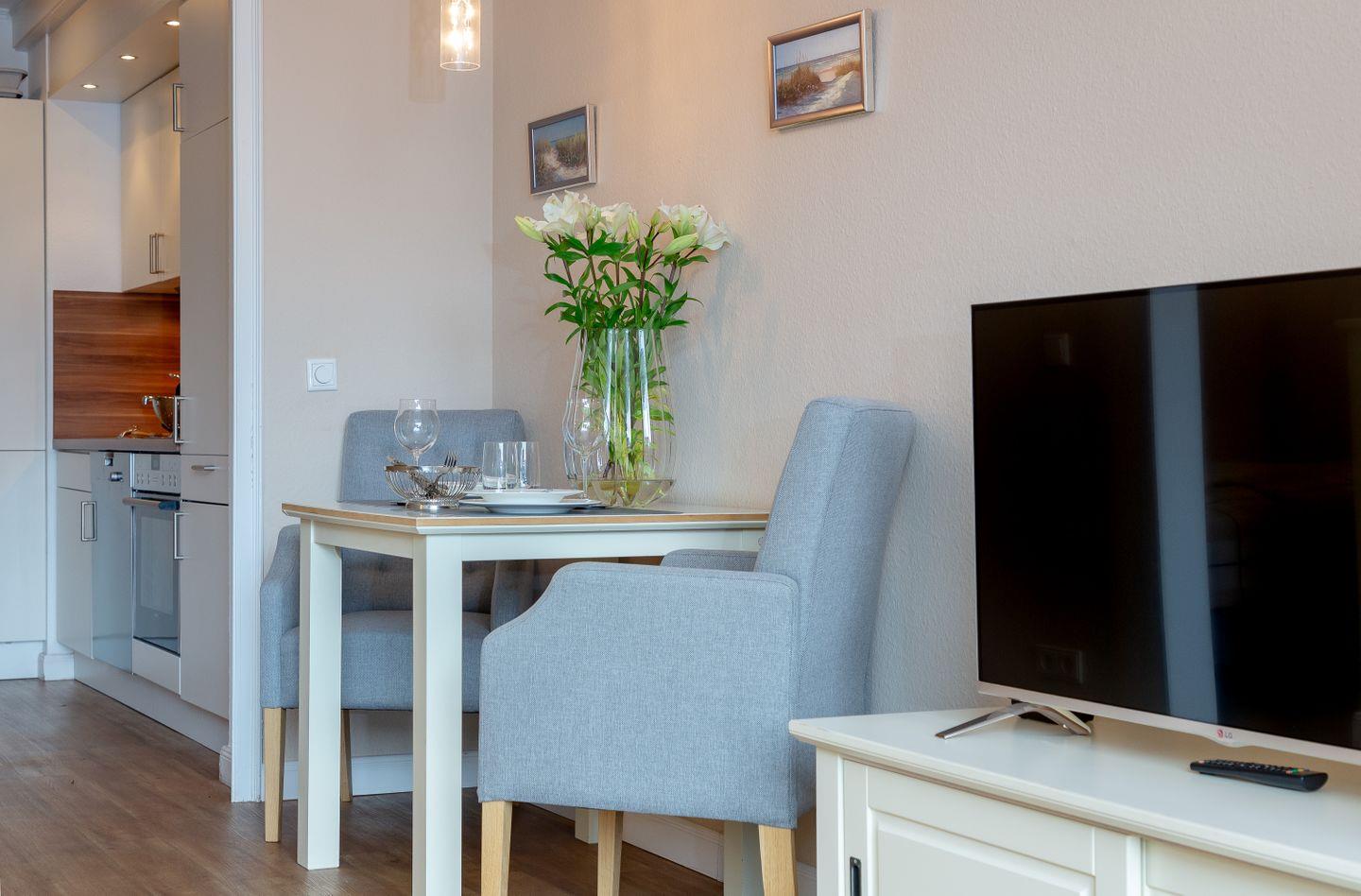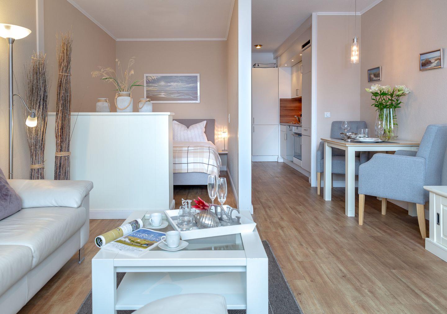 Westerland, Friedrichstraße, direkt am Strand. Optimale, zentrale und strandnahe Lage in Westerland für 2 Personen. Die hübsche Wohnung liegt in der 1. Etage einer top gepflegten Wohnanlage in der Friedrichstraße nur wenige Meter vom Westerländer Hauptstrand entfernt. Die Wohnung ist im modernen, frischen Stil eingerichtet. Neue Küche im Eingangsbereich (MW,GS) Schicker Designboden in Holzoptik. Moderne, teilweise in 2014 erneuerte Möbel. Duschbad. Abgetrennter kuscheliger Schlafbereich Bockspringbett (160x 200). Der sonnige Südbalkon mit seinen modernen Gartenmöbeln lädt zum Relaxen ein. Hier stimmt das Gesamtpaket. Zu dieser Wohnung gehört ein PKW Stellplatz in der Garage. Fahrradabstellmöglichkeiten befinden sich ebenfalls in der Garage. Im Haus: Fahrstuhl, Waschküche mit Münzautomaten.