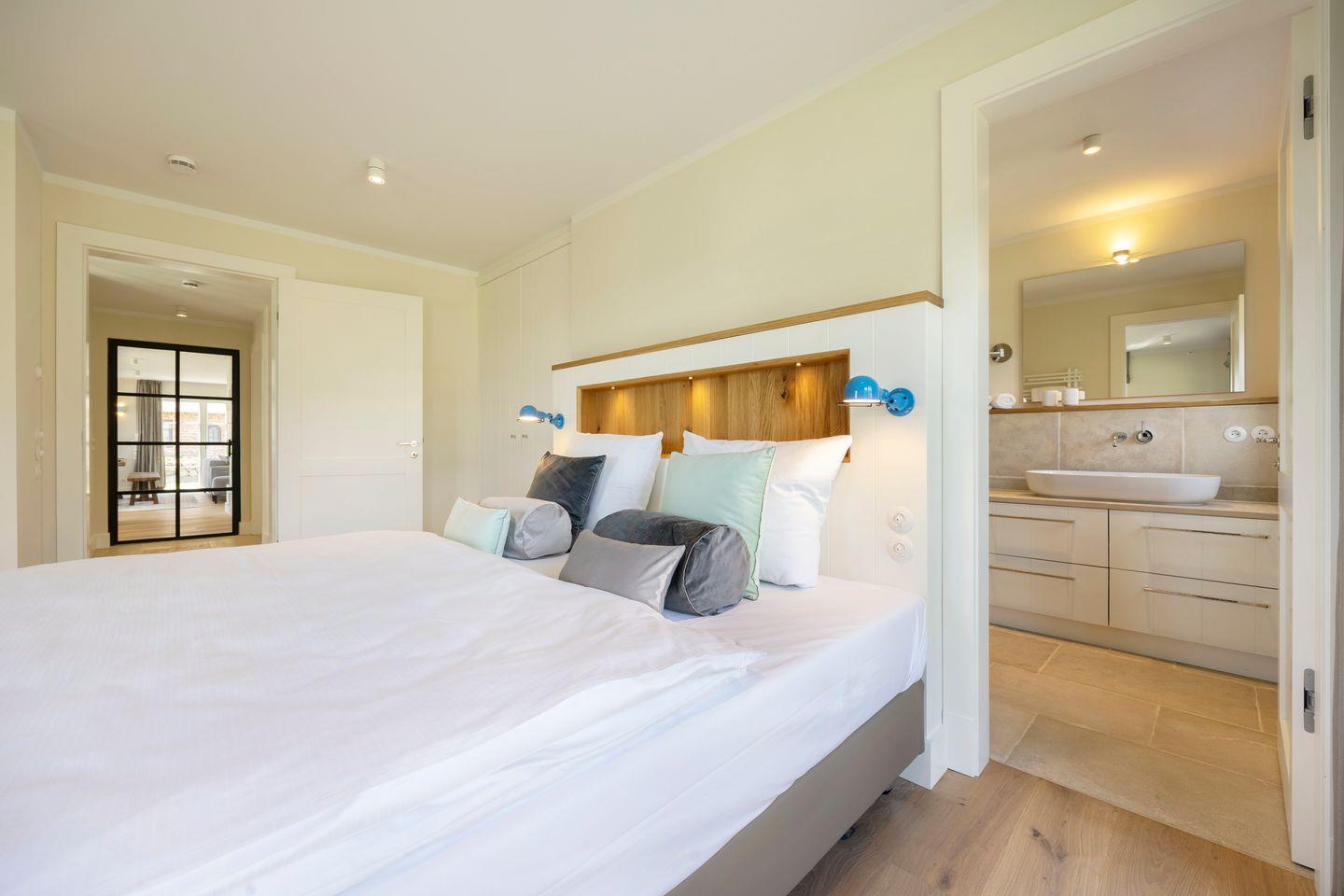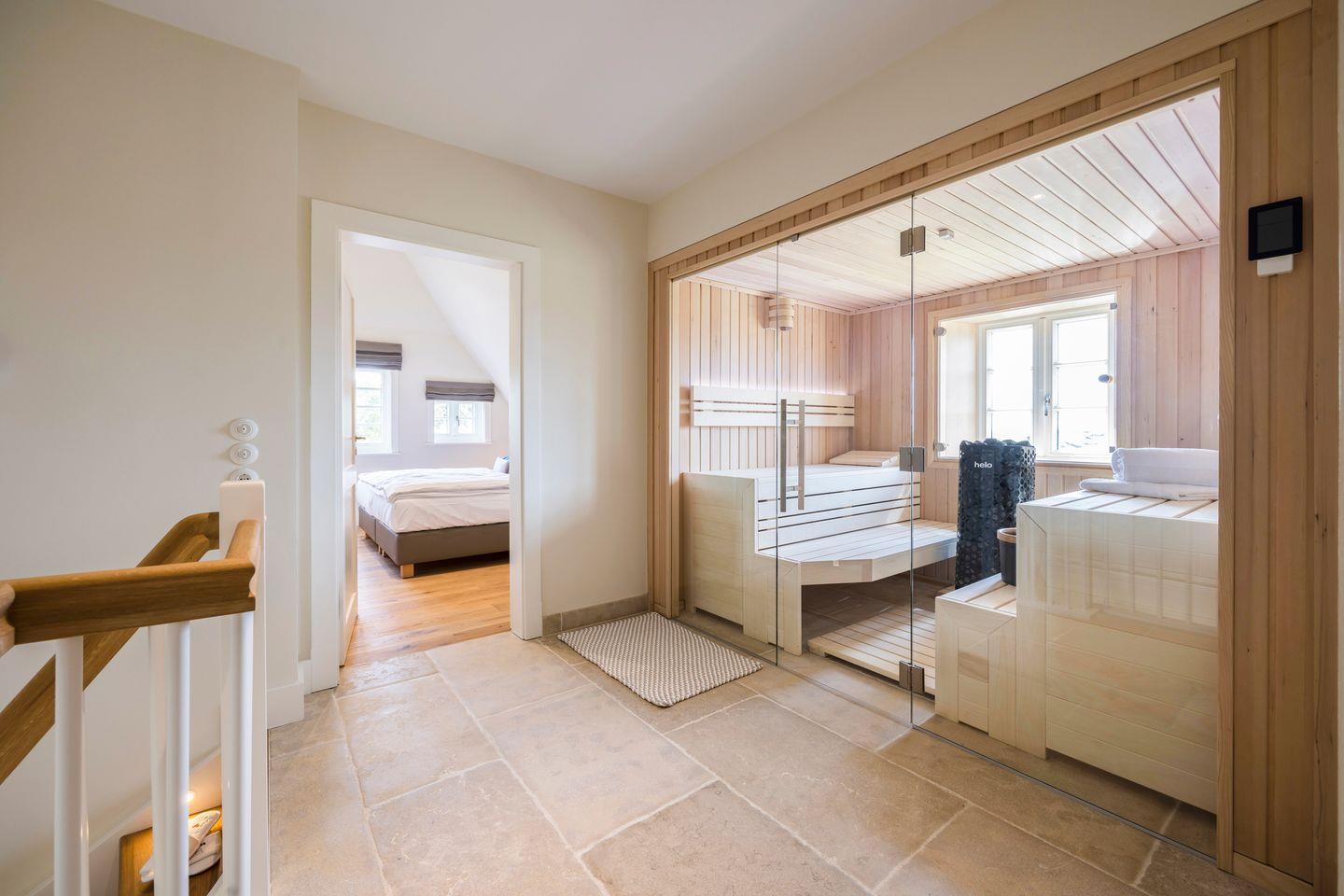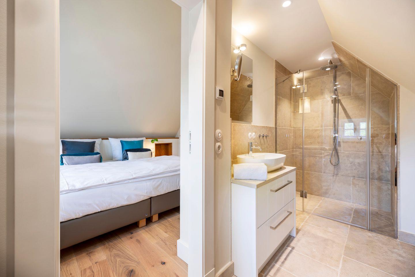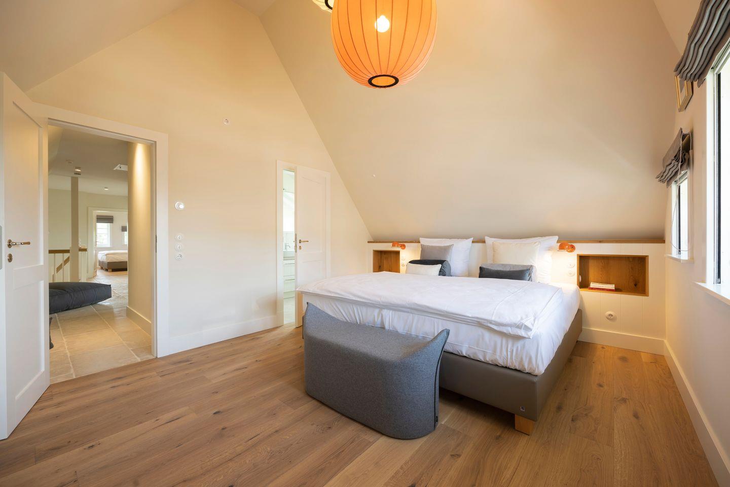 Die vier Schlafzimmer sind mit Boxspringbetten und stilvollem Interieur ausgestattet. Zwei der Schlafzimmer bieten Kingsize-Doppelbetten (200x200 cm), einen eingebauten Kleiderschrank, TV und ein eigenes Badezimmer mit Dusche, Fußbodenheizung und Tageslicht. Das dritte Schlafzimmer ist mit einem Boxspring-Einzelbett (90x200 cm) sowie TV und einem kleinen Schreibtisch eingerichtet – ideal für Ruhe suchende Gäste. Im vierten Schlafzimmer erwartet Sie ein großzügiges Kingsize-Boxspringbett (200x210 cm), ein eingebauter Kleiderschrank und ein angrenzendes Badezimmer, das mit einer Dampfdusche und Fußbodenheizung höchsten Komfort bietet.