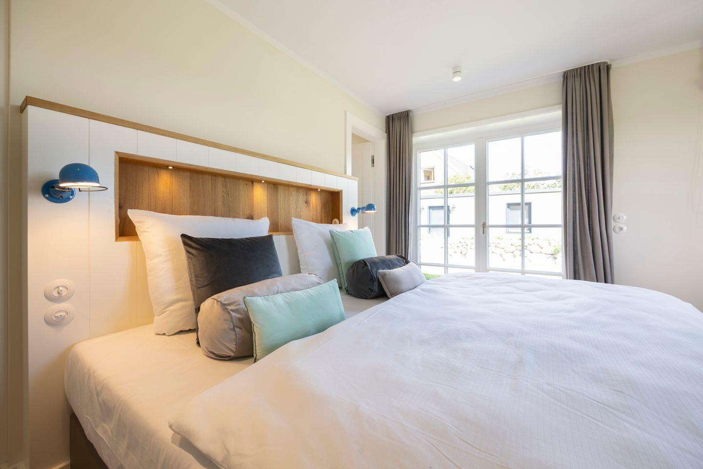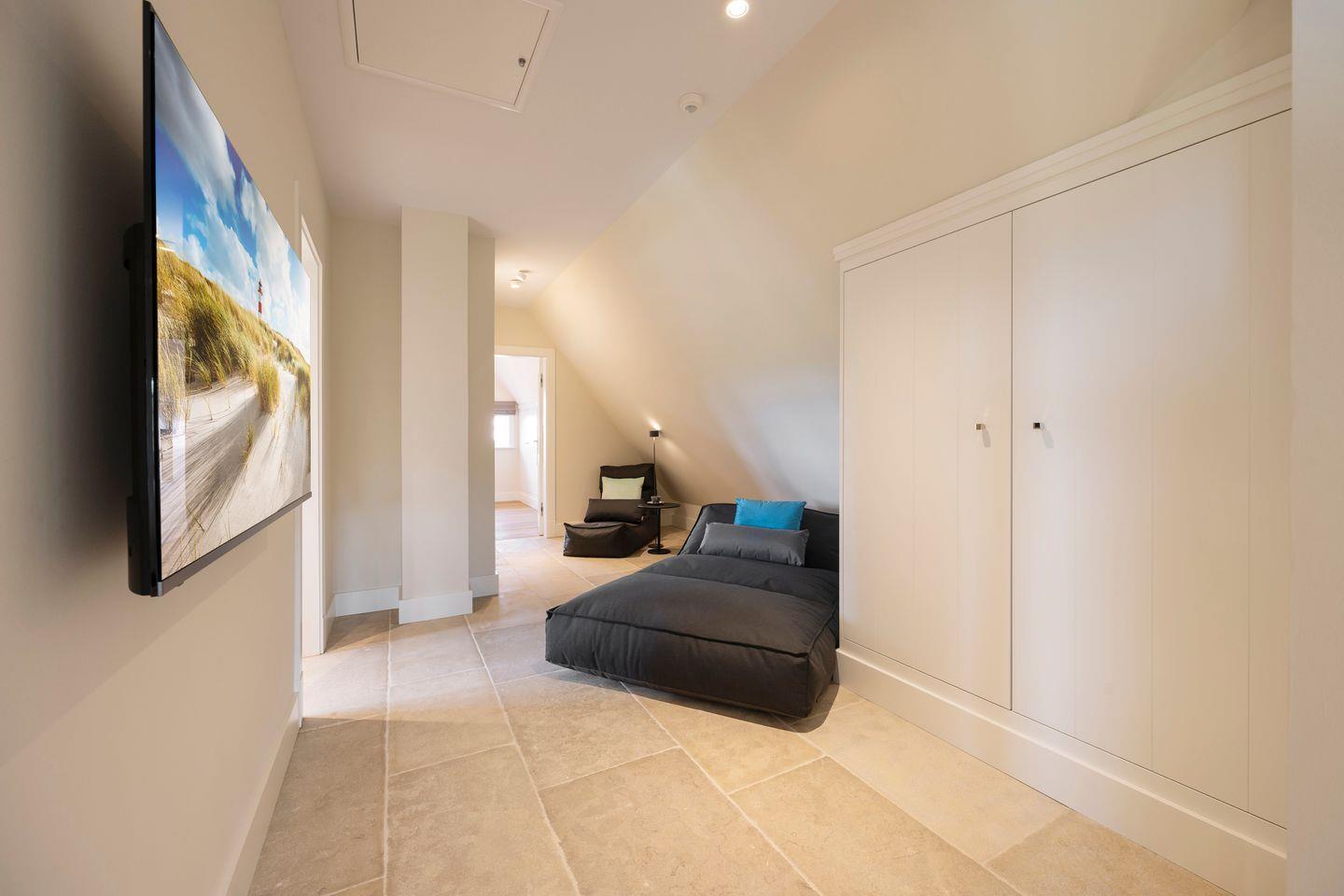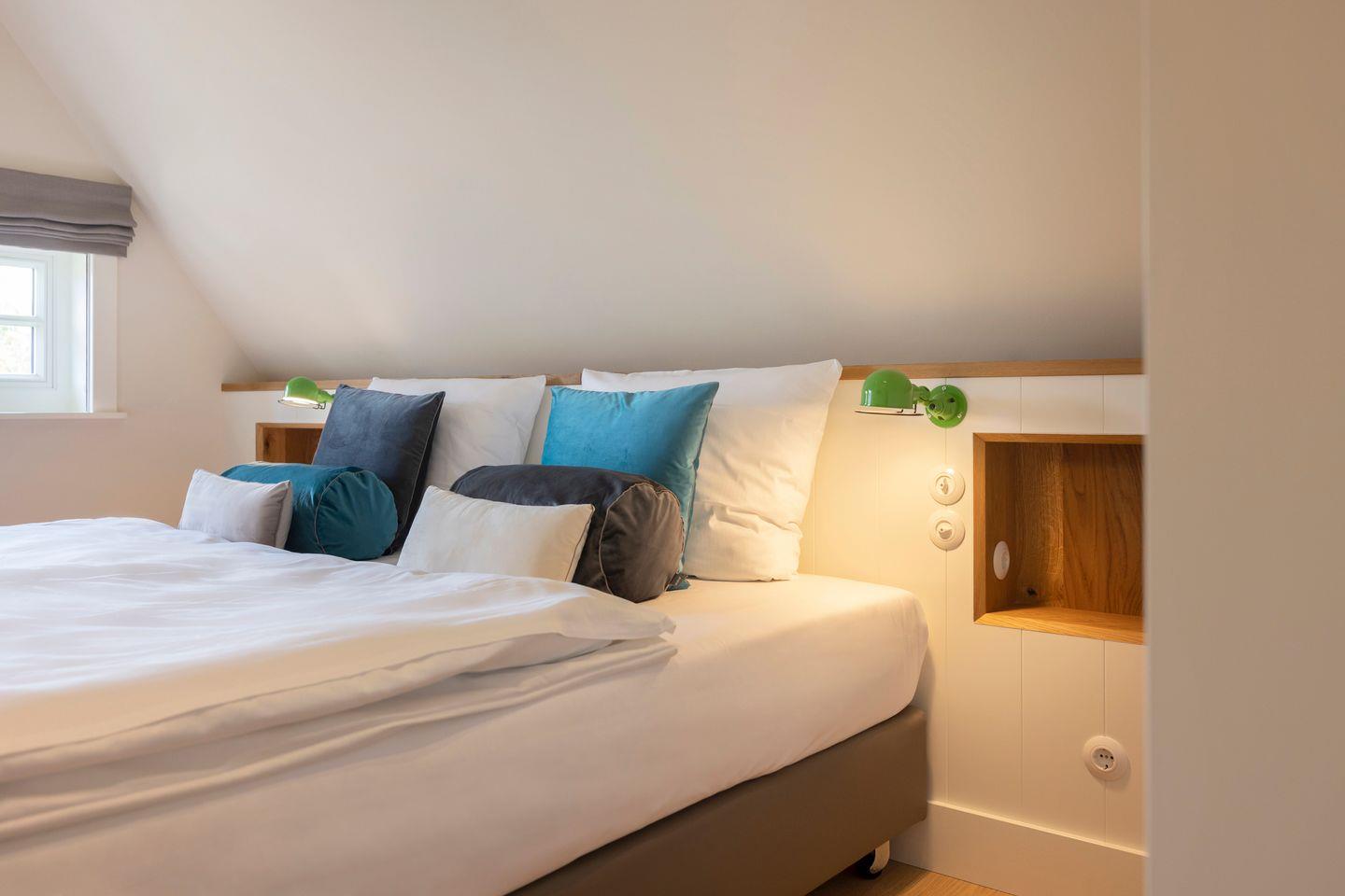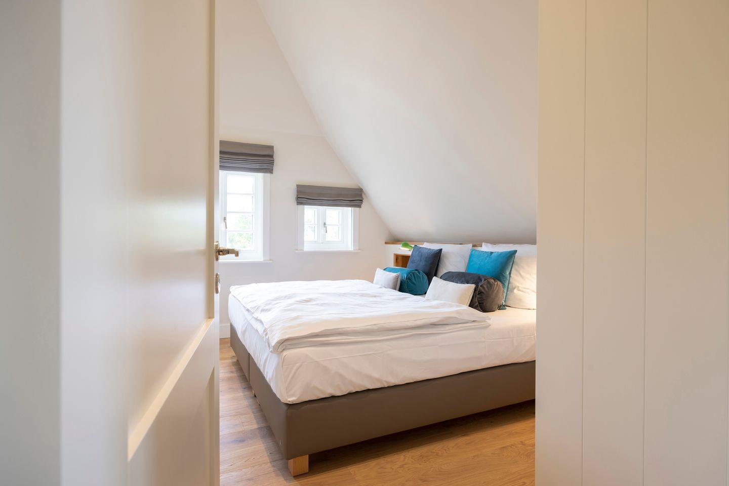Die vier Schlafzimmer sind mit Boxspringbetten und stilvollem Interieur ausgestattet. Zwei der Schlafzimmer bieten Kingsize-Doppelbetten (200x200 cm), einen eingebauten Kleiderschrank, TV und ein eigenes Badezimmer mit Dusche, Fußbodenheizung und Tageslicht. Das dritte Schlafzimmer ist mit einem Boxspring-Einzelbett (90x200 cm) sowie TV und einem kleinen Schreibtisch eingerichtet – ideal für Ruhe suchende Gäste. Im vierten Schlafzimmer erwartet Sie ein großzügiges Kingsize-Boxspringbett (200x210 cm), ein eingebauter Kleiderschrank und ein angrenzendes Badezimmer, das mit einer Dampfdusche und Fußbodenheizung höchsten Komfort bietet.