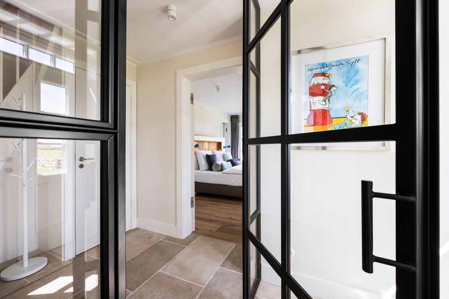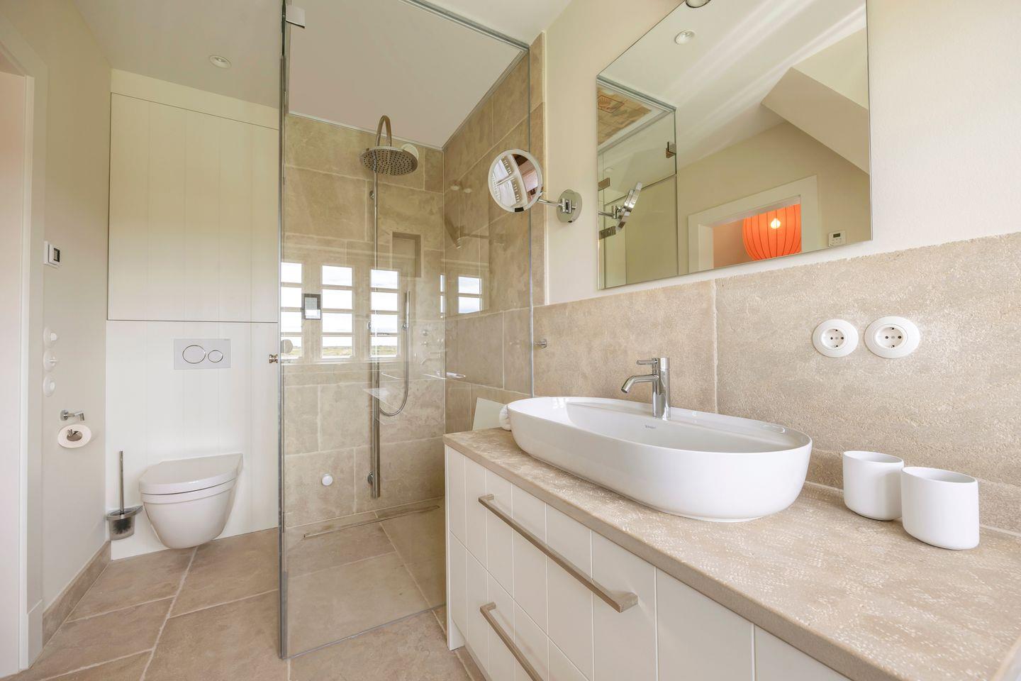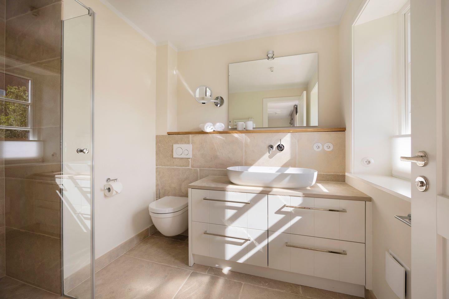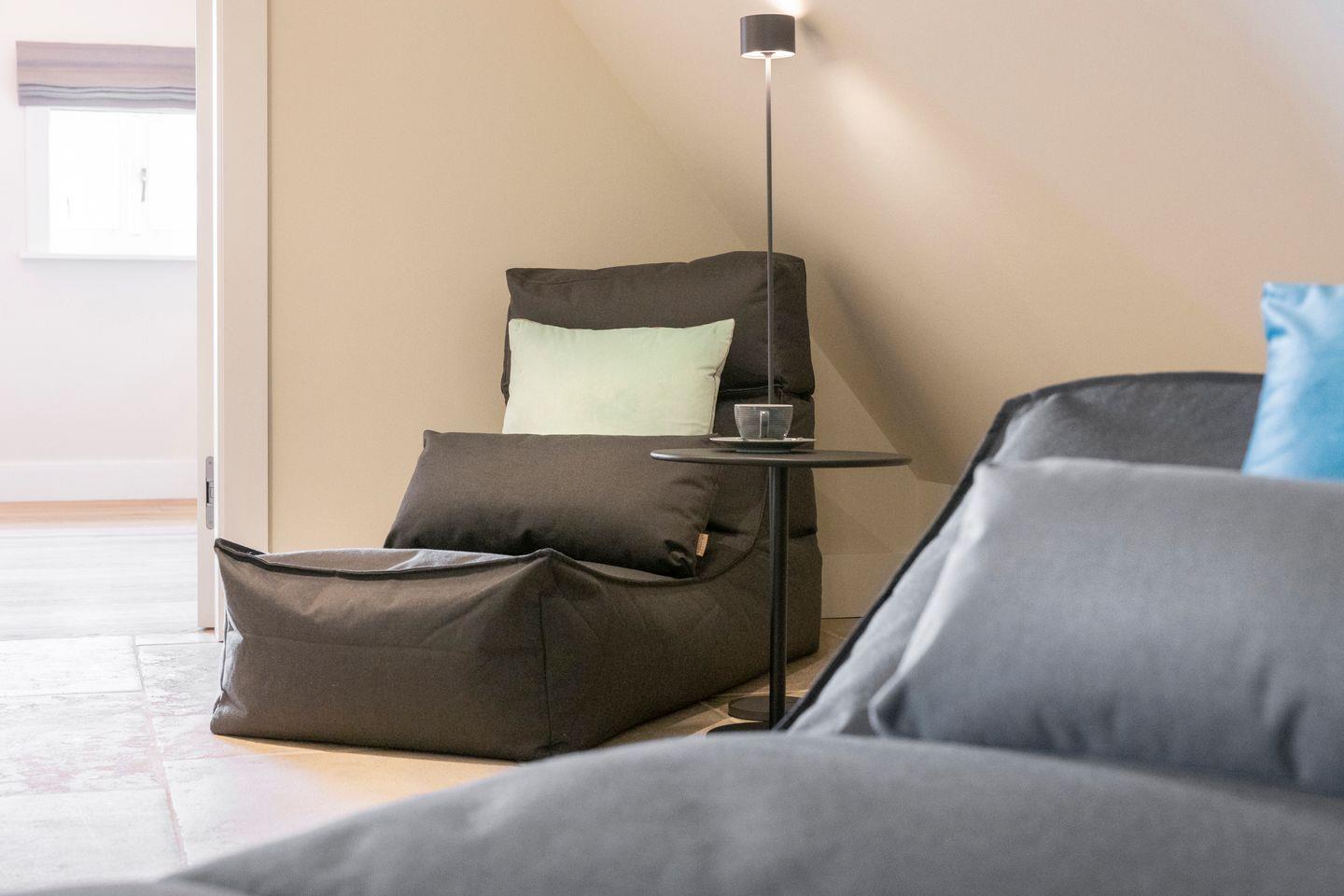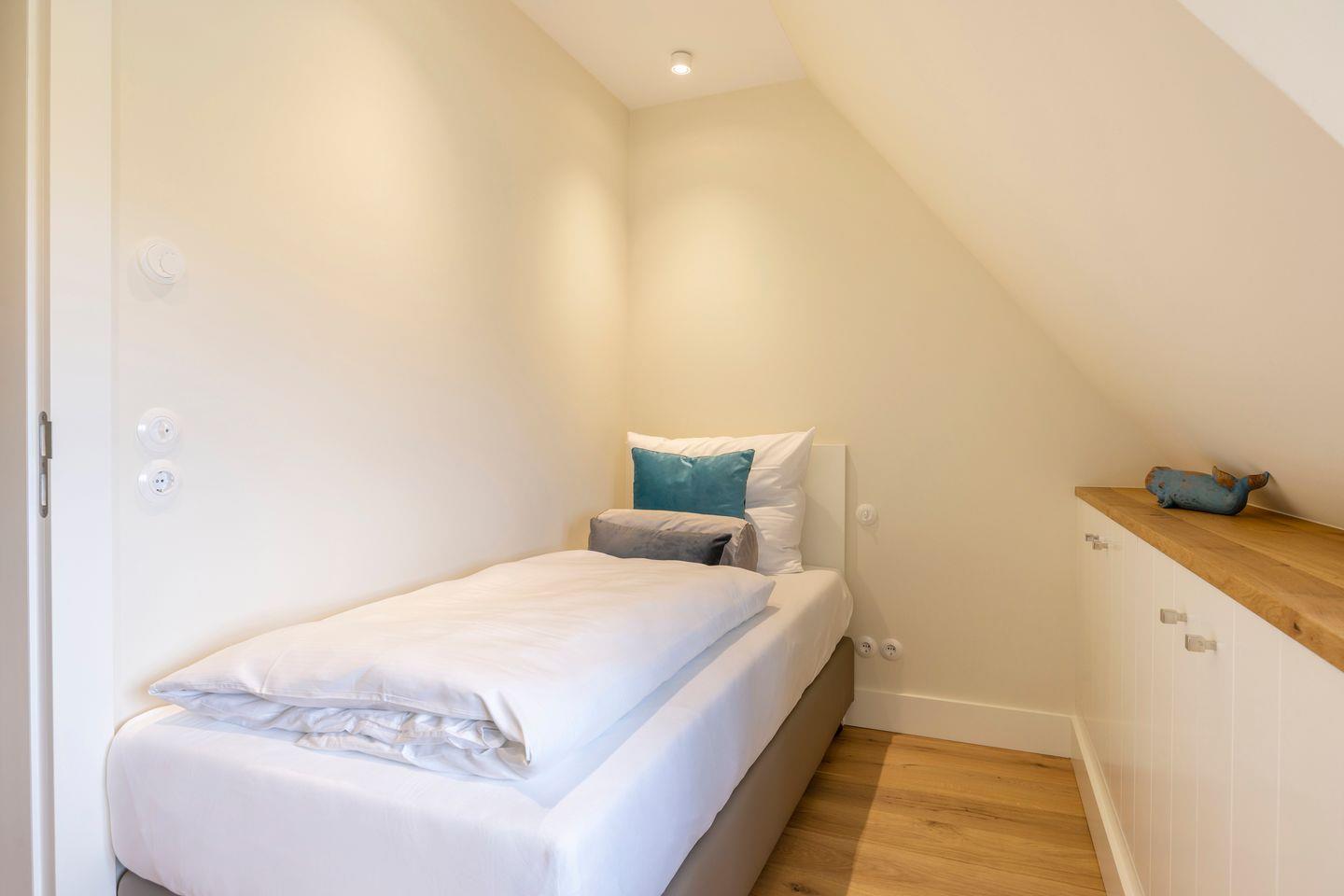 Die vier Schlafzimmer sind mit Boxspringbetten und stilvollem Interieur ausgestattet. Zwei der Schlafzimmer bieten Kingsize-Doppelbetten (200x200 cm), einen eingebauten Kleiderschrank, TV und ein eigenes Badezimmer mit Dusche, Fußbodenheizung und Tageslicht. Das dritte Schlafzimmer ist mit einem Boxspring-Einzelbett (90x200 cm) sowie TV und einem kleinen Schreibtisch eingerichtet – ideal für Ruhe suchende Gäste. Im vierten Schlafzimmer erwartet Sie ein großzügiges Kingsize-Boxspringbett (200x210 cm), ein eingebauter Kleiderschrank und ein angrenzendes Badezimmer, das mit einer Dampfdusche und Fußbodenheizung höchsten Komfort bietet.