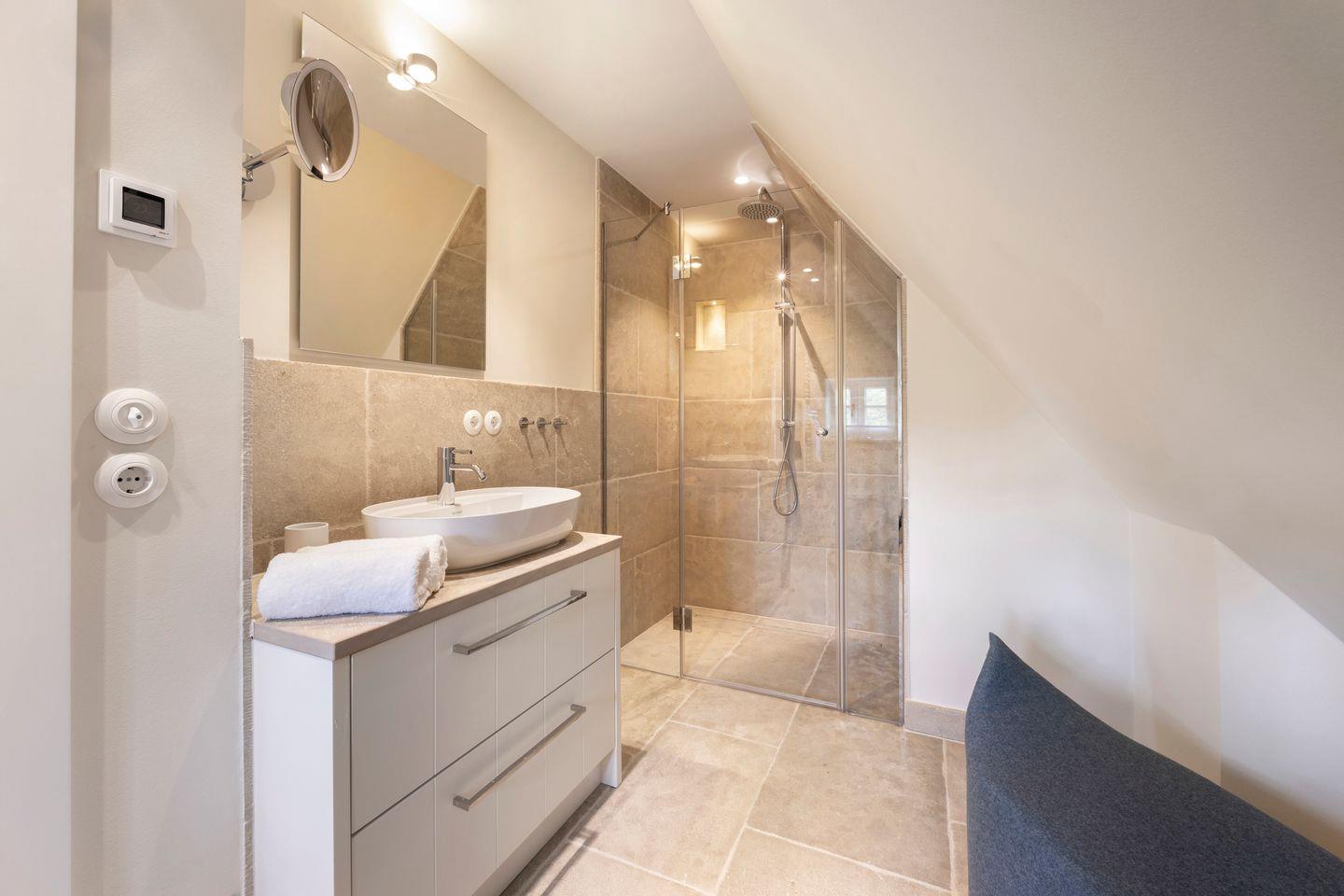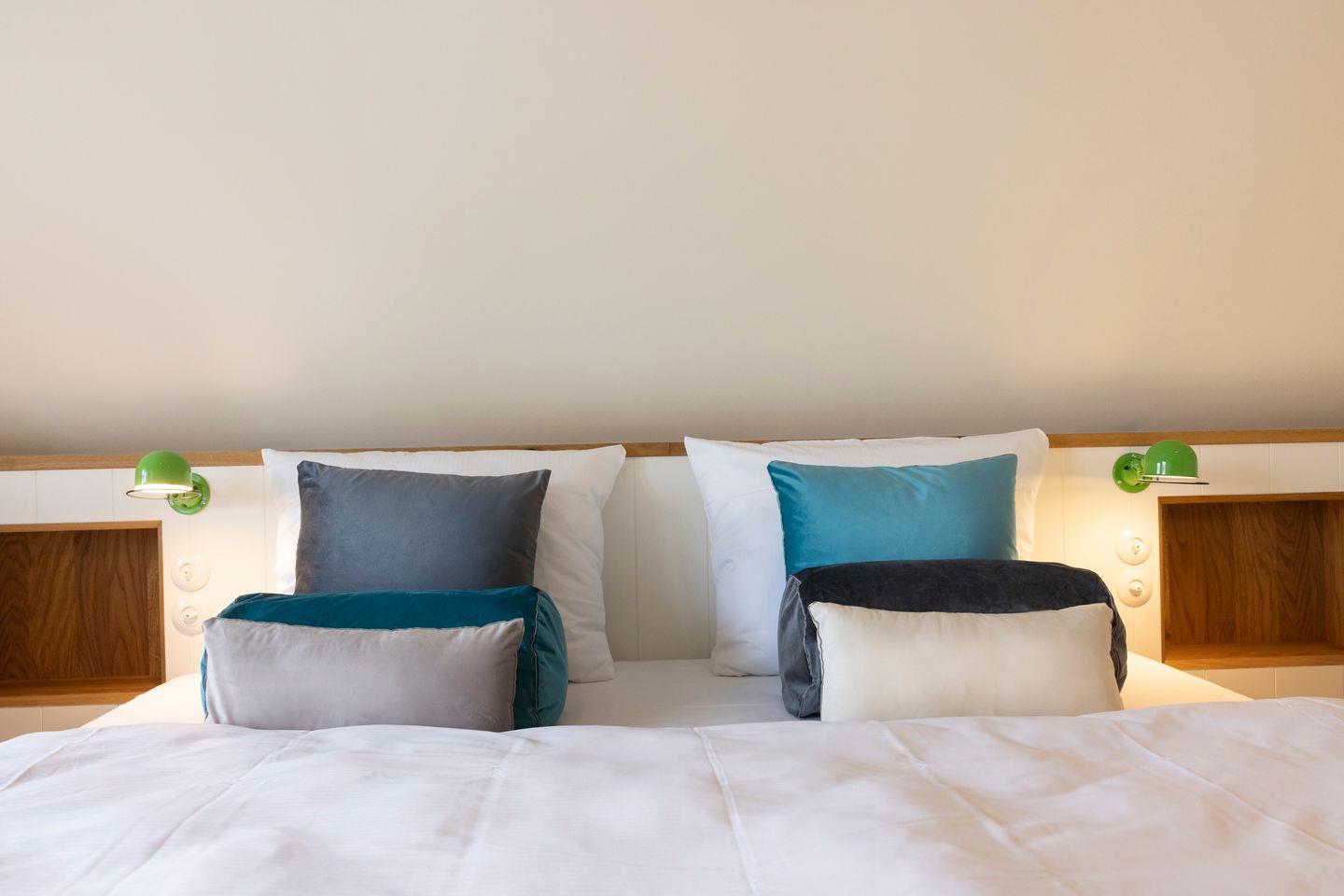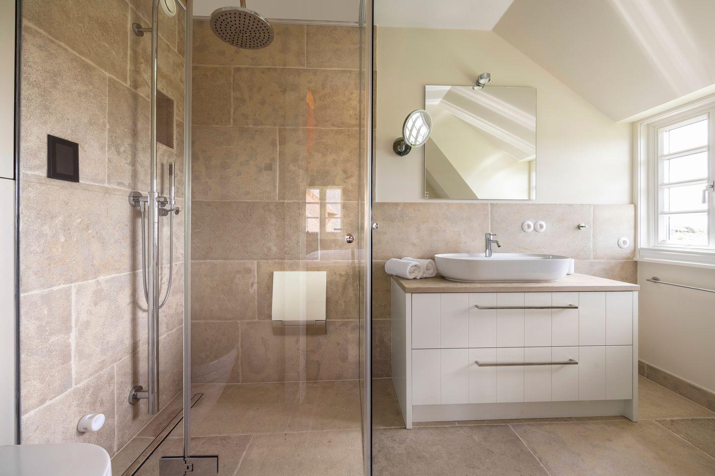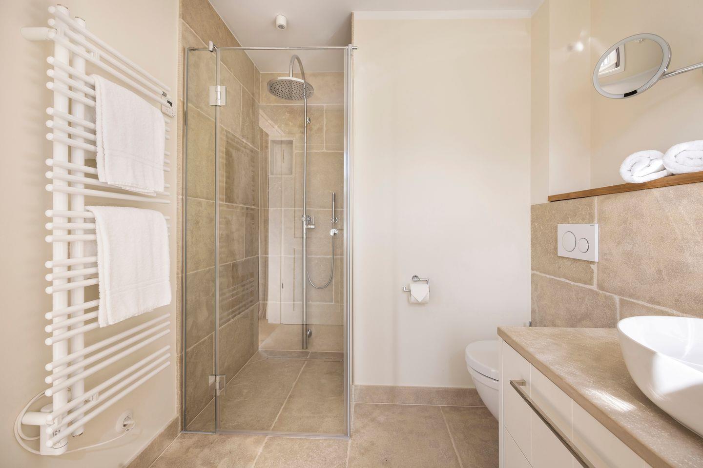 Die vier Schlafzimmer sind mit Boxspringbetten und stilvollem Interieur ausgestattet. Zwei der Schlafzimmer bieten Kingsize-Doppelbetten (200x200 cm), einen eingebauten Kleiderschrank, TV und ein eigenes Badezimmer mit Dusche, Fußbodenheizung und Tageslicht. Das dritte Schlafzimmer ist mit einem Boxspring-Einzelbett (90x200 cm) sowie TV und einem kleinen Schreibtisch eingerichtet – ideal für Ruhe suchende Gäste. Im vierten Schlafzimmer erwartet Sie ein großzügiges Kingsize-Boxspringbett (200x210 cm), ein eingebauter Kleiderschrank und ein angrenzendes Badezimmer, das mit einer Dampfdusche und Fußbodenheizung höchsten Komfort bietet.