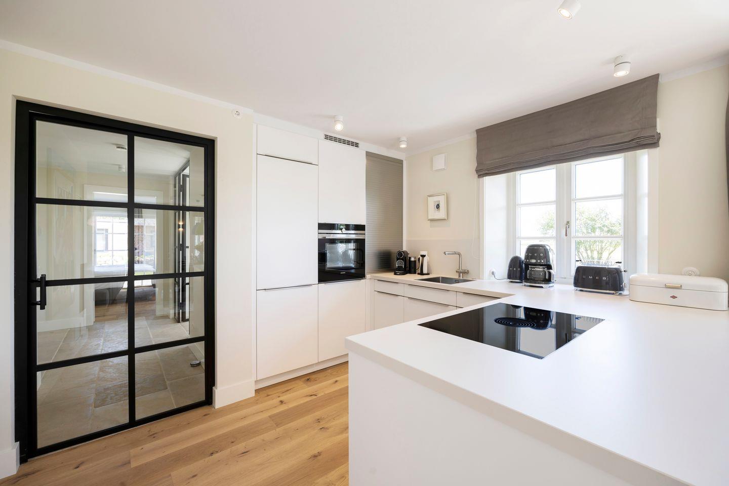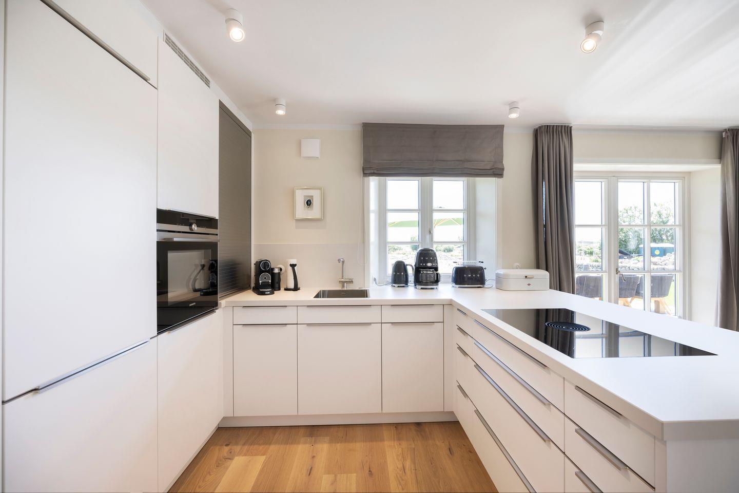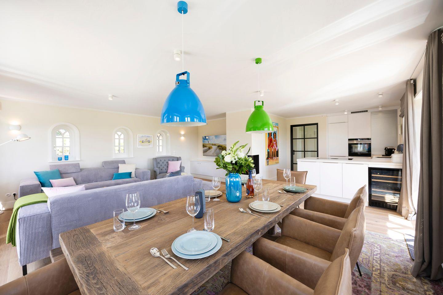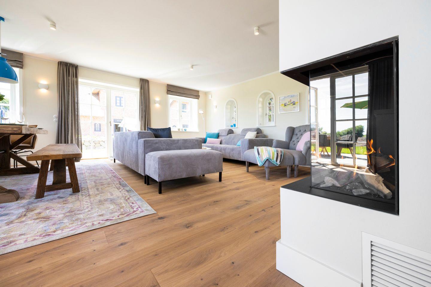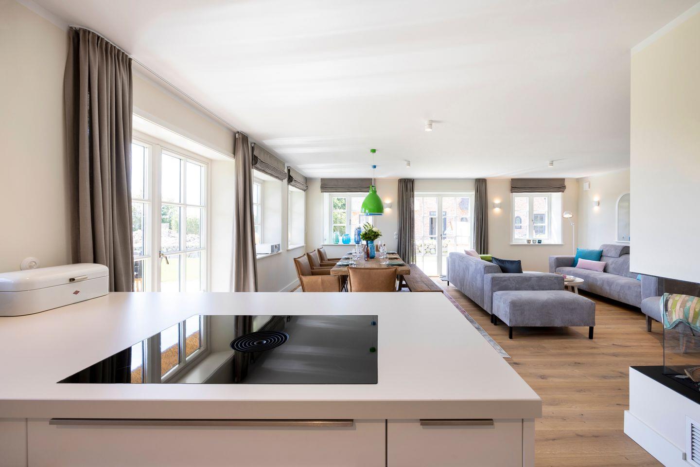 Der lichtdurchflutete Wohn- und Essbereich vereint friesische Gemütlichkeit mit modernster Ausstattung. Die gemütlichen Couchen und der Gaskamin machen den Raum zum perfekten Rückzugsort nach einem langen Tag. Der Esstisch aus 100 Jahre altem Eichenholz lädt zu ausgiebigen Mahlzeiten und geselligen Abenden ein. Die offene, hochwertige Wohnküche ist mit sämtlichen modernen Annehmlichkeiten ausgestattet und verfügt über einen Weinkühlschrank.