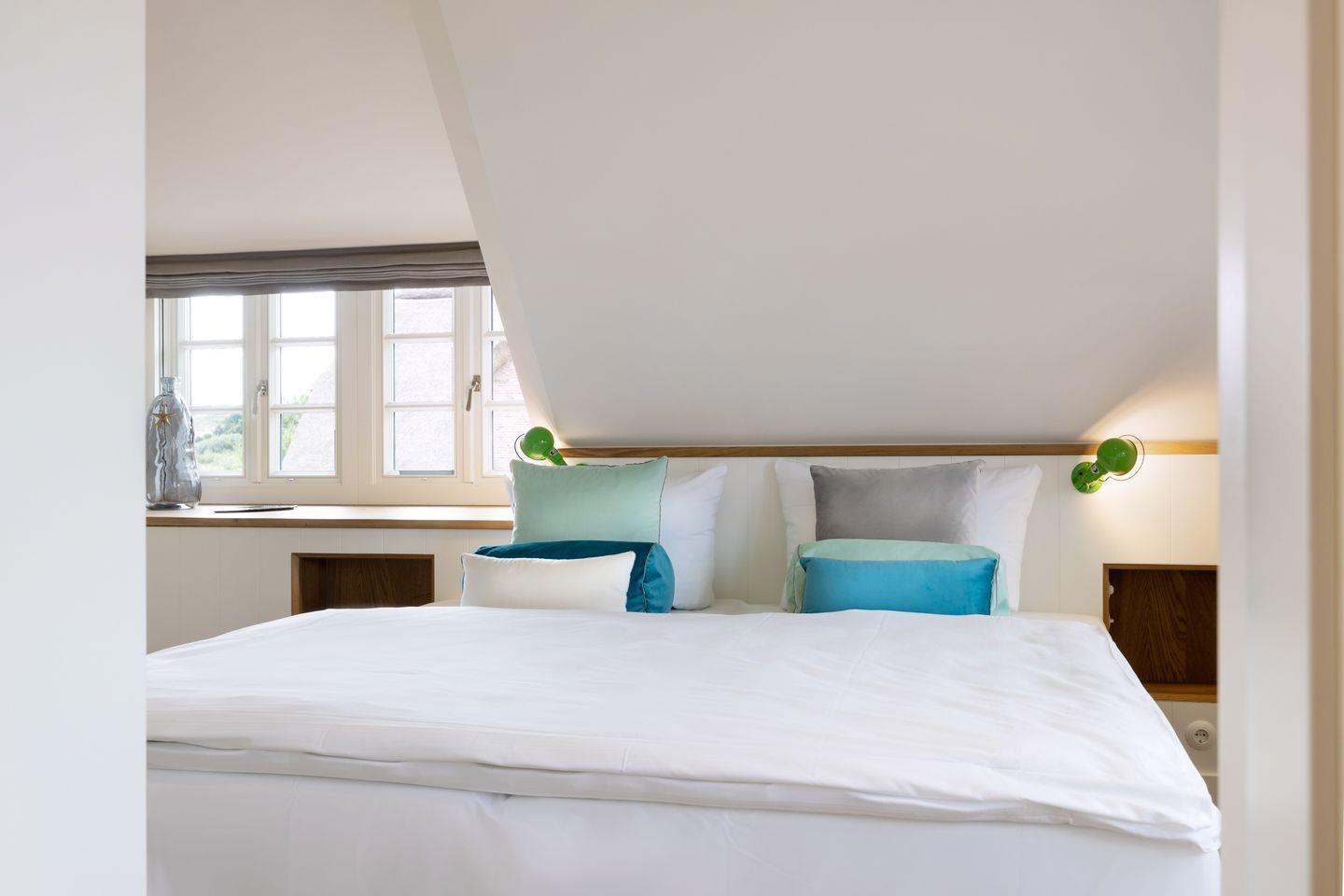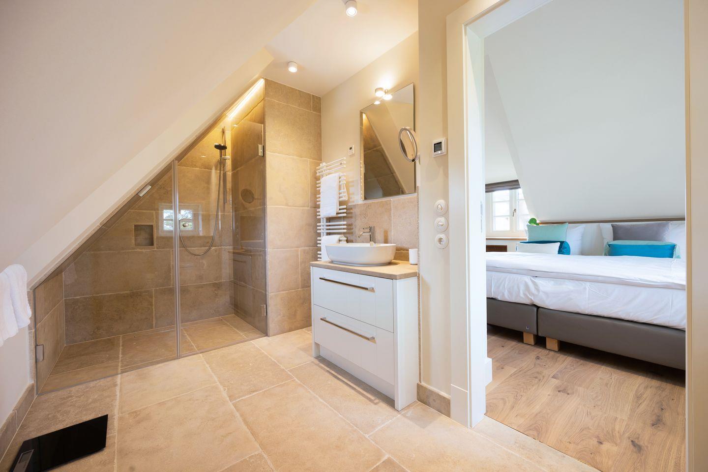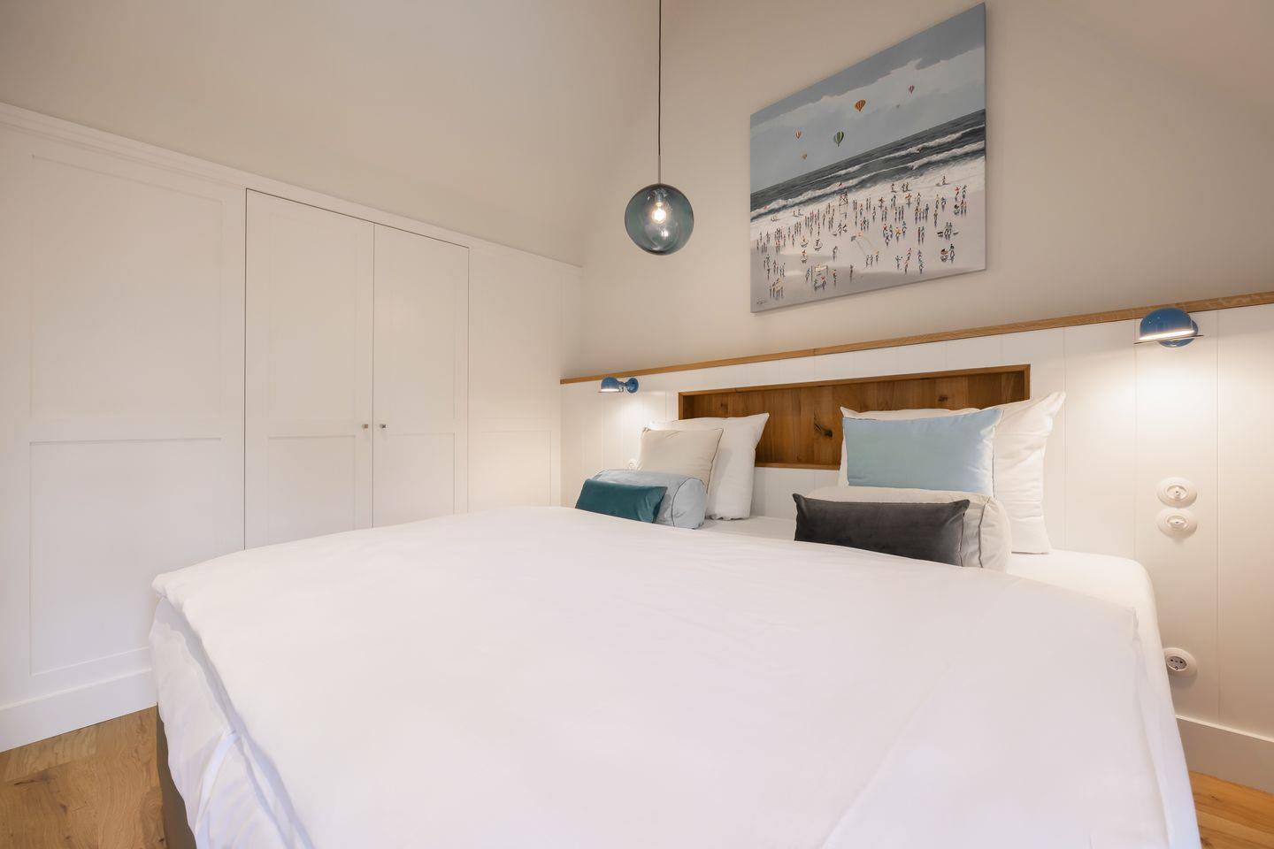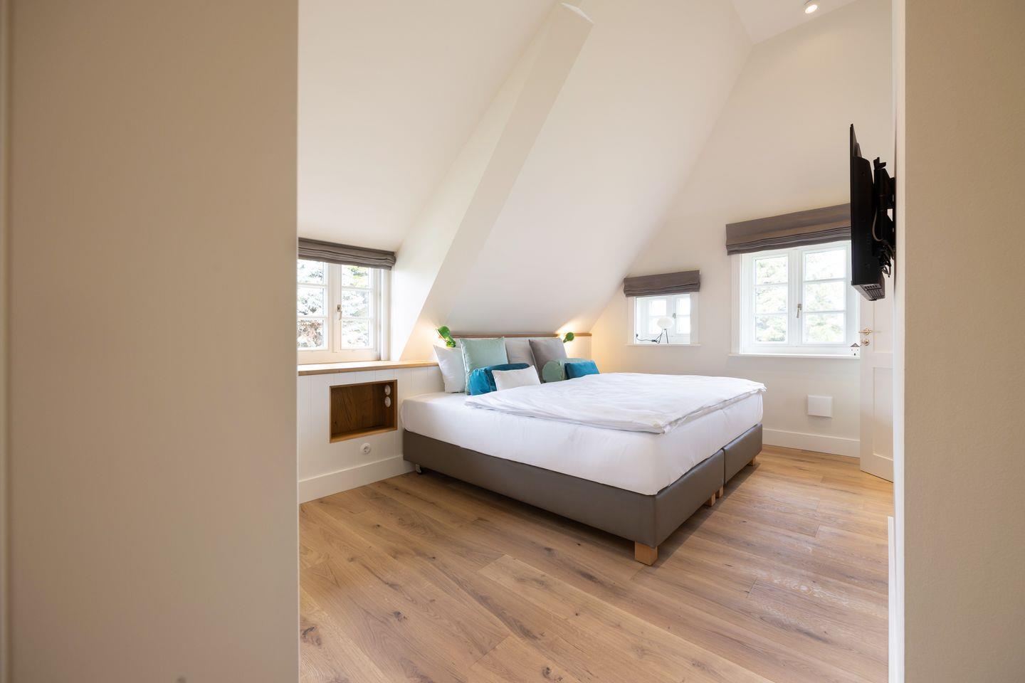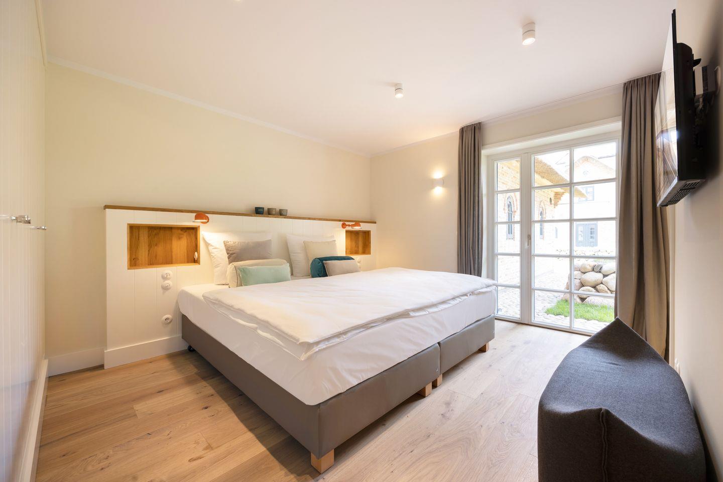 Das dritte Schlafzimmer bietet mit einem luxuriösen Kingsize-Boxspring-Doppelbett (200x210 cm) besonders viel Platz und Komfort. Auch hier finden Sie ein TV und praktische Einbauschränke. Ein weiteres Highlight ist das exklusive Badezimmer, das diesem Raum angeschlossen ist: Mit einer luxuriösen Dampfdusche, Fußbodenheizung und Tageslicht wird jeder Aufenthalt zum kleinen Wellness-Erlebnis. So bietet jedes Schlafzimmer eine ideale Rückzugsoase, die Sie während Ihres Aufenthalts genießen können.