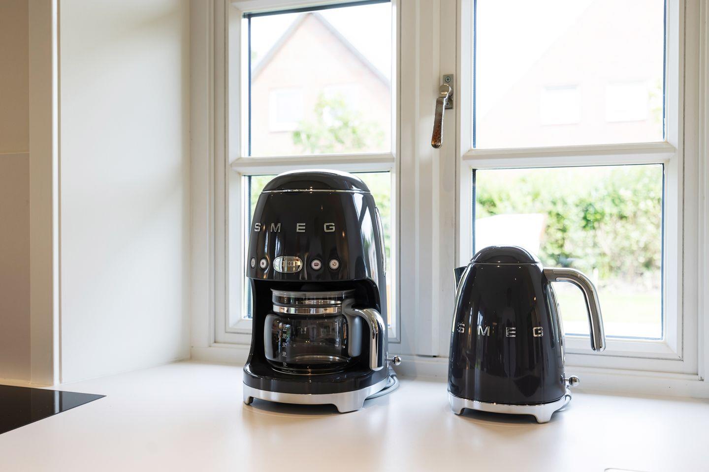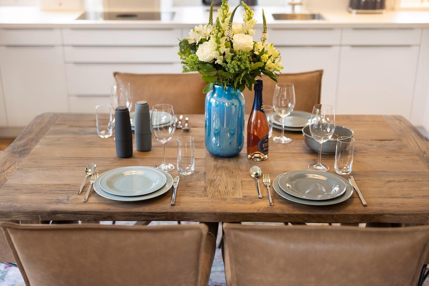 Der lichtdurchflutete Wohn- und Essbereich vereint friesischen Charme mit modernstem Komfort. Die große Couch und der stilvolle Gaskamin schaffen eine einladende Atmosphäre. Ein rustikaler Esstisch aus 100 Jahre altem Eichenholz wird zum Highlight jeder Mahlzeit. Die offen gestaltete Küche ist vollständig ausgestattet, inklusive Weinkühlschrank und hochwertiger Geräte.
