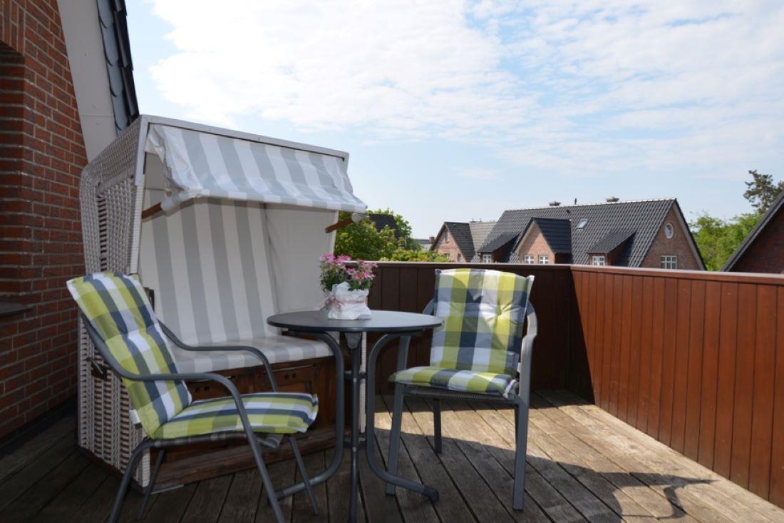Großer Balkon - Südwest Richtung - mit Strandkorb und Gartenmöbeln lädt zum Ausruhen ein.
