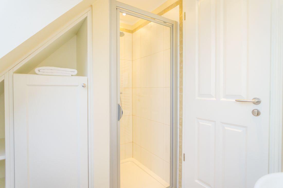 Das Badezimmer ist mit Dusche und WC ausgestattet.