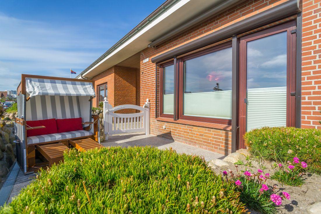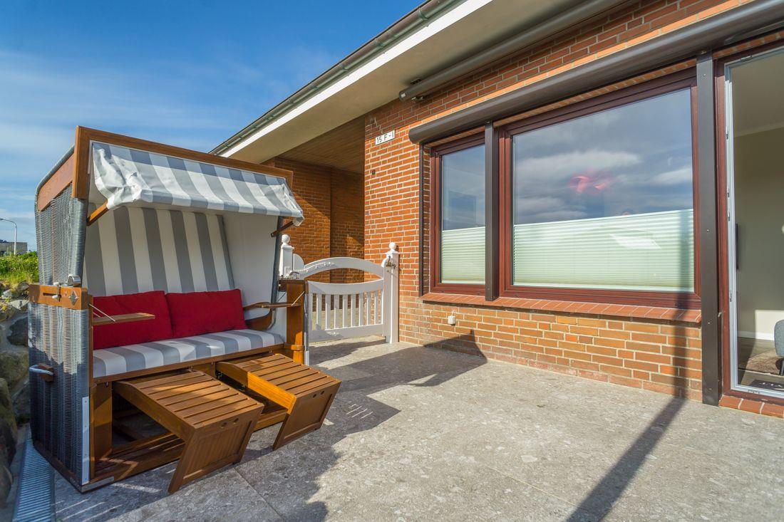 Vom Wohnbereich erreichen Sie Ihre Terrasse mit Strandkorb und Gartenmöbeln.