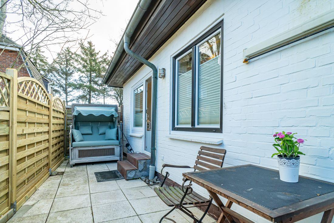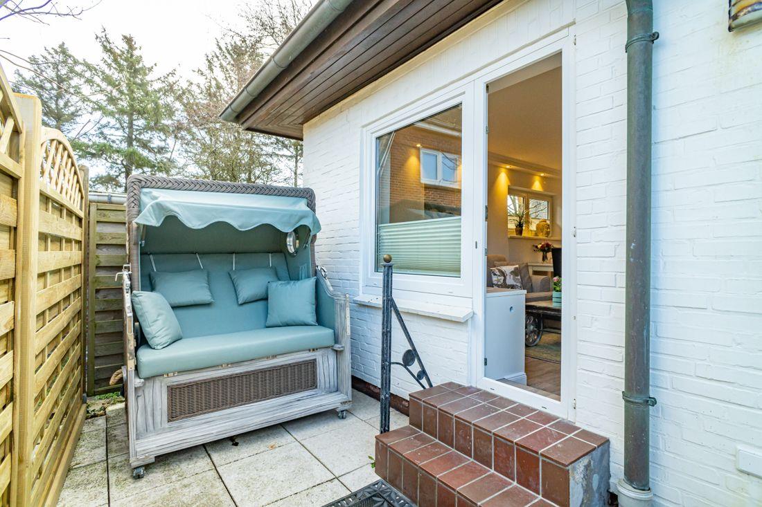 Eigene Terrasse mit Strandkorb und Gartenmöbeln.