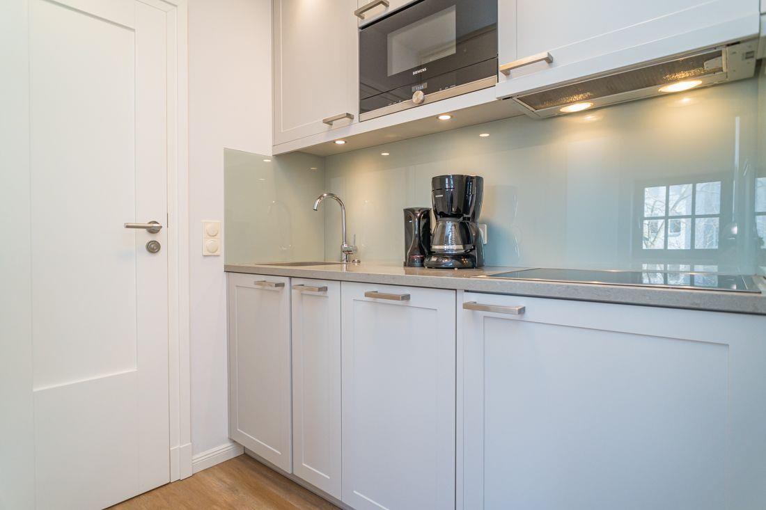 Die Küchenzeile verfügt u.a. über 4er Kochfeld, Mikrowelle und Spülmaschine.