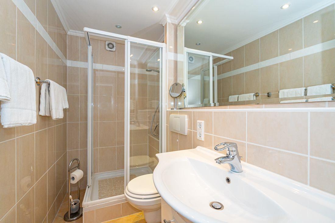 Das Badezimmer ist mit Dusche und WC eingerichtet.