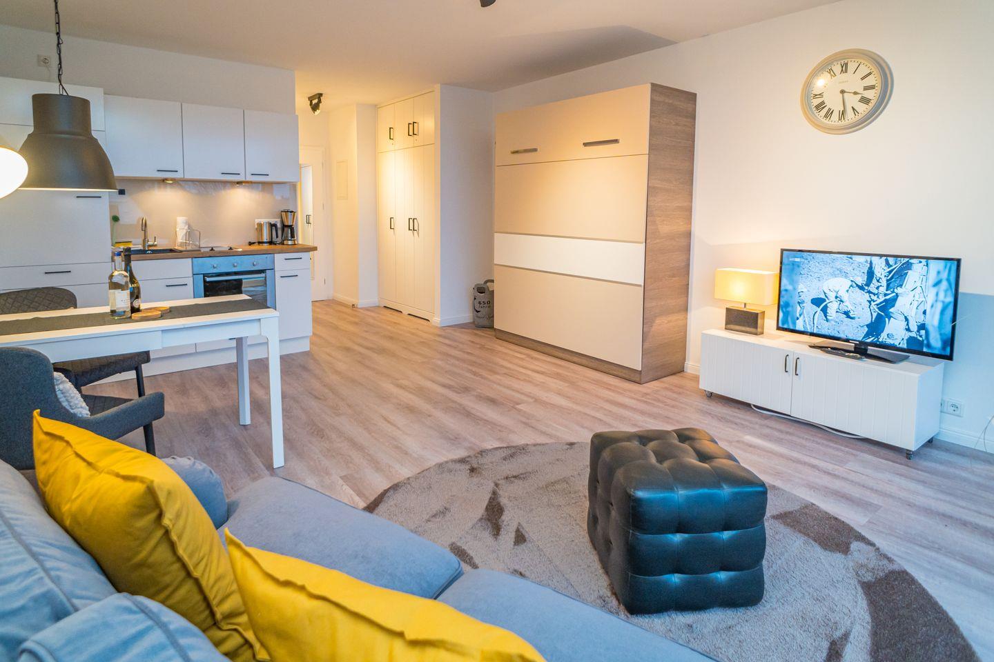 Vom hellen Wohnraum mit hochwertigen Schrankbett, gemütlicher Sofaecke und Essgruppe, gelangen Sie auf den möblierten Balkon. Der kostenlose Stellplatz mit der Nr. 17 steht Ihnen hinter dem Haus zur Verfügung. Die Ferienwohnung ist ein Nichtraucherdomizil, in dem Haustiere nicht erlaubt sind.