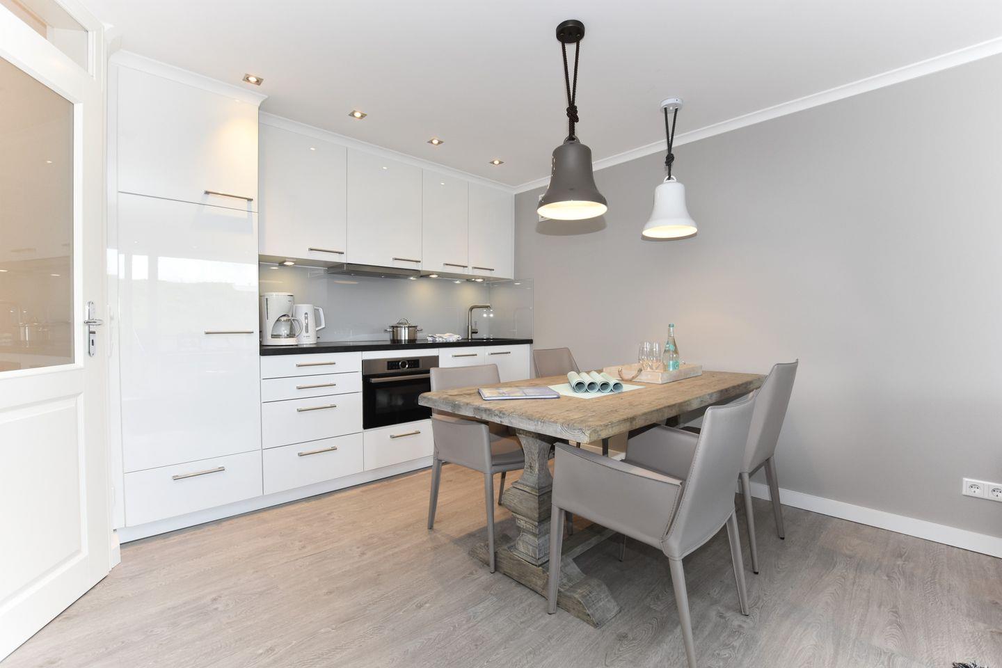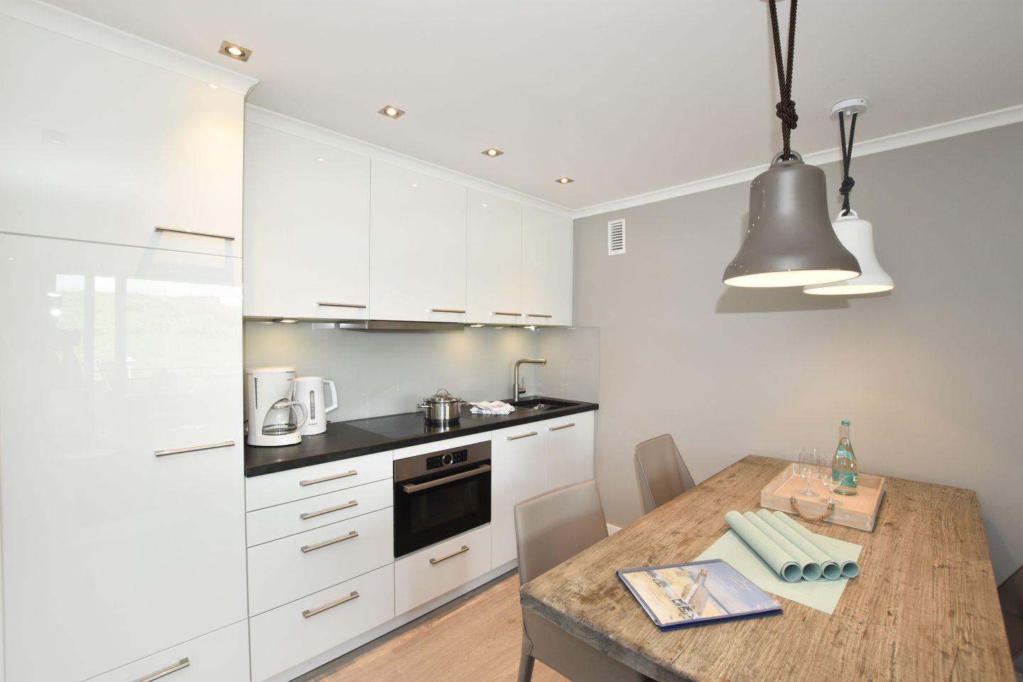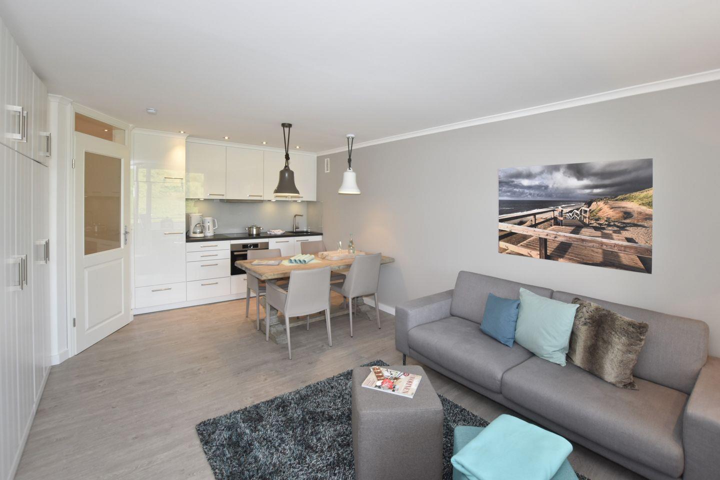 Koch-/Ess-/Wohnbereich: Moderne und gut ausgestattete Küche mit einem Essplatz für 4 Personen. Neben der offenen, voll ausgestatteten Küche befindet sich ein Essplatz für 4 Personen. Die gemütliche Sofaecke (Schlafsofa) inklusive Smart-TV vervollständigt den Wohnbereich. Die Schrankwand im Wohnzimmer bietet Ihnen in Sekundenschnelle eine bequeme Schlafstätte mit zwei Einzelbetten. Von hier gelangen Sie auch auf den möblierten West-Balkon mit Blick in Richtung Sylter Welle und Strandübergang.