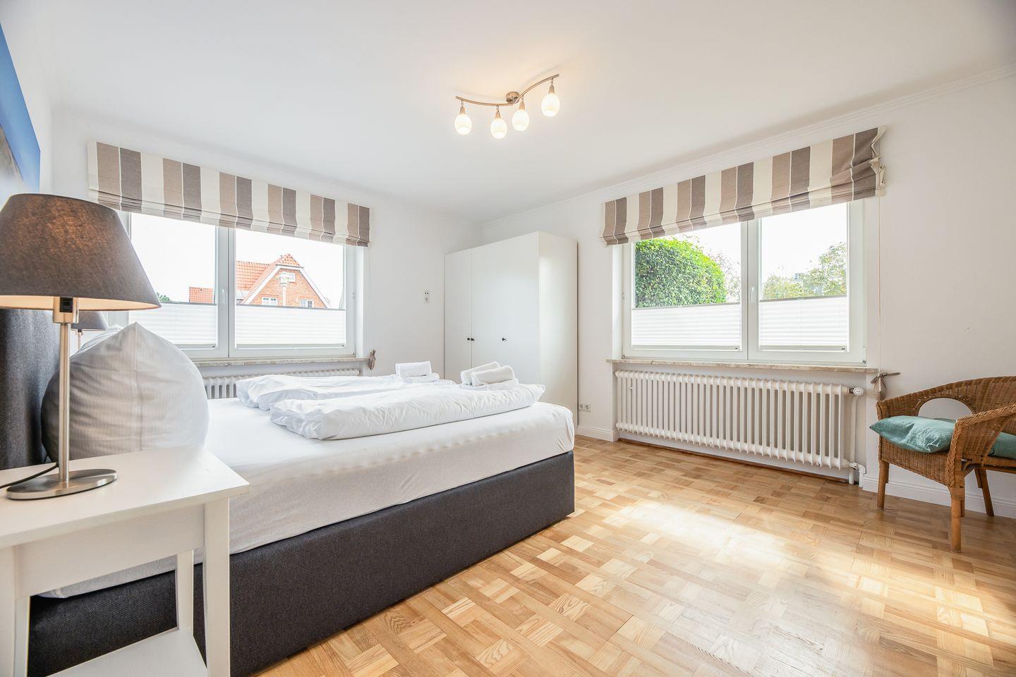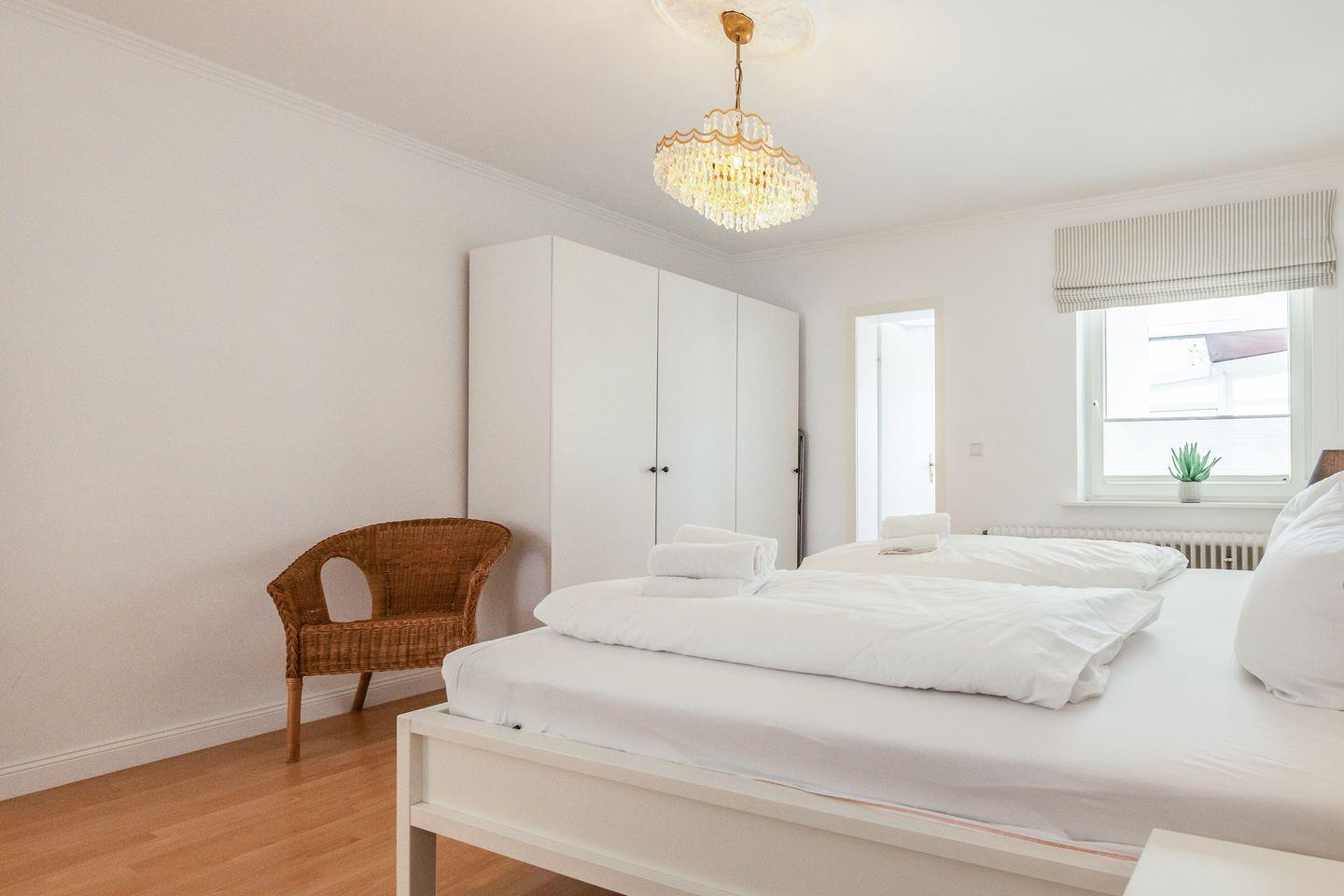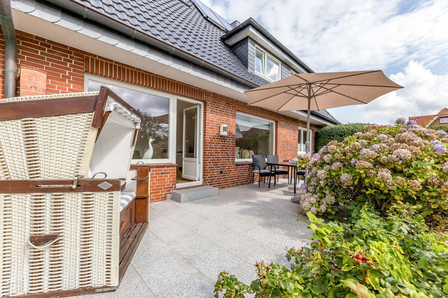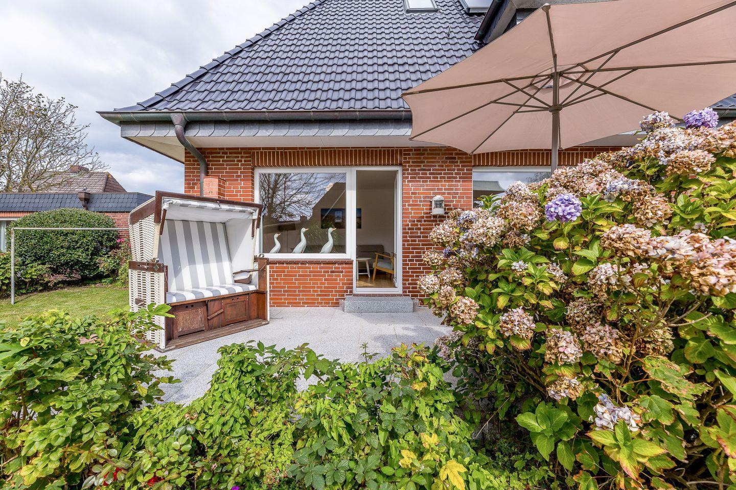 Weiße Wände, dazu helle Naturmaterialien – eine Kombi, die die gesamte Wohnung ruhig und einladend wirken lässt. Angefangen bei dem geräumigen Wohnzimmer in dem bequem eine Couch, ein Sessel sowie ein Esstisch ihren Platz finden. Eine große Fensterfont schenkt dazu schöne Aussichten auf die Terrasse und den blumigen Garten. Die Küche zitiert den modernen Friesen-Stil mit blau-weißen Fliesenwänden und muss sich auch in puncto Ausstattung nicht verstecken. Ein Schlafzimmer grenzt - verbunden durch eine Schiebetür - direkt an das Wohnzimmer an; das andere Schlafzimmer verfügt über ein Duschbad en Suite. Darüber hinaus gibt es noch ein weiteres großes Duschbad mit einer herrlichen Regendusche.