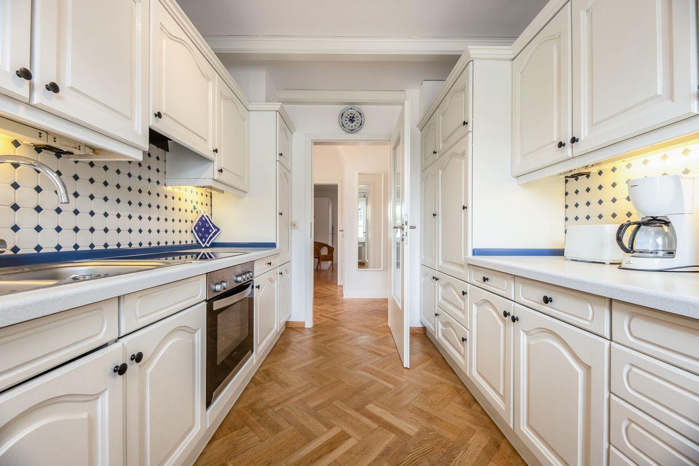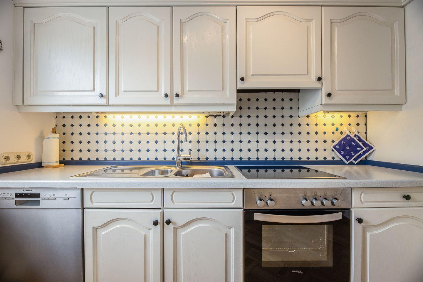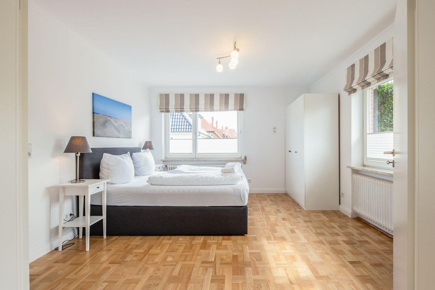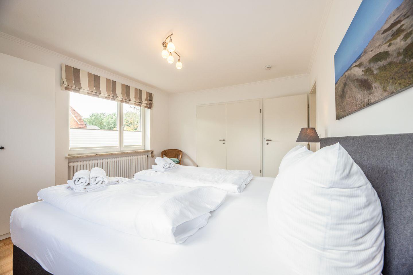 Weiße Wände, dazu helle Naturmaterialien – eine Kombi, die die gesamte Wohnung ruhig und einladend wirken lässt. Angefangen bei dem geräumigen Wohnzimmer in dem bequem eine Couch, ein Sessel sowie ein Esstisch ihren Platz finden. Eine große Fensterfont schenkt dazu schöne Aussichten auf die Terrasse und den blumigen Garten. Die Küche zitiert den modernen Friesen-Stil mit blau-weißen Fliesenwänden und muss sich auch in puncto Ausstattung nicht verstecken. Ein Schlafzimmer grenzt - verbunden durch eine Schiebetür - direkt an das Wohnzimmer an; das andere Schlafzimmer verfügt über ein Duschbad en Suite. Darüber hinaus gibt es noch ein weiteres großes Duschbad mit einer herrlichen Regendusche.