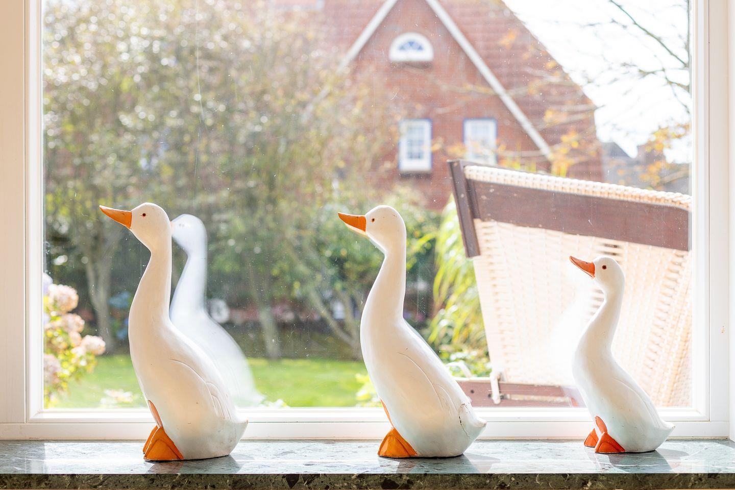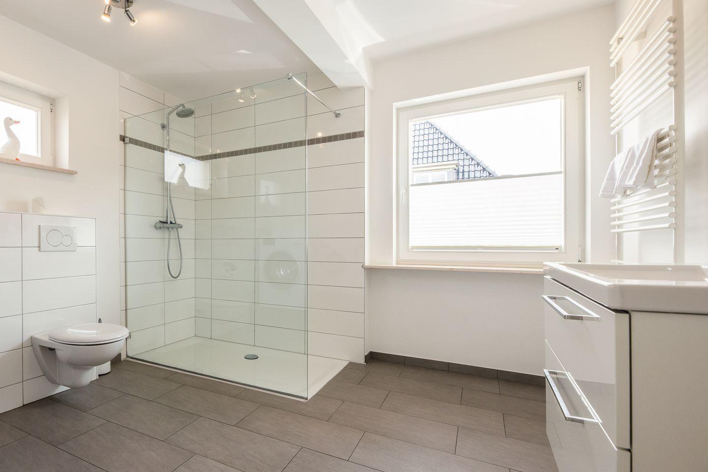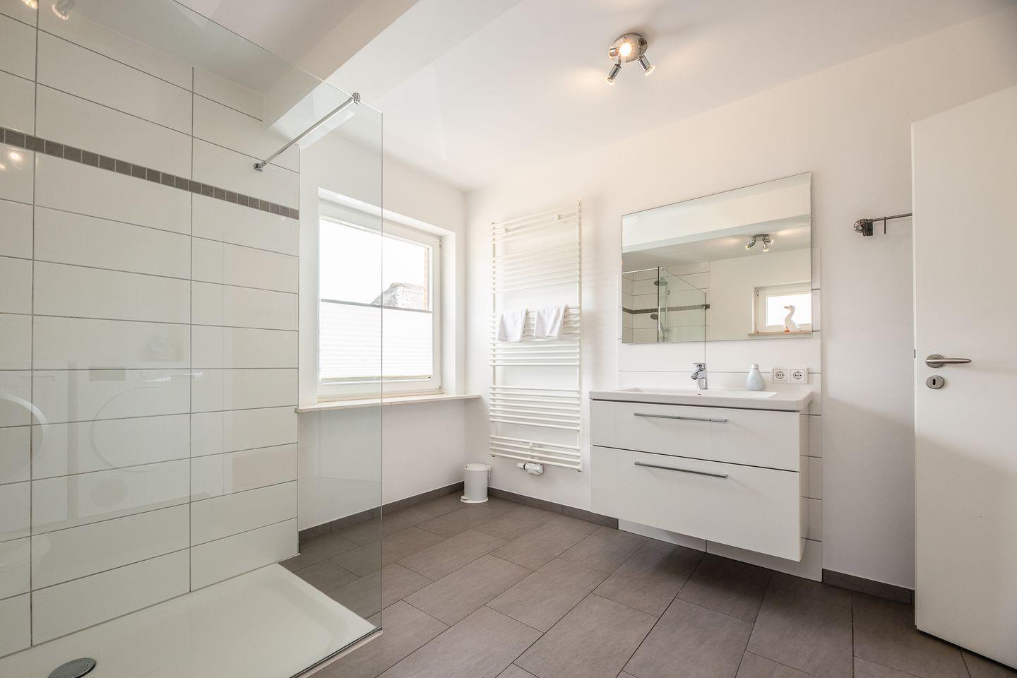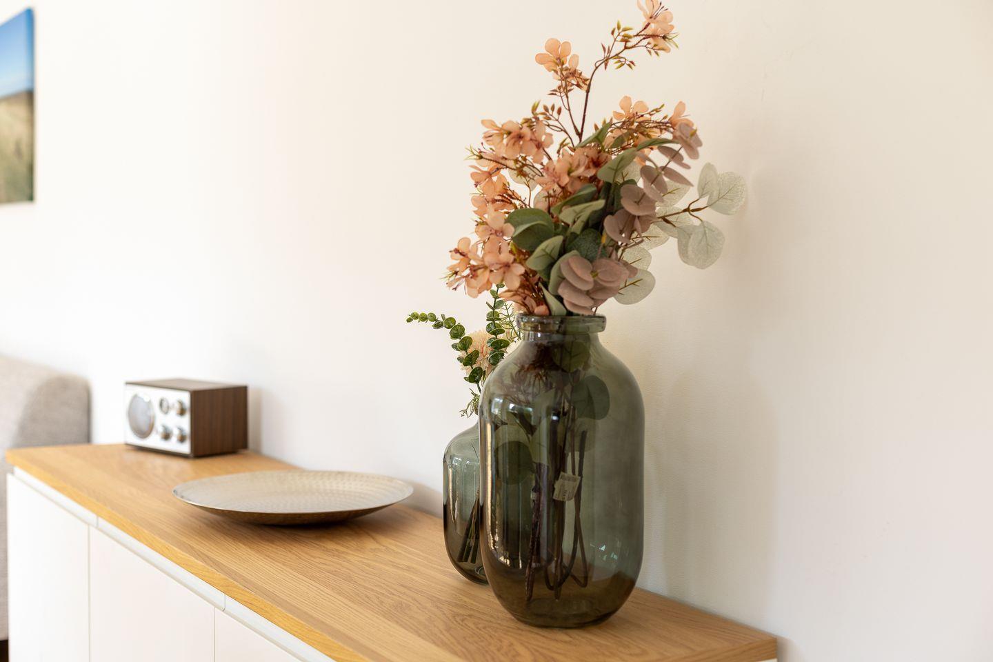 Weiße Wände, dazu helle Naturmaterialien – eine Kombi, die die gesamte Wohnung ruhig und einladend wirken lässt. Angefangen bei dem geräumigen Wohnzimmer in dem bequem eine Couch, ein Sessel sowie ein Esstisch ihren Platz finden. Eine große Fensterfont schenkt dazu schöne Aussichten auf die Terrasse und den blumigen Garten. Die Küche zitiert den modernen Friesen-Stil mit blau-weißen Fliesenwänden und muss sich auch in puncto Ausstattung nicht verstecken. Ein Schlafzimmer grenzt - verbunden durch eine Schiebetür - direkt an das Wohnzimmer an; das andere Schlafzimmer verfügt über ein Duschbad en Suite. Darüber hinaus gibt es noch ein weiteres großes Duschbad mit einer herrlichen Regendusche.