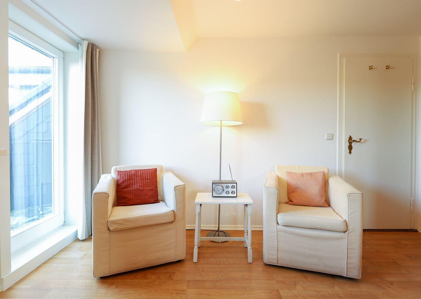 Diese muggelige Komfortzone ist der beste Beweis dafür, dass schlafen, ausspannen, kochen und essen auch in nur einem Raum ganz wunderbar funktionieren. Das komfortable Doppelbett, zwei Sessel, der Esstisch sowie die kleine Küchenzeile bilden eine harmonische Einheit, die nichts vermissen lässt. Bei schönem Wetter bietet der geräumige Nordbalkon eine prima Alternative, um den Tag beginnen oder ausklingen zu lassen.
