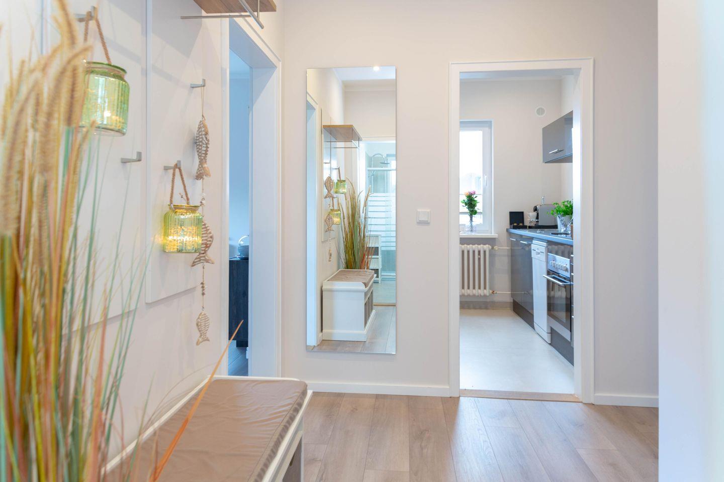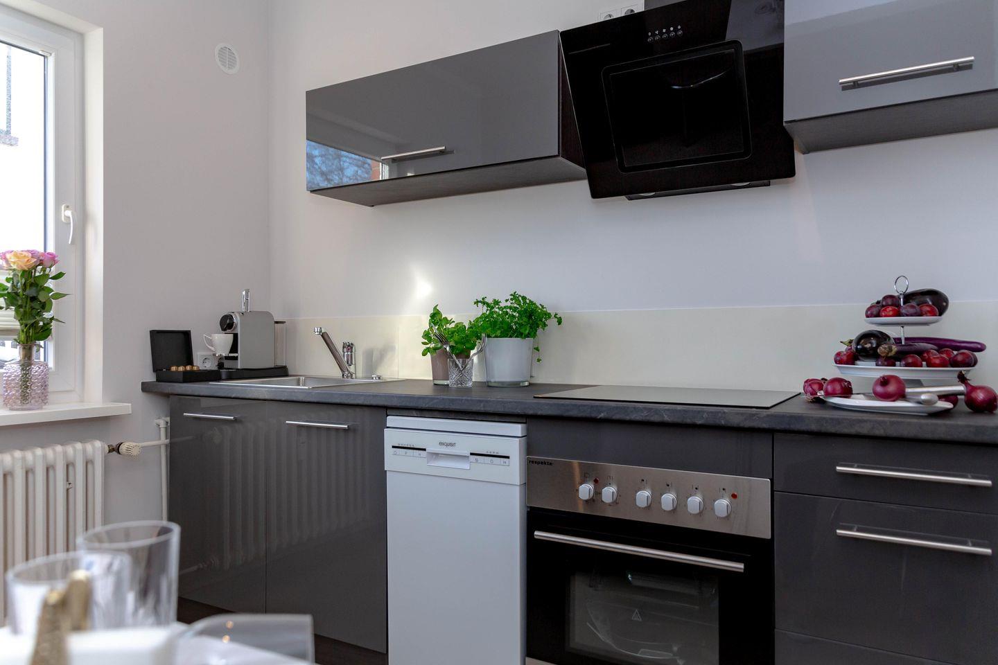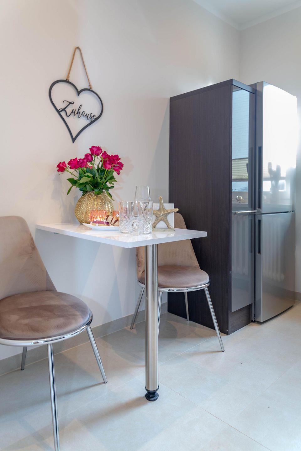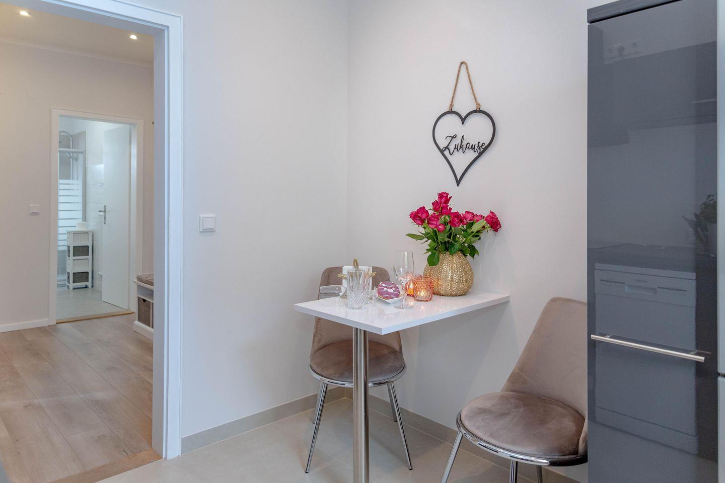 Die Wohnung begeistert mit ihrem stilvollen, lichtdurchfluteten Wohnbereich, der mit gemütlichen Möbeln zum Entspannen einlädt. Die separate, hochwertige Küche bietet Ihnen alles, was Sie für eine entspannte Selbstversorgung während Ihres Urlaubs benötigen.