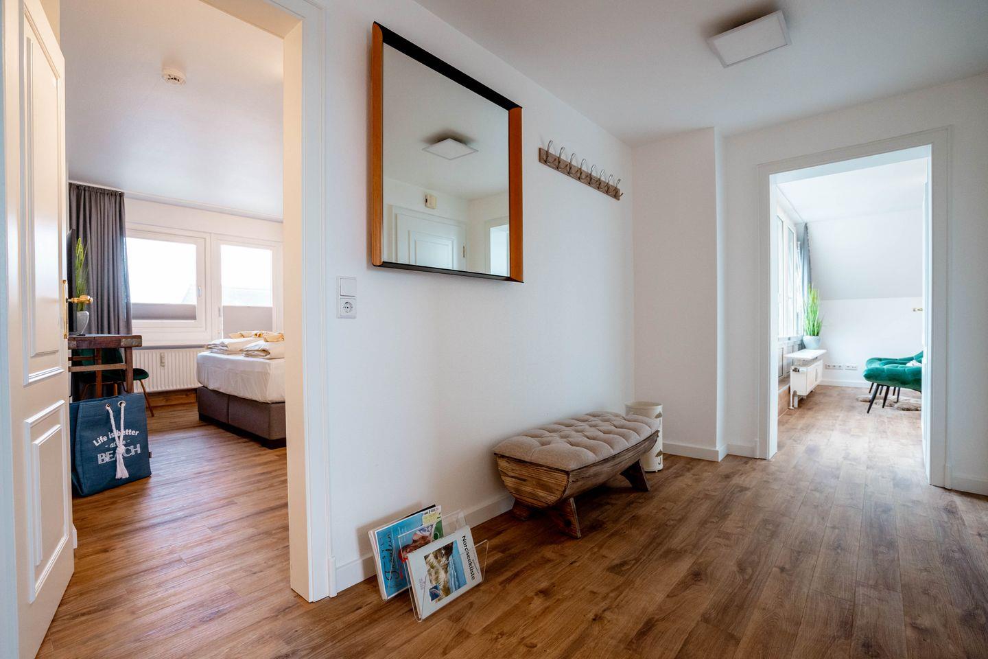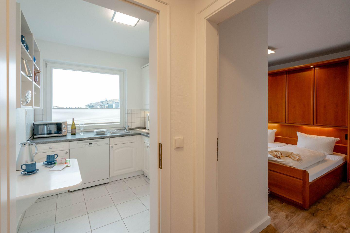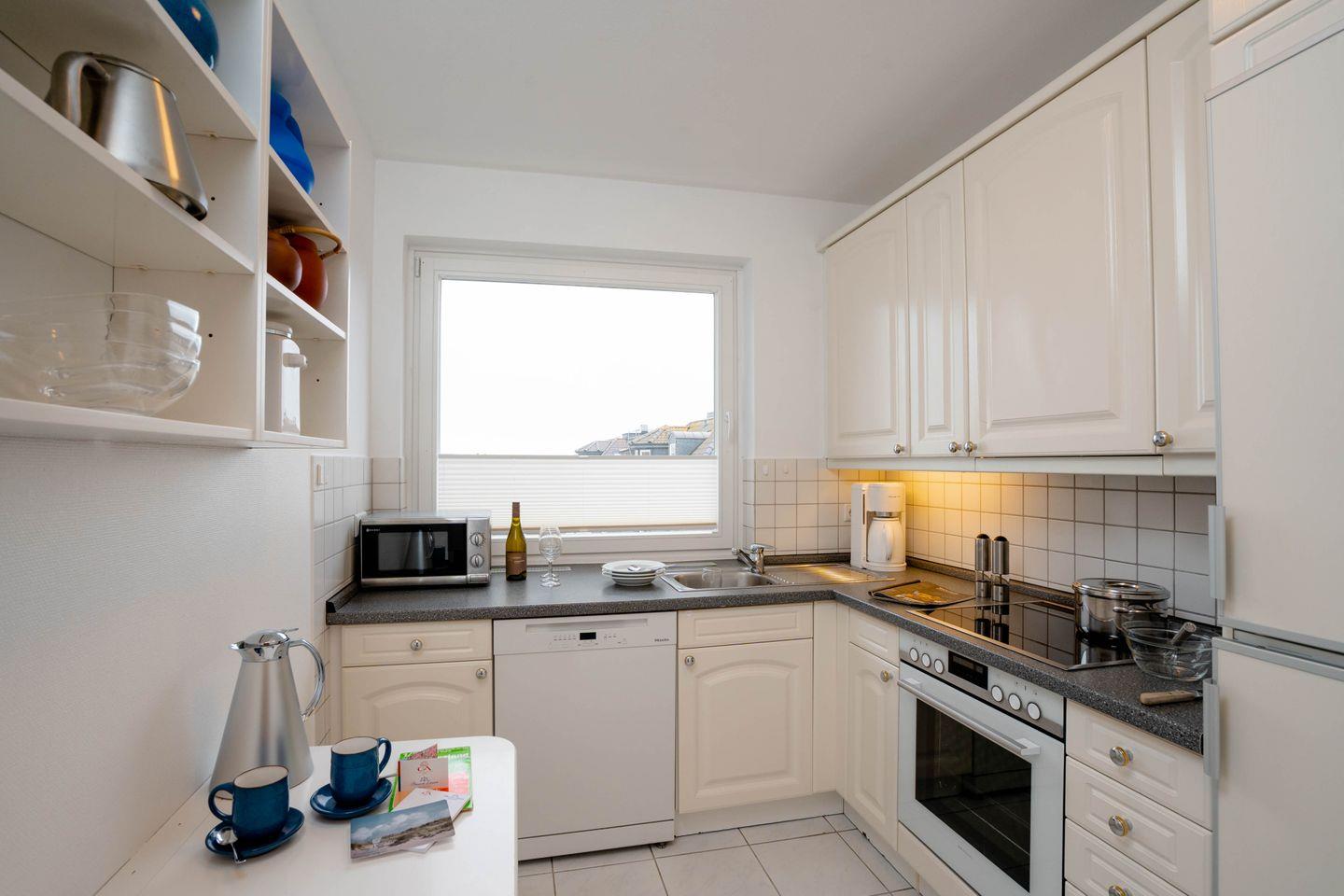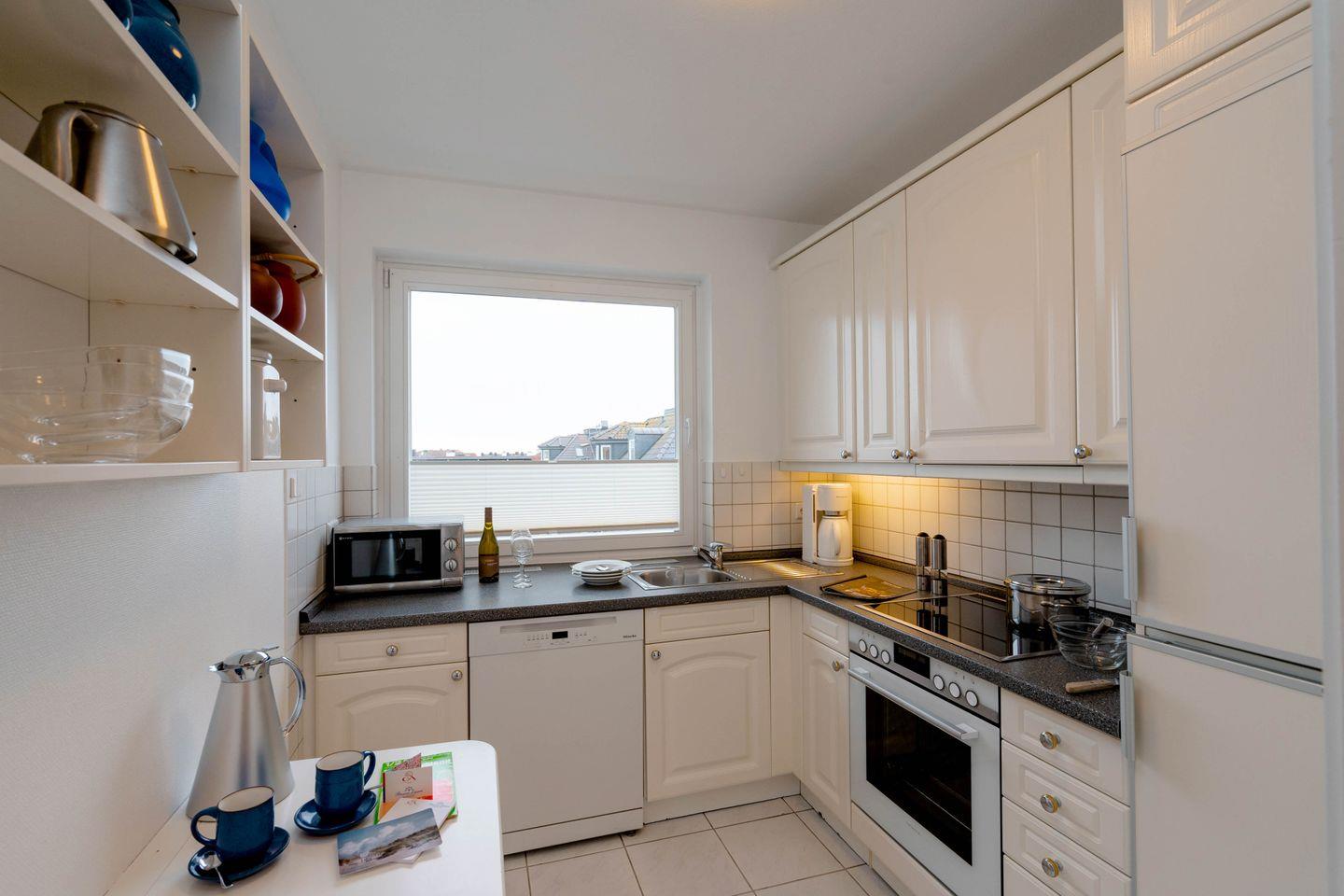 Die separate Küche, ganz in Weiß, ist gut ausgestattet, von der Spülmaschine bis zur Mikrowelle fehlt es an nichts, das Bad glänzt – ebenfalls in Weiß ¬– sogar mit einer Wanne. Waschmaschine und Trockner stehen im Haus zur gemeinschaftlichen Nutzung parat. Die Einrichtung der Ferienwohnung ist hell und freundlich, Meerblau setzt frische Akzente. Die Lage? Perfekt, denn hier oben herrscht Ruhe, die lebendigen Fußgängerzonen der Inselhauptstadt, der Supermarkt, Kneipe, Boutiquen und Restaurants sind genauso nah, wie der Brandenburger Strand, alles ist nur einen Mini-Fußmarsch entfernt.