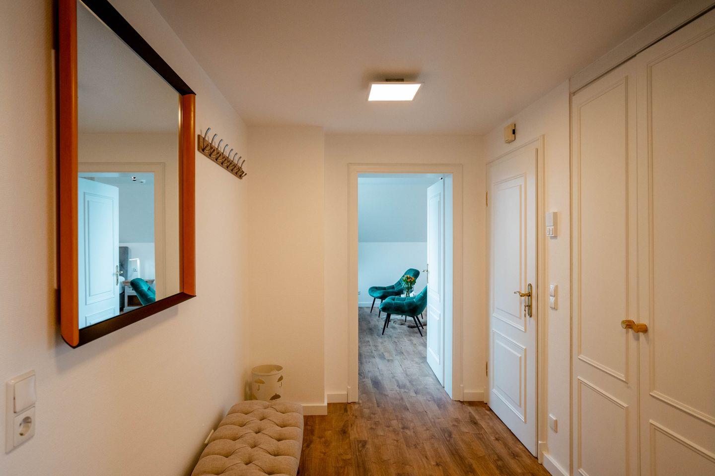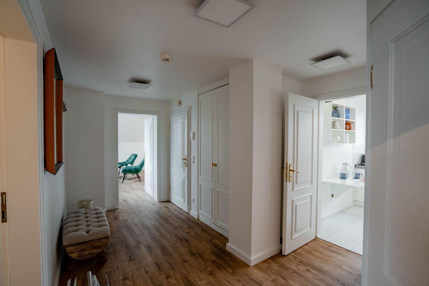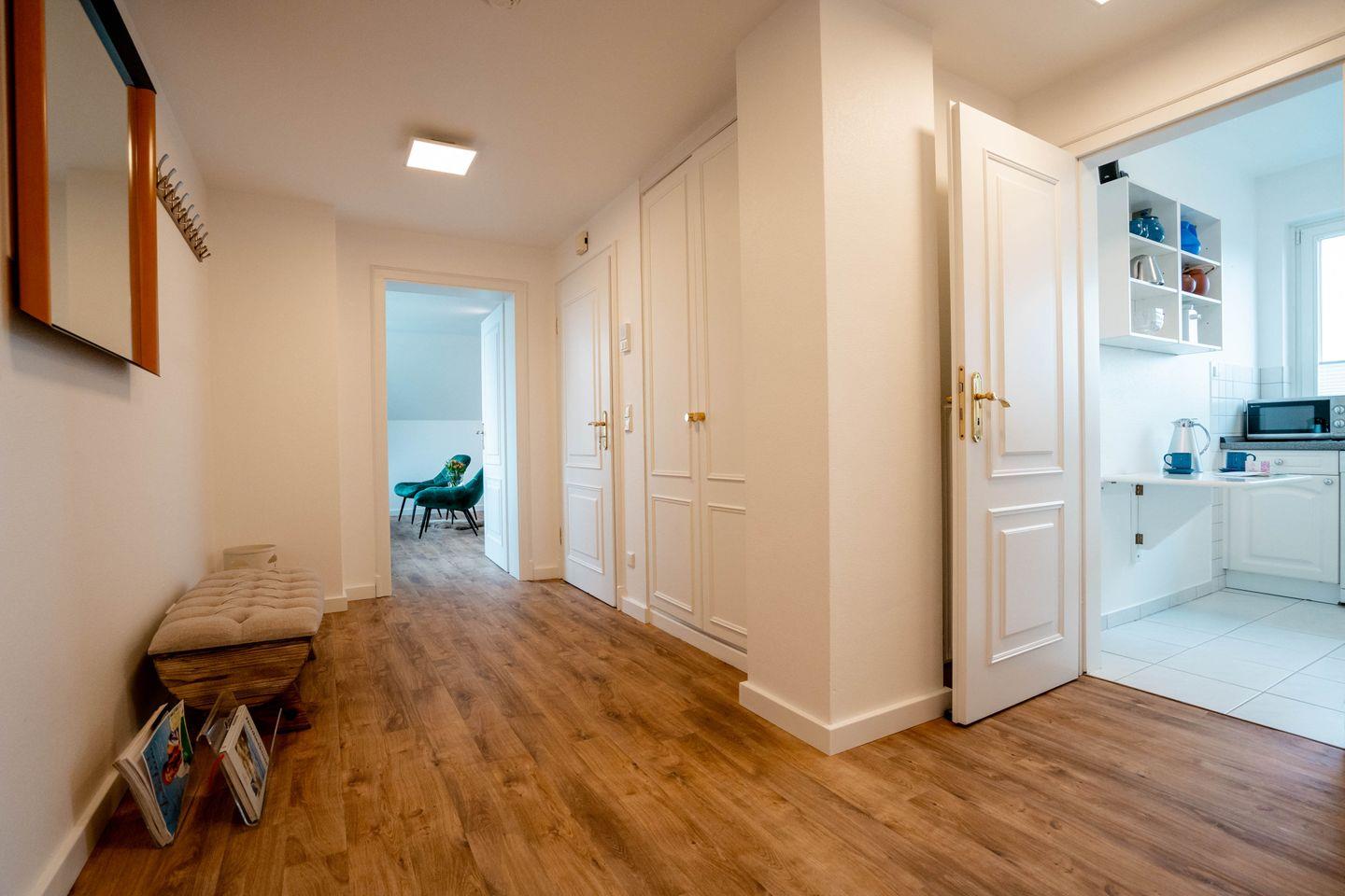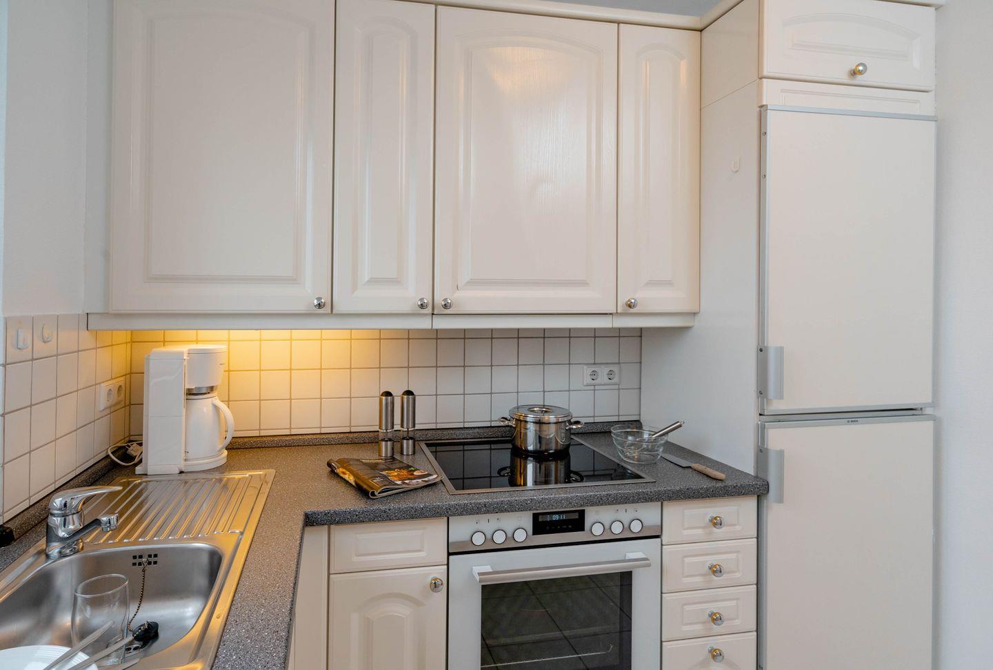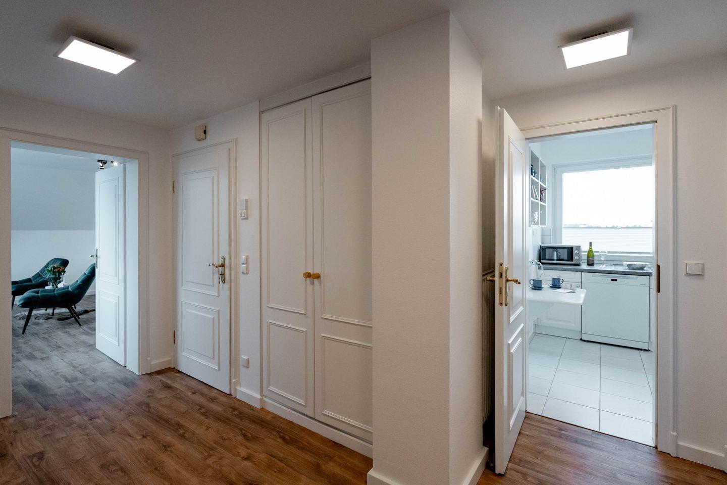 Die separate Küche, ganz in Weiß, ist gut ausgestattet, von der Spülmaschine bis zur Mikrowelle fehlt es an nichts, das Bad glänzt – ebenfalls in Weiß ¬– sogar mit einer Wanne. Waschmaschine und Trockner stehen im Haus zur gemeinschaftlichen Nutzung parat. Die Einrichtung der Ferienwohnung ist hell und freundlich, Meerblau setzt frische Akzente. Die Lage? Perfekt, denn hier oben herrscht Ruhe, die lebendigen Fußgängerzonen der Inselhauptstadt, der Supermarkt, Kneipe, Boutiquen und Restaurants sind genauso nah, wie der Brandenburger Strand, alles ist nur einen Mini-Fußmarsch entfernt.