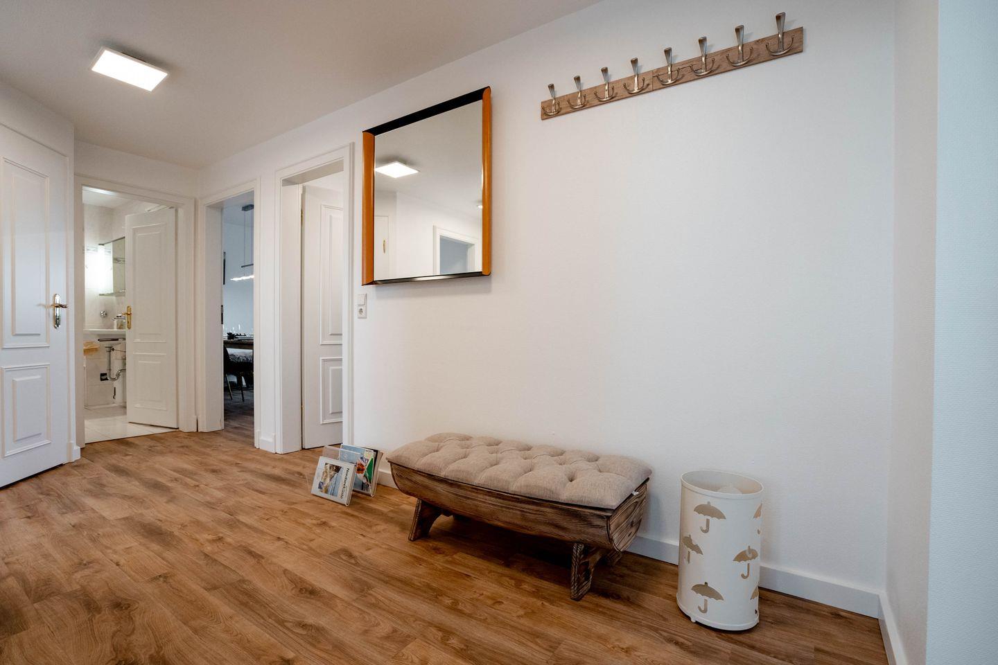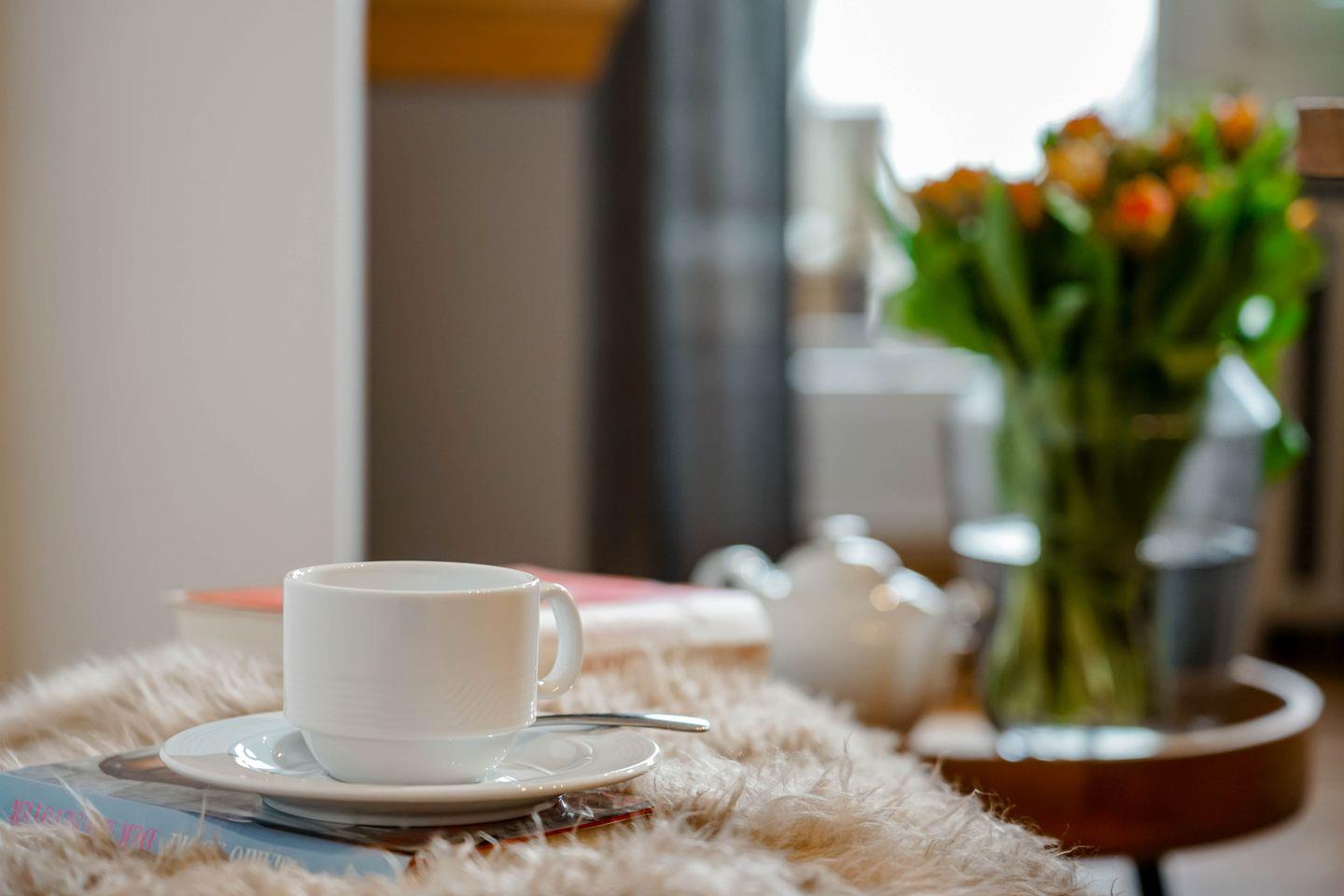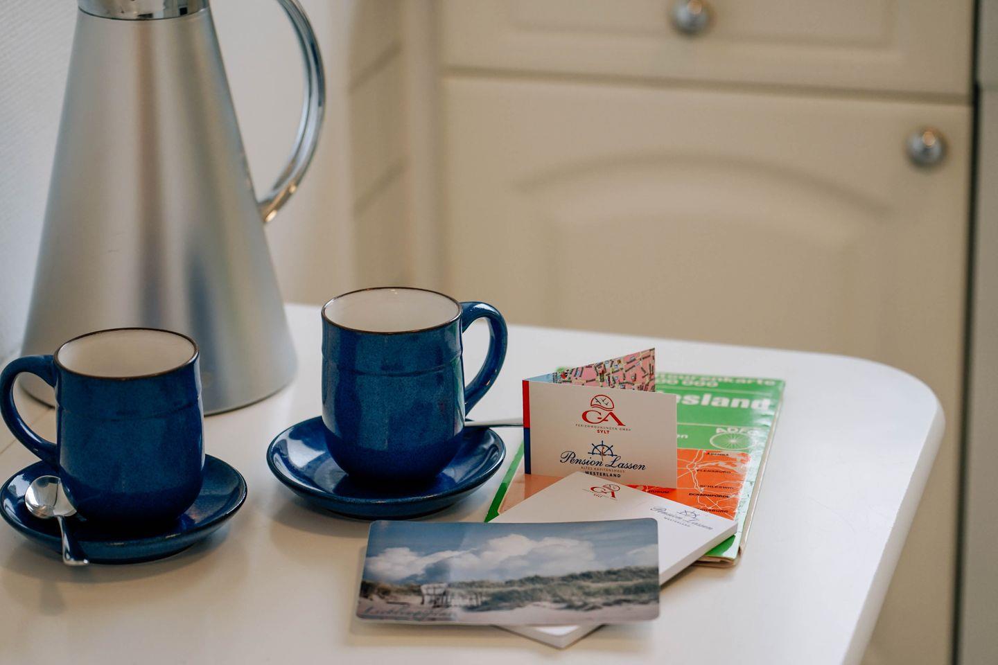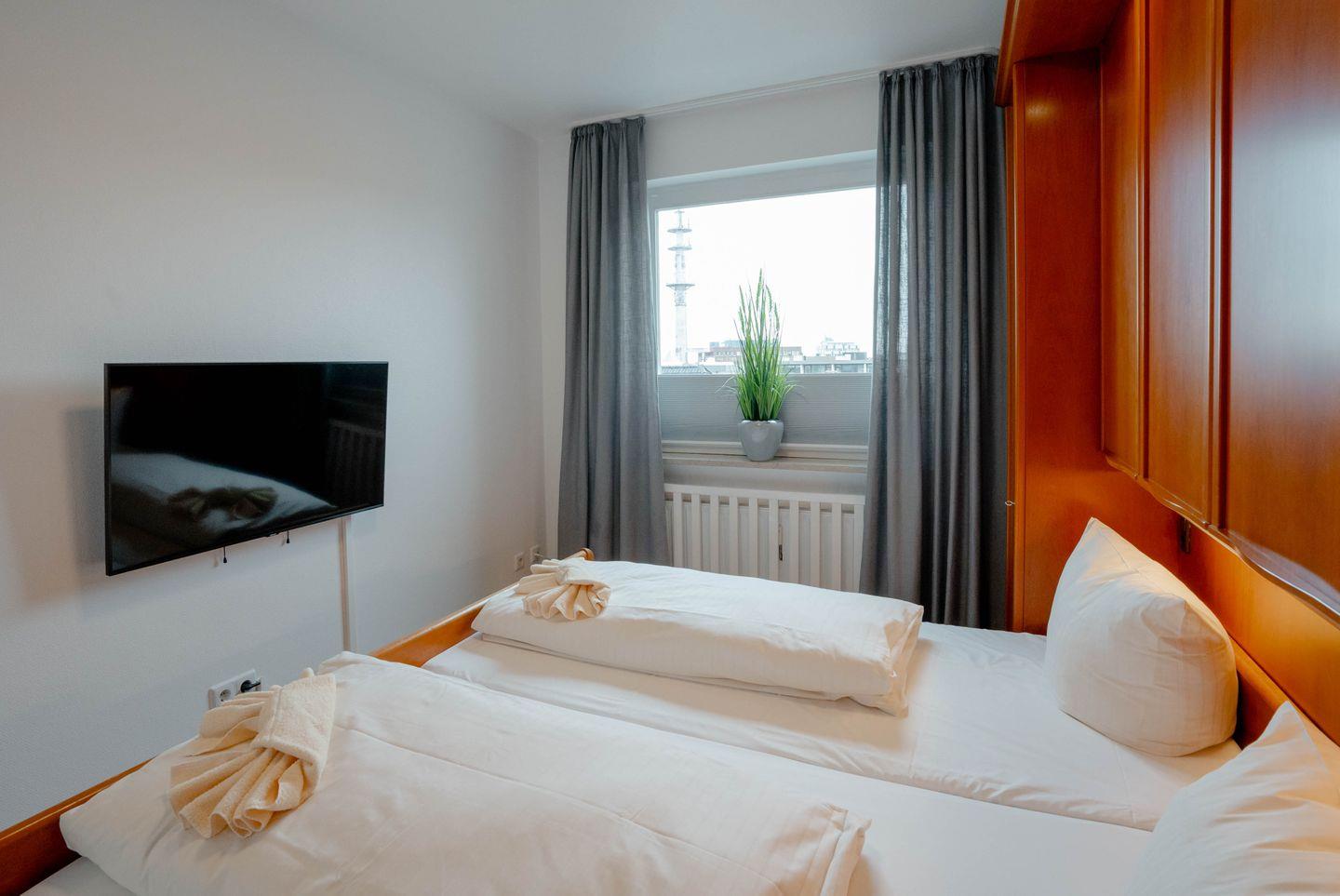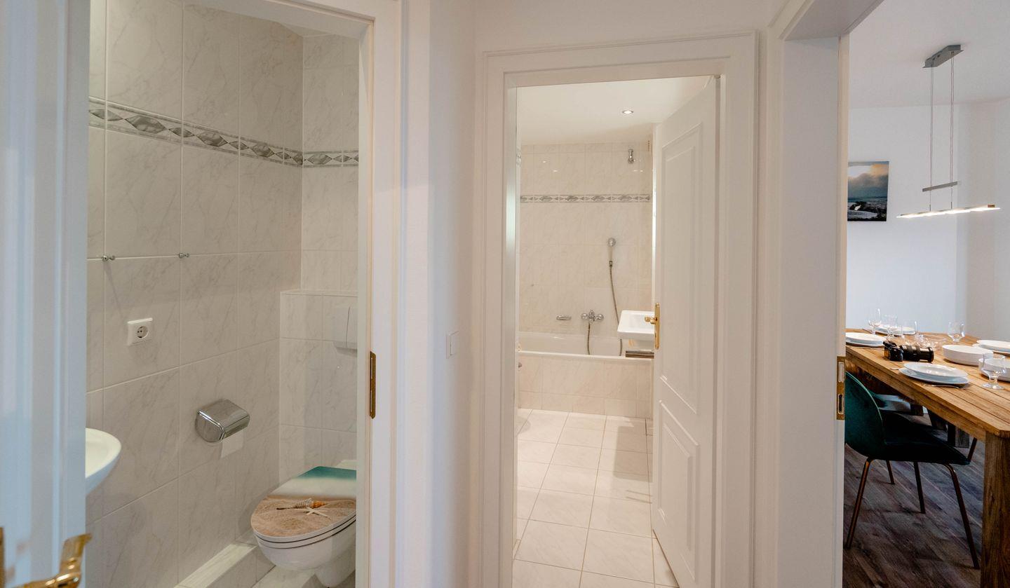 Die separate Küche, ganz in Weiß, ist gut ausgestattet, von der Spülmaschine bis zur Mikrowelle fehlt es an nichts, das Bad glänzt – ebenfalls in Weiß ¬– sogar mit einer Wanne. Waschmaschine und Trockner stehen im Haus zur gemeinschaftlichen Nutzung parat. Die Einrichtung der Ferienwohnung ist hell und freundlich, Meerblau setzt frische Akzente. Die Lage? Perfekt, denn hier oben herrscht Ruhe, die lebendigen Fußgängerzonen der Inselhauptstadt, der Supermarkt, Kneipe, Boutiquen und Restaurants sind genauso nah, wie der Brandenburger Strand, alles ist nur einen Mini-Fußmarsch entfernt.
