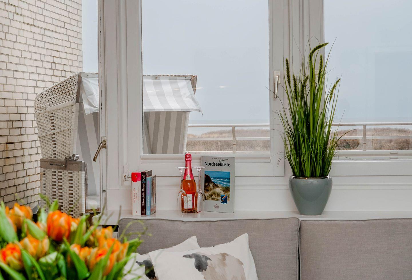 Moin und ein herzliches Willkommen in diesem „Penthouse mit Meerblick“. Das großzügige Ferien-Appartement mit dem Blick auf die Westerländer Dünen und das Meer ist für die Insel wirklich außergewöhnliche 120 Quadratmeter groß und hat drei Doppel-Schlafzimmer zu bieten. Es ist für bis zu sechs Personen optimal, bequem mit dem Fahrstuhl zu erreichen und hat selbstverständlich auch eine Balkonterrasse mit Strandkorb.