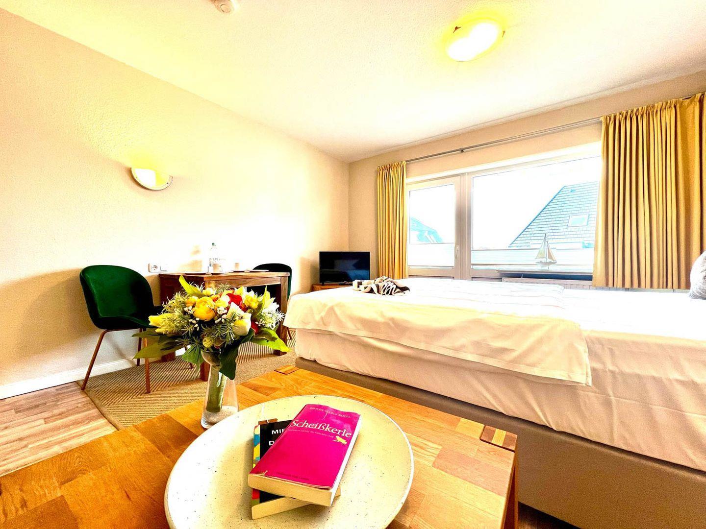 Moin und herzlich willkommen in der Ferienwohnung „Mare Nostrum 6“. Diese gemütliche Ein-Zimmer-Ferienwohnung ist Zuhause im ersten Obergeschoss eines überschaubaren Appartementhauses in unmittelbarer Strandnähe, hinter den Dünen von Westerland. Sie hat für zwei mit 36 Quadratmetern die perfekte Größe. Die offene Wohnküche (Farbton „Vanille“) ist gut ausgestattet, ein eigener Balkon, ein Parkplatz extra für Sie in der Tiefgarage und Waschmaschine/Trockner zur Gemeinschaftsnutzung stehen ebenfalls zur Verfügung. Der Clou an dem Appartementhaus, in dem Sie hier wohnen, ist seine Lage: Keine zehn Minuten sind es vor hier in die lebendige Innenstadt mit allen Einkaufsmöglichkeiten, urigen Kneipen und attraktiven Restaurants. Und wer gerne vorm Frühstück im Meer schwimmt, kann theoretisch in der Badehose „eben rüber laufen“ zum Strand, der ist nämlich keine zwei Minuten weit weg.