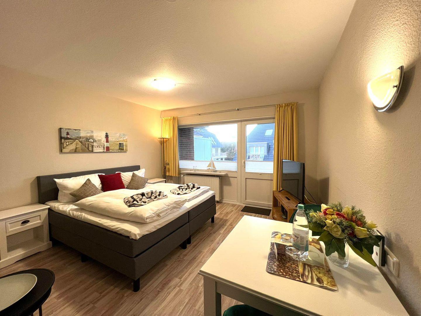 Moin und herzlich willkommen in der Ferienwohnung „Mare Nostrum 7“. Diese gemütliche Ein-Zimmer-Ferienwohnung ist Zuhause im ersten Obergeschoss eines überschaubaren Appartementhauses in unmittelbarer Strandnähe, hinter den Dünen von Westerland. Sie hat für zwei mit 36 Quadratmetern die perfekte Größe. Die offene Wohnküche (Farbton „Vanille“) ist gut ausgestattet, der Balkon im Sommer möbliert, ein eigener Parkplatz und Waschmaschine/Trockner zur Gemeinschaftsnutzung stehen ebenfalls zur Verfügung. Der Clou an dem Appartementhaus, in dem Sie hier wohnen, ist seine Lage: Keine zehn Minuten sind es zu Fuß von hier in die lebendige Innenstadt mit allen Einkaufsmöglichkeiten, urigen Kneipen und attraktiven Restaurants.
