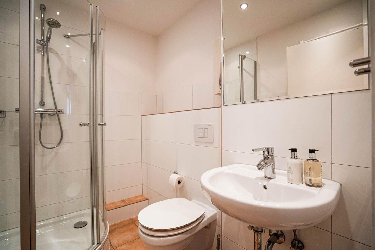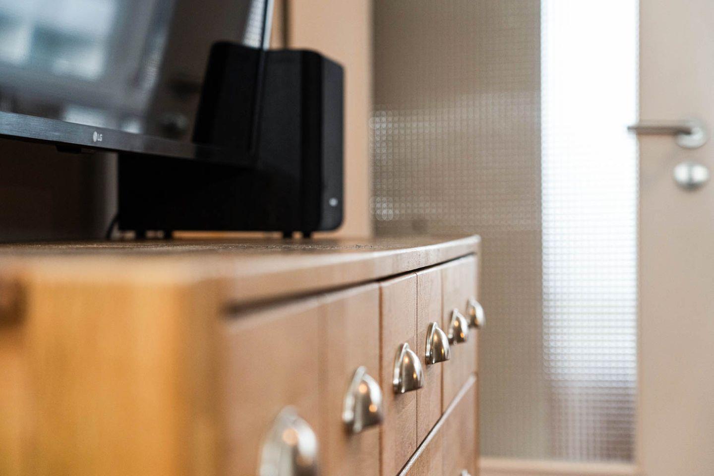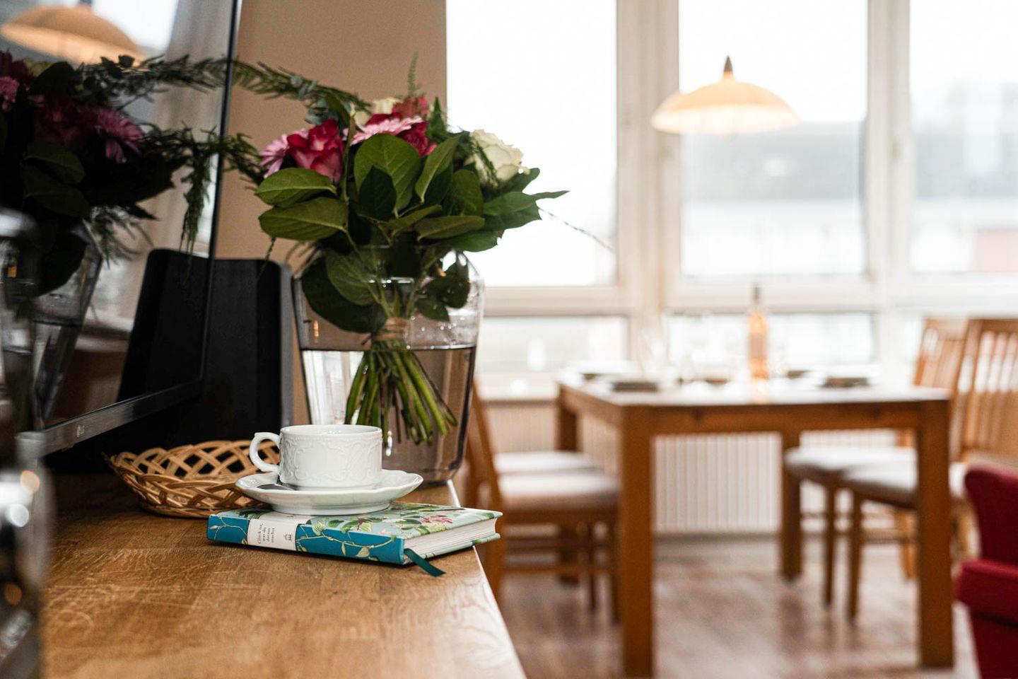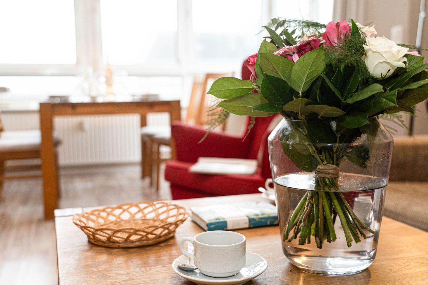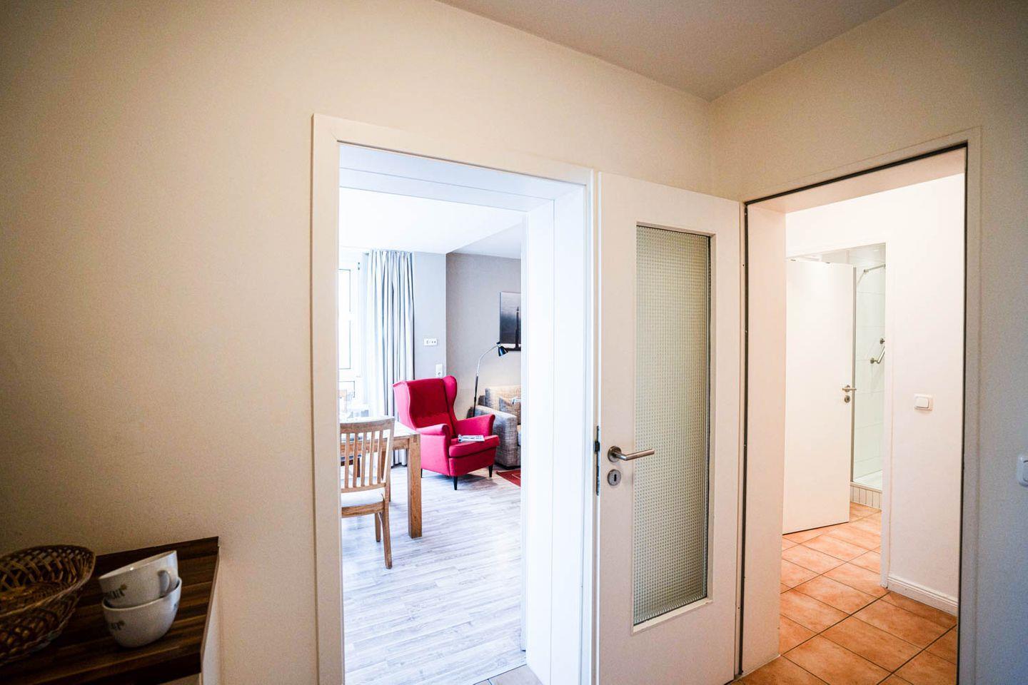 Die Ferien-Wohnung ist liebevoll in aktuellem Greige mit roten Farbtupfern eingerichtet und über das Standardmaß hinaus ausgestattet, was Küchenutensilien an geht. Auch steht eine Waschmaschine samt Trockner zur gemeinschaftlichen Nutzung im Appartementhaus parat. Das Haus hat einen Fahrstuhl, die Wohnung liegt im zweiten Stock.